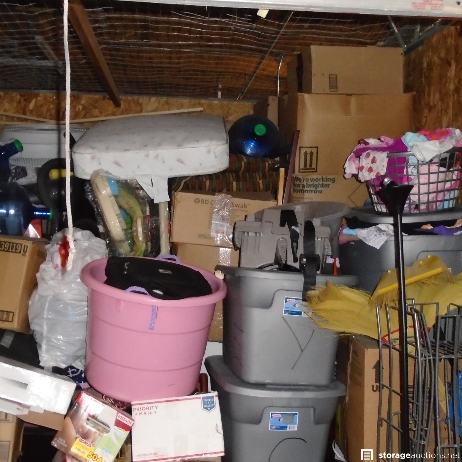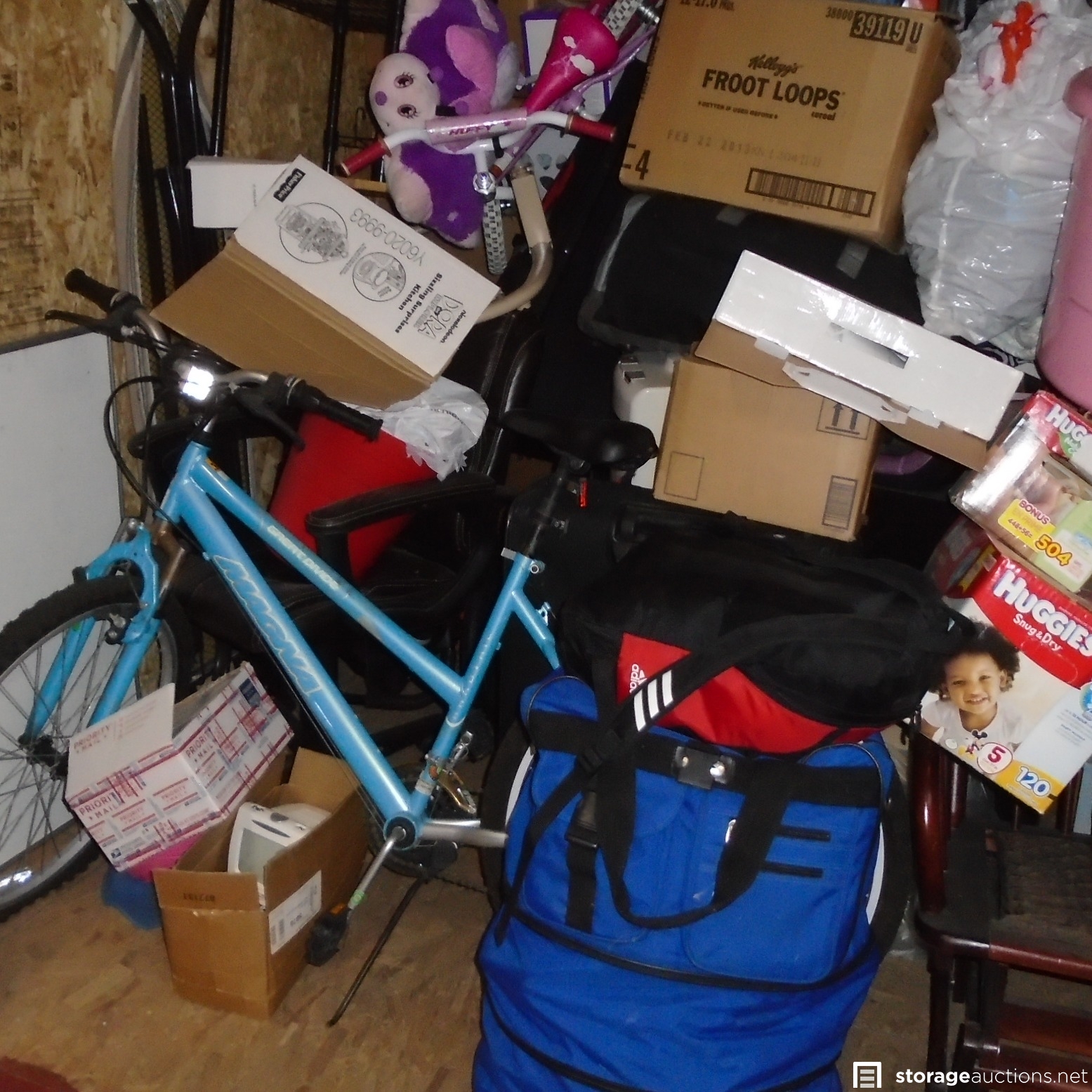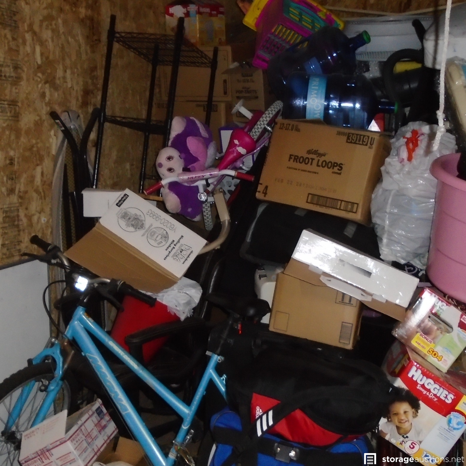 Unit appears to contain bicycles, floor lamp, suitcase, totes, toys, wooden chair glider, clothes, mostly obstructed view