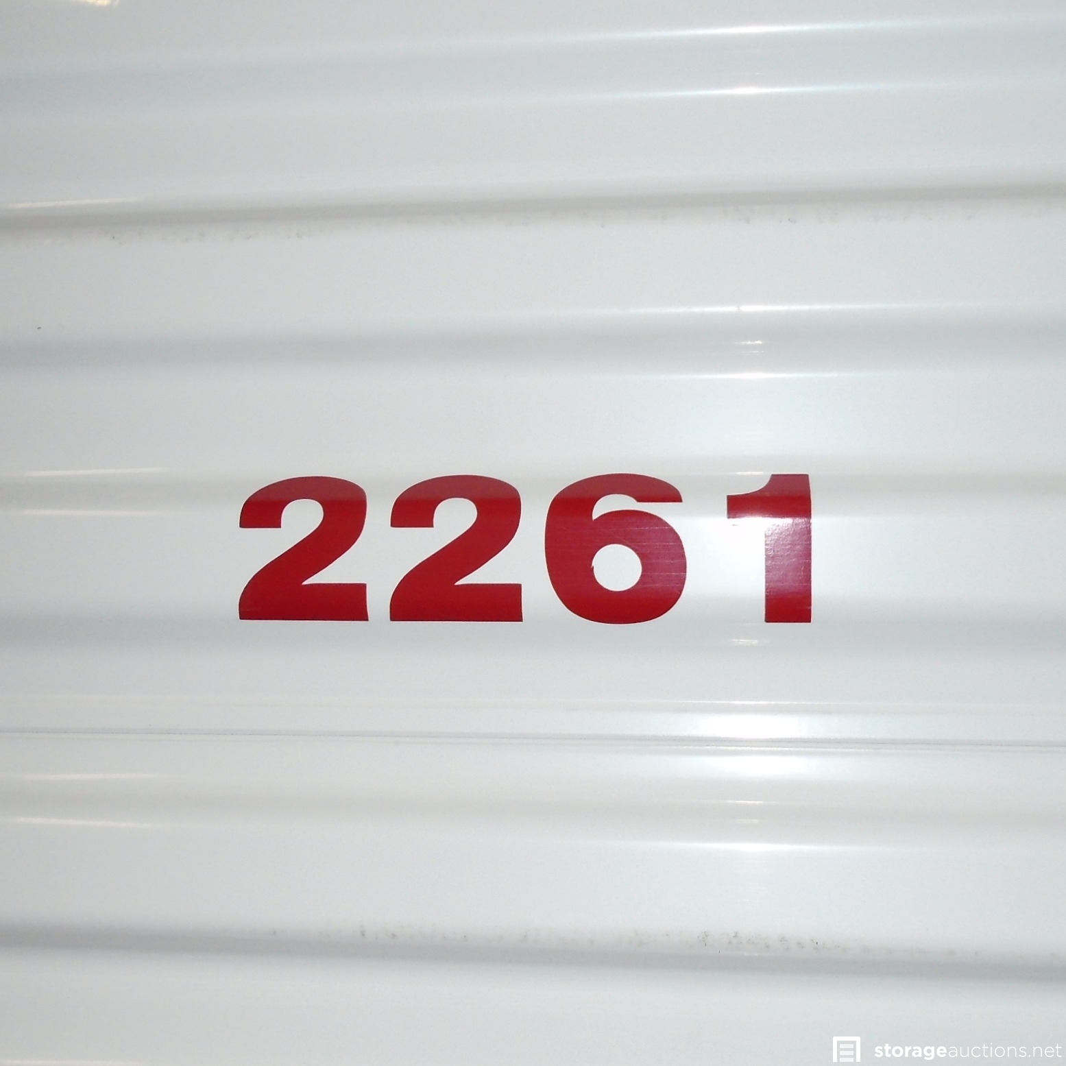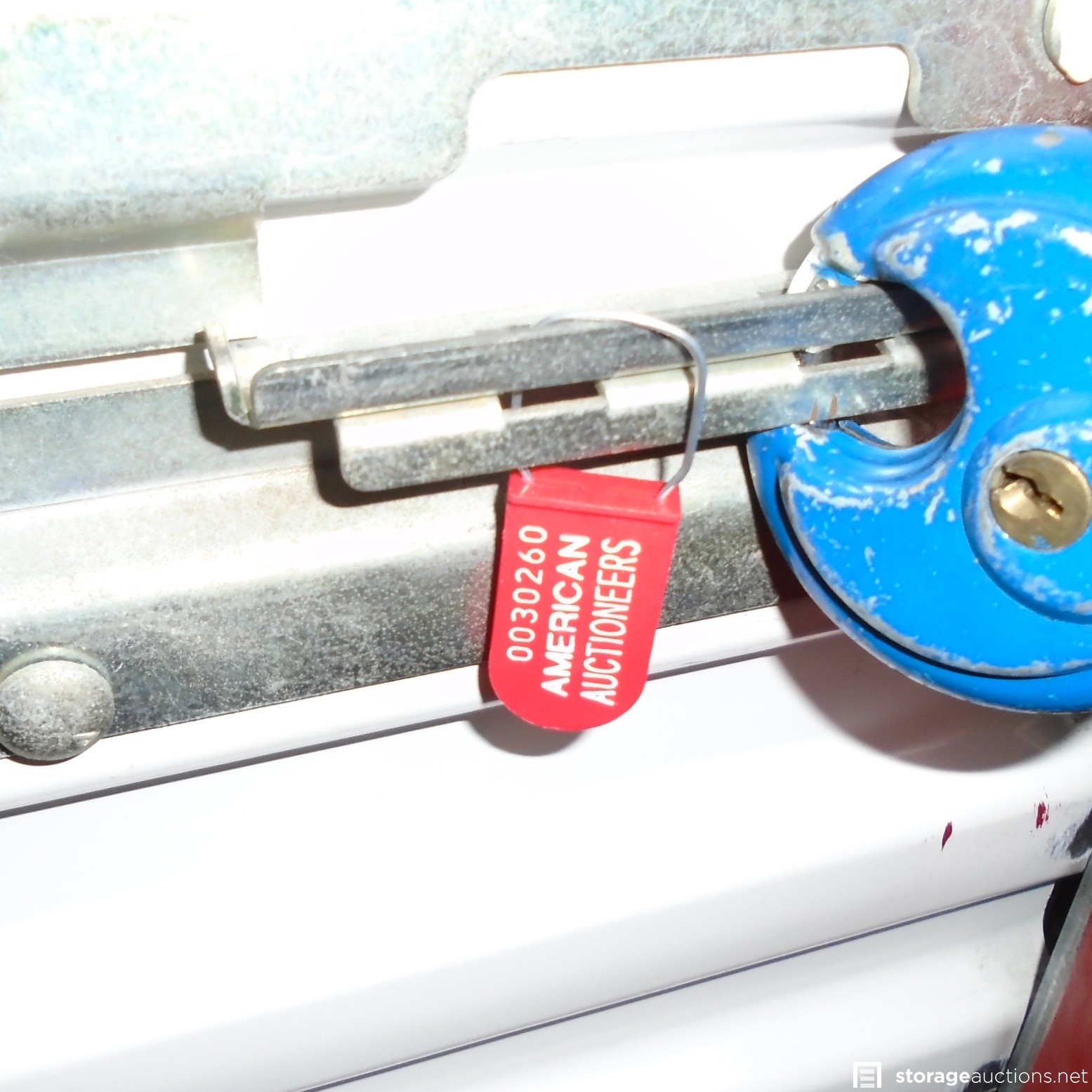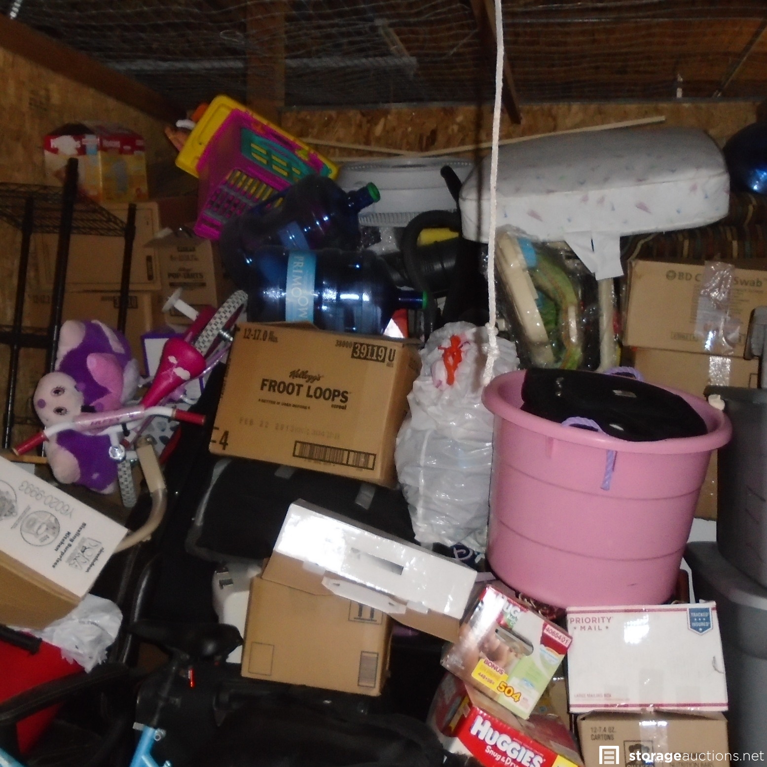 Unit appears to contain bicycles, floor lamp, suitcase, totes, toys, wooden chair glider, clothes, mostly obstructed view