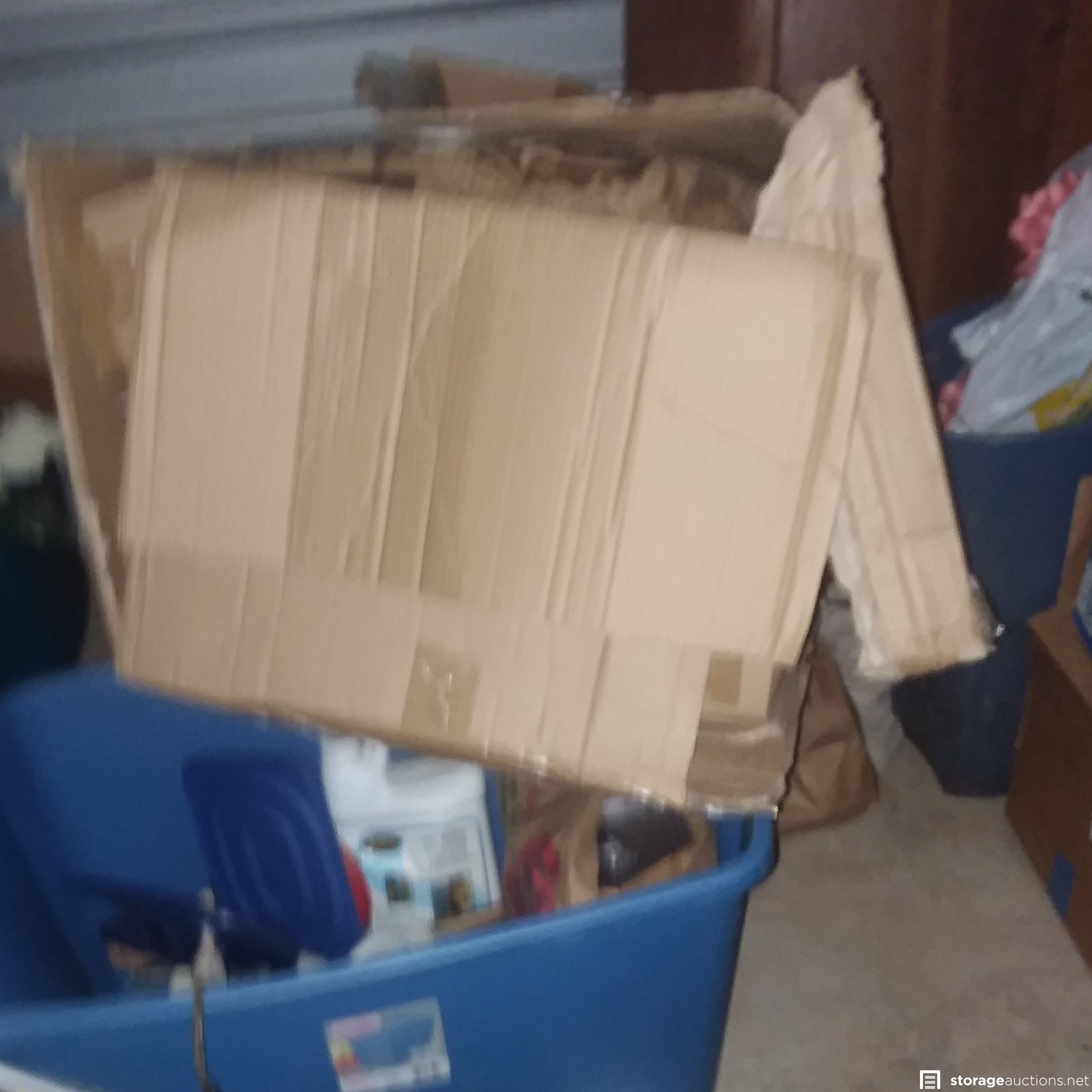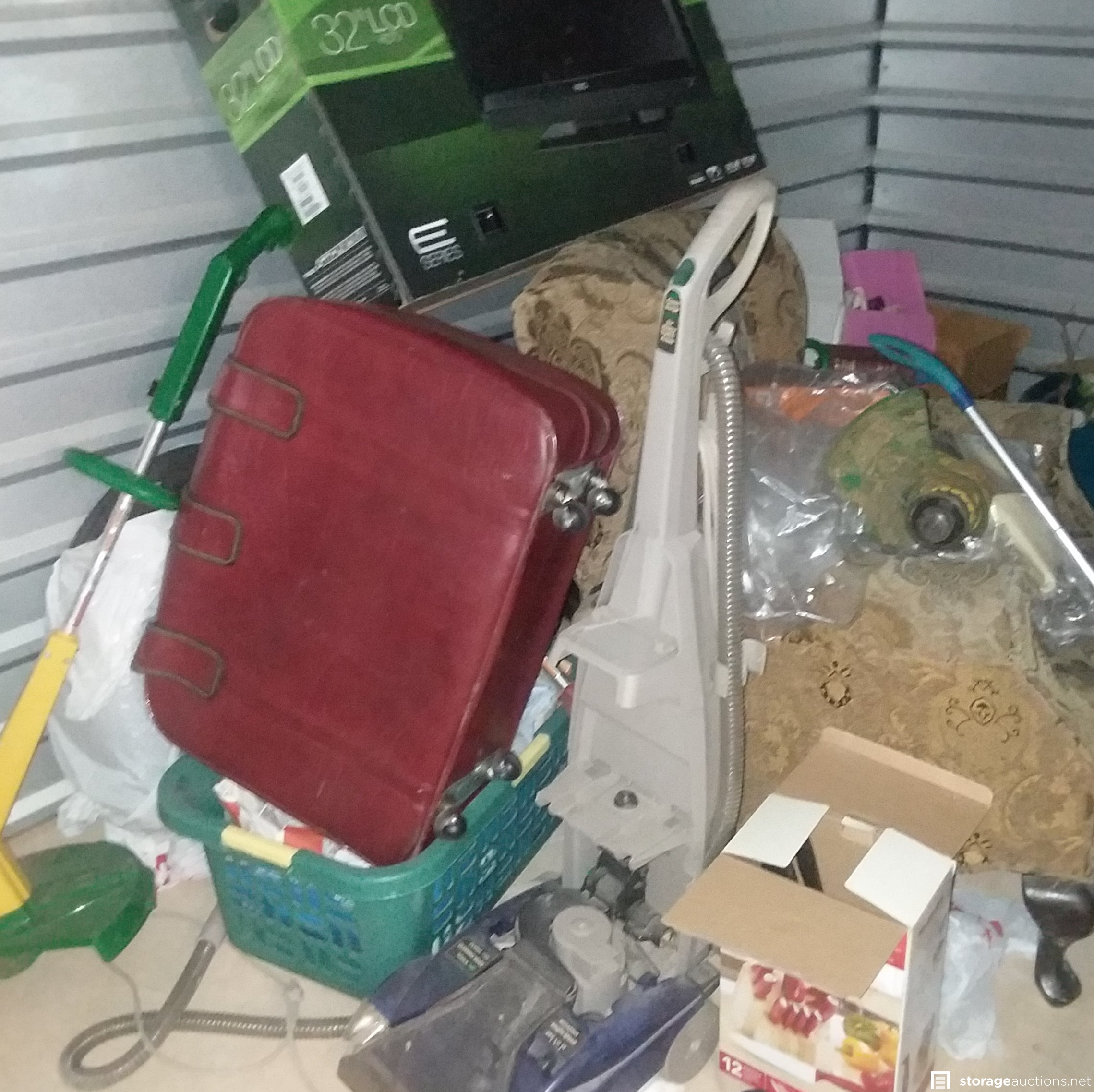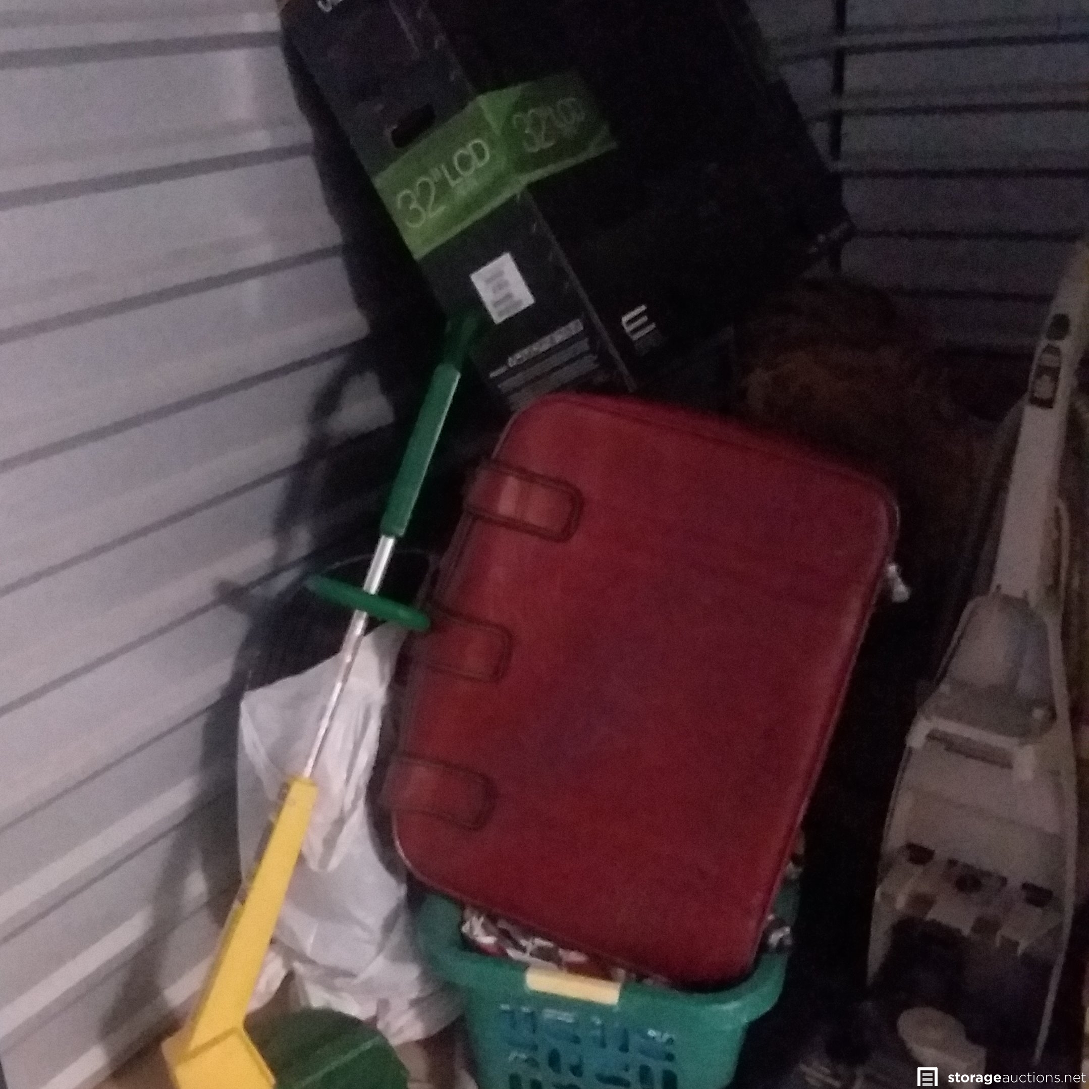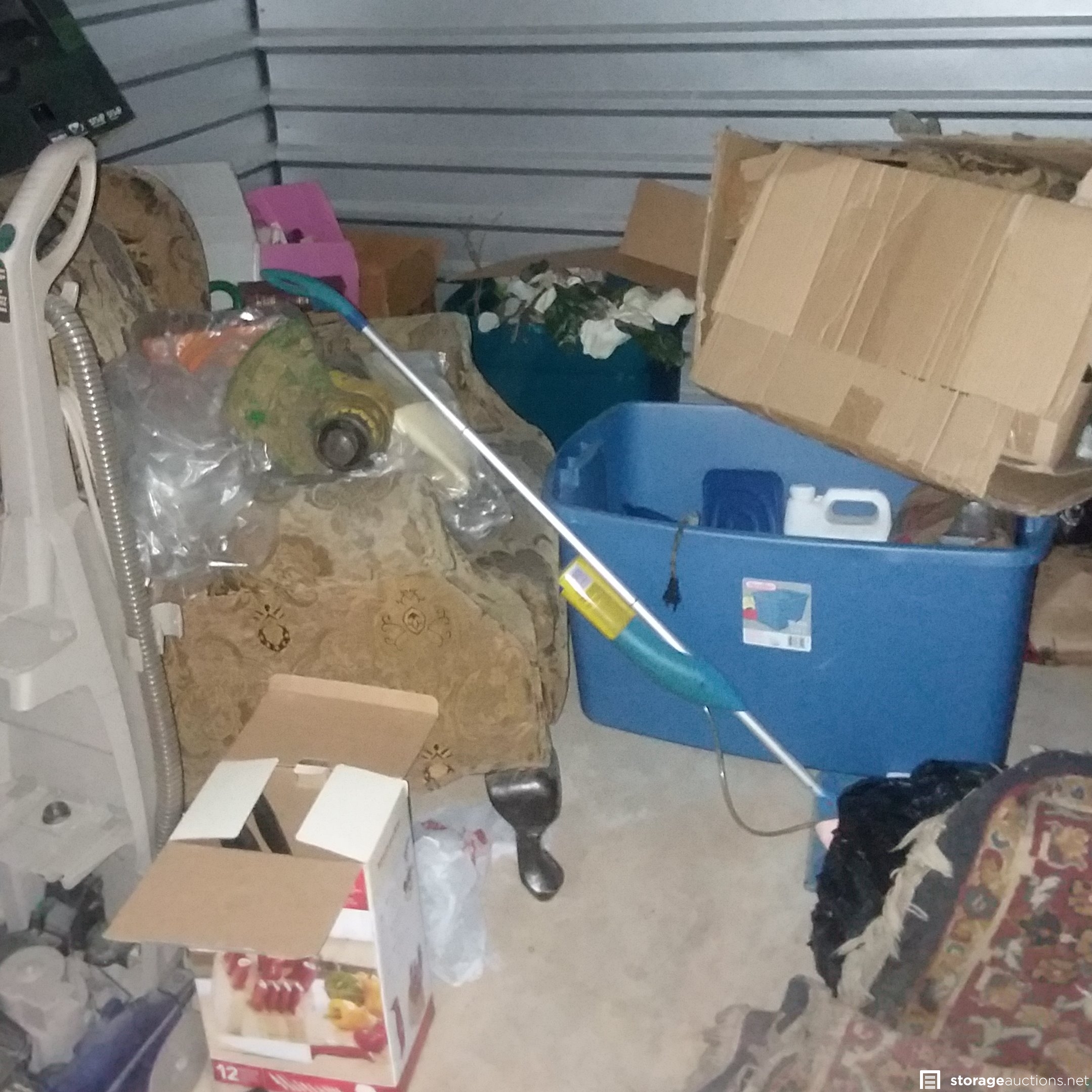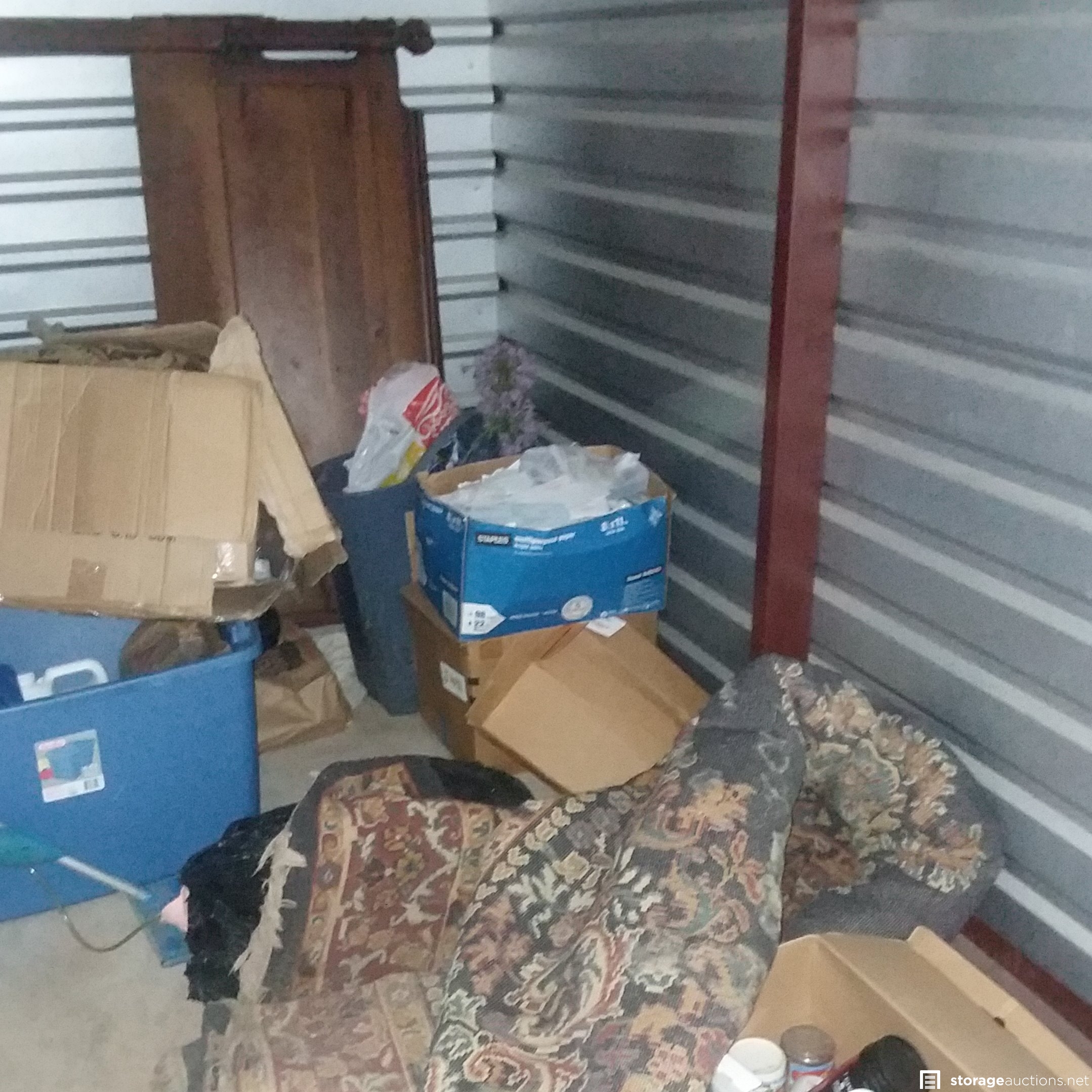 unit appears to contain luggage, weed eaters, Furniture, new furniture in box, headboard, misc items