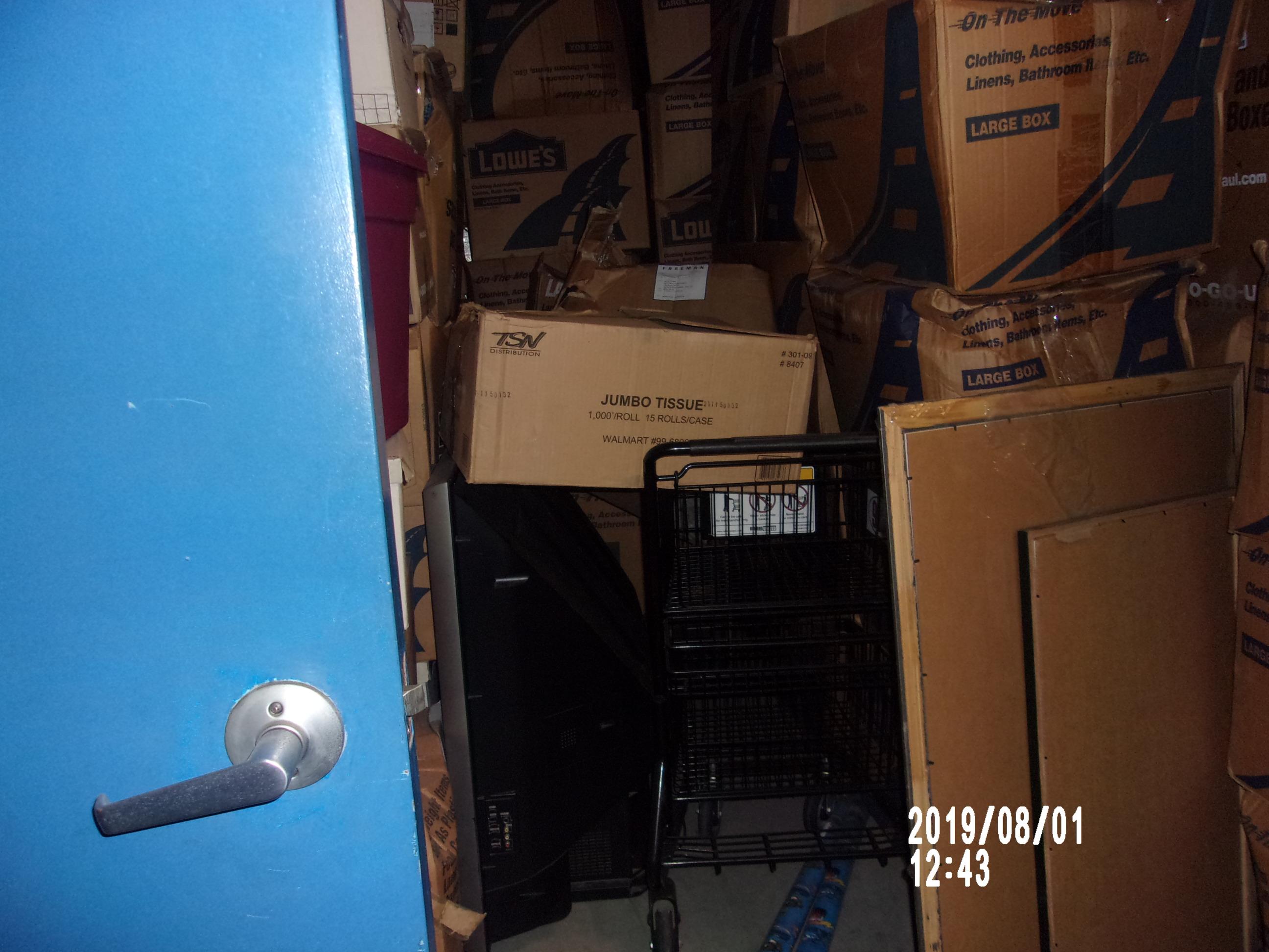TV, Boxes, Shopping cart, Totes, Picture frame.