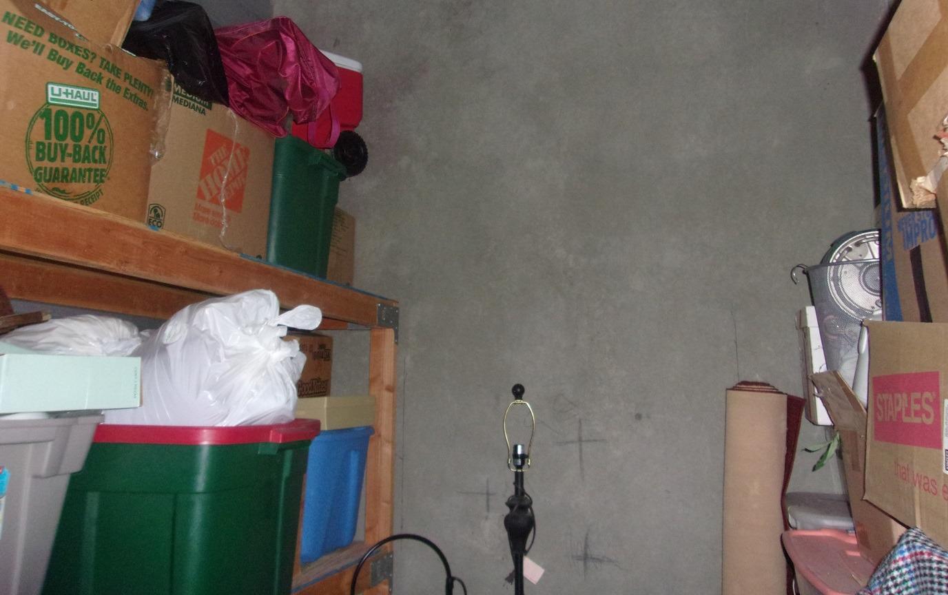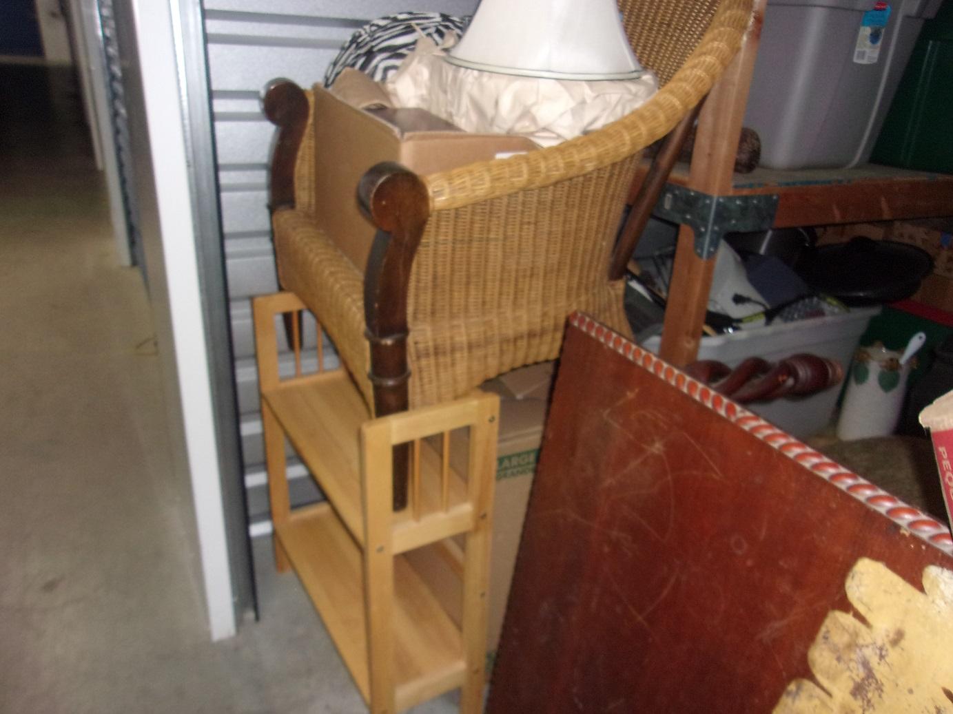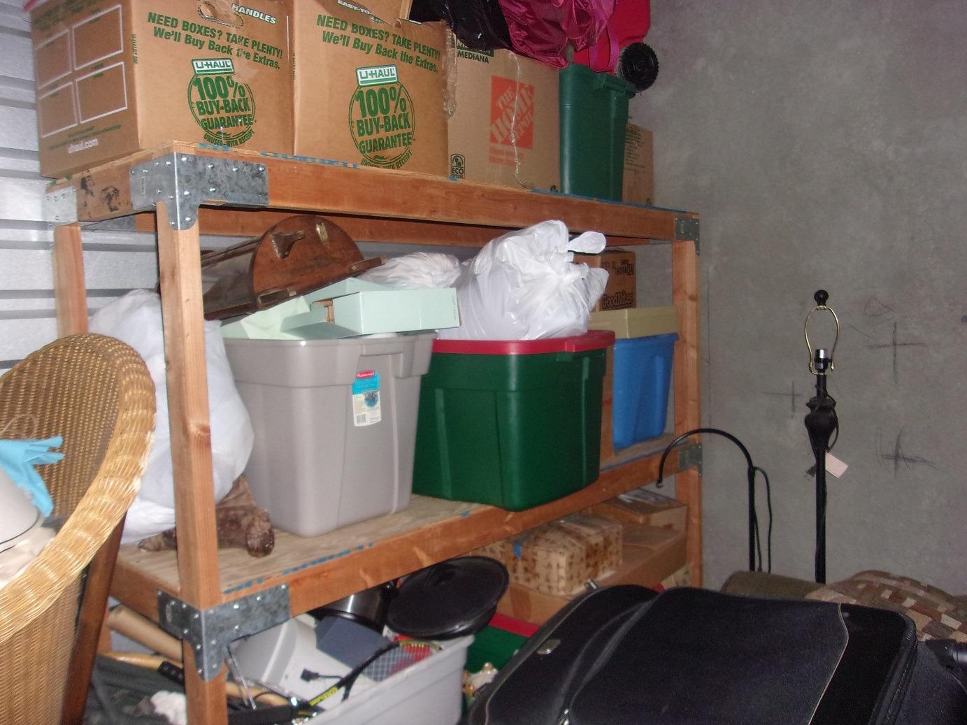 UNIT APPEARS TO CONTAIN: Shelving, Totes, Boxes, Table, Chairs, Sofa, Luggage, Bookshelves, Rug, Lamp, Household items