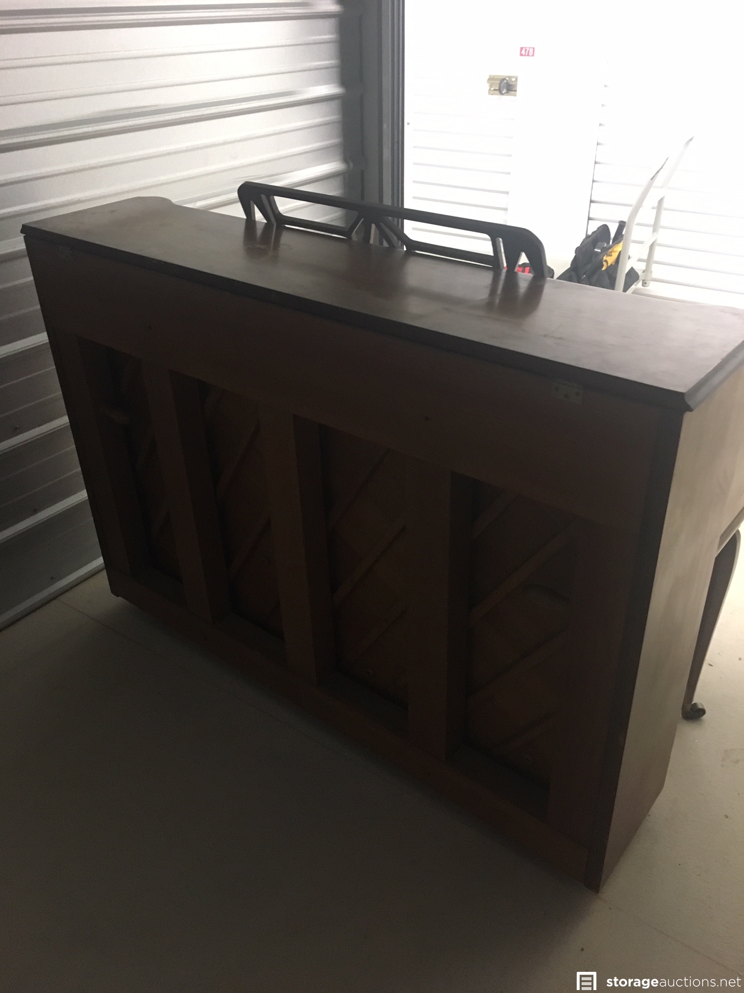 CASH ONLY SALE -- PIANO AND BENCH, COOLER, CONSOLE TABLE, HOLIDAY DECOR, OFFICE CHAIRS, ART EASEL, MISC BOXES, TOOL BOXES, LED LAMP