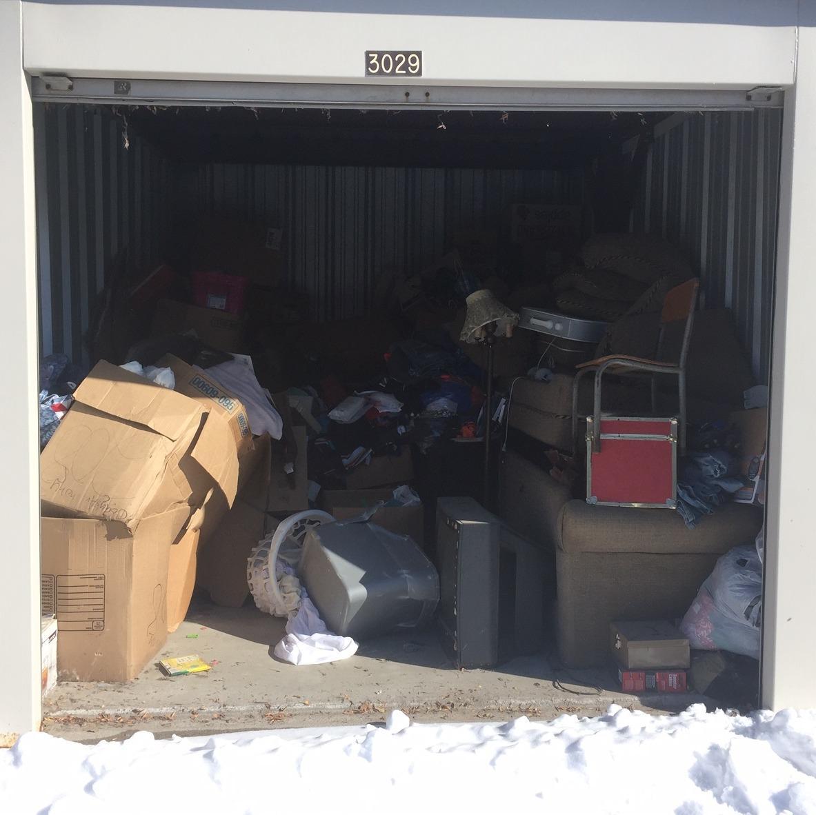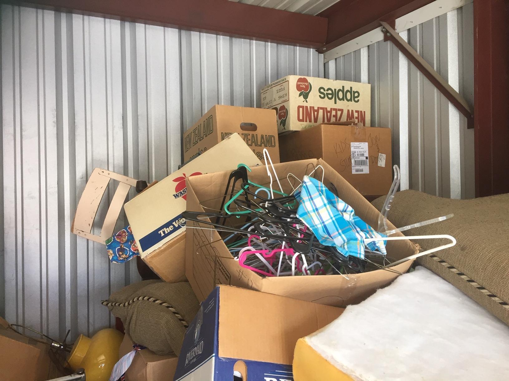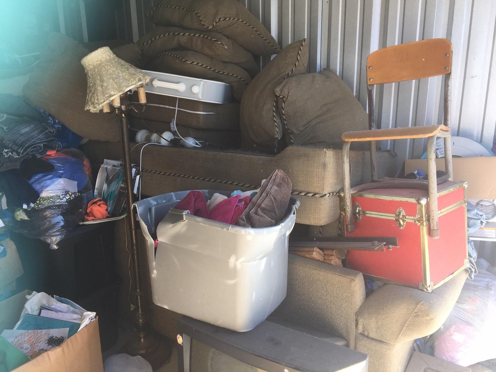 This unit has a couch and love seat with over sized pillows, lots of clothes, like new Under Armour black cleats, toys, lots of boxes with hidden treasures - who knows what you might find!