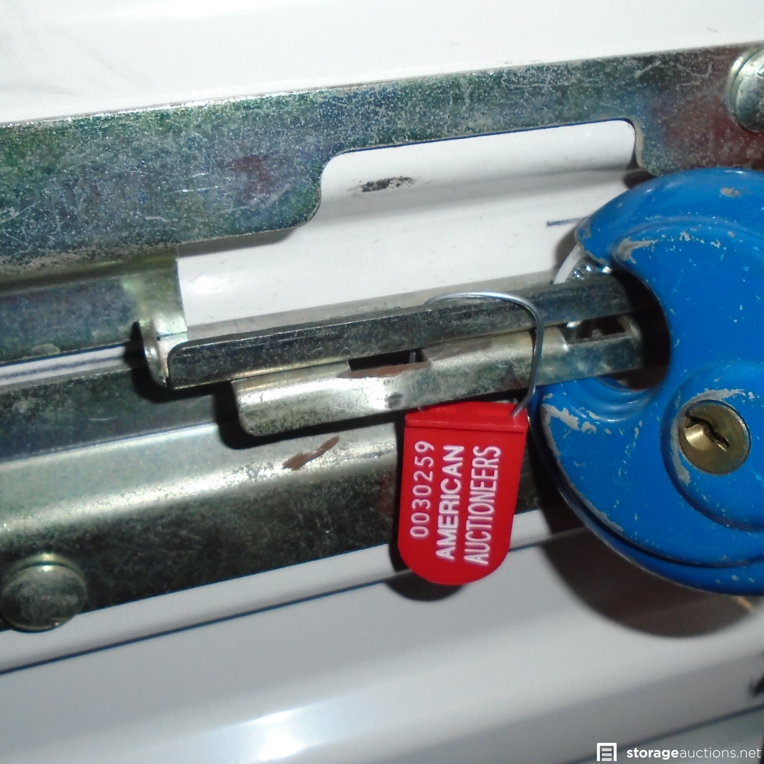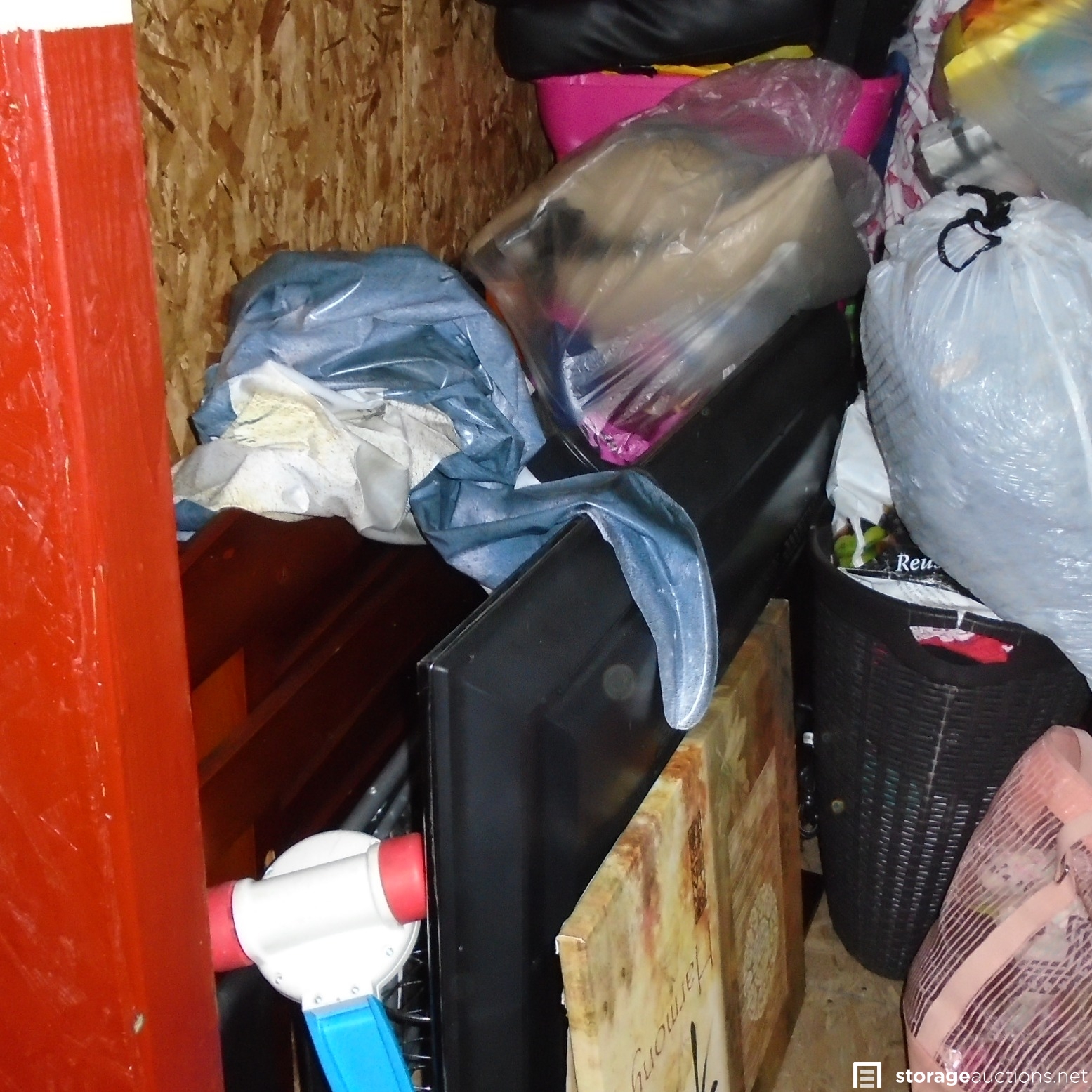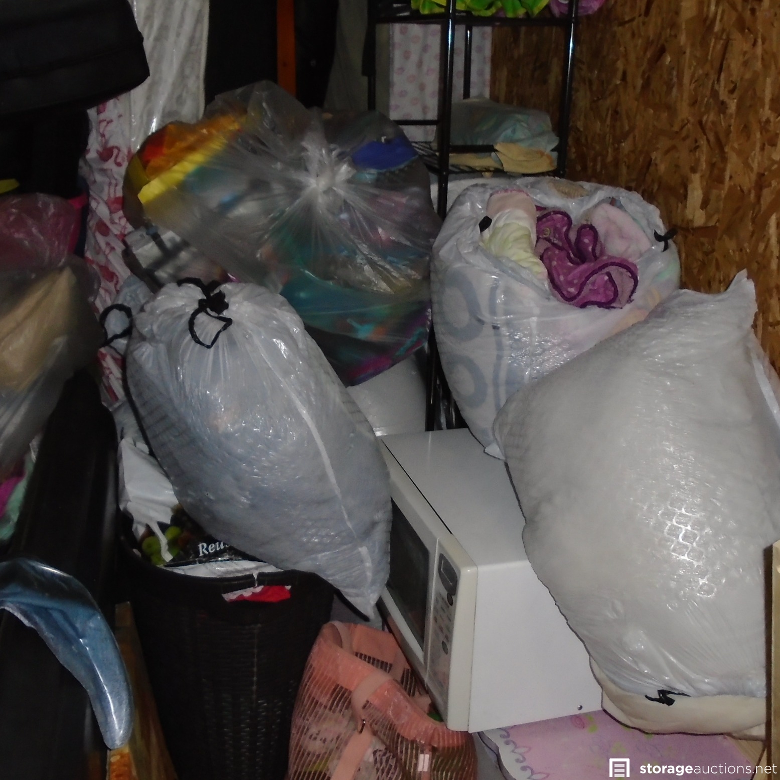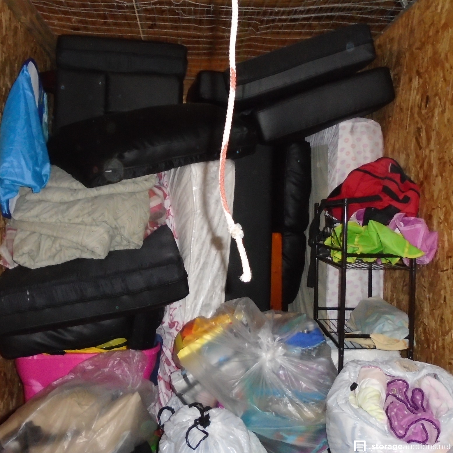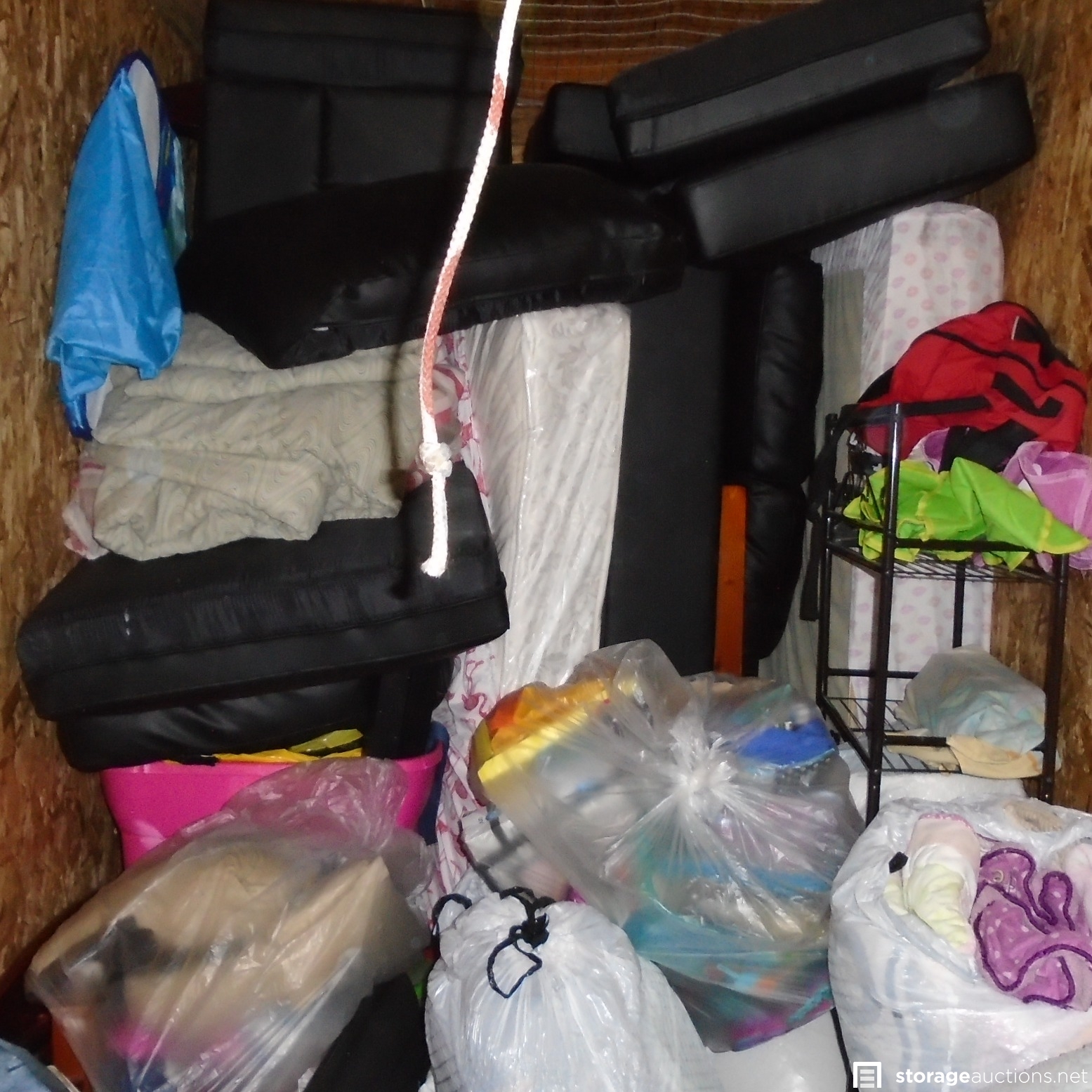 Unit appears to contain bags, bed frame, mattress, microwave, toys, flat screen tv, sofa