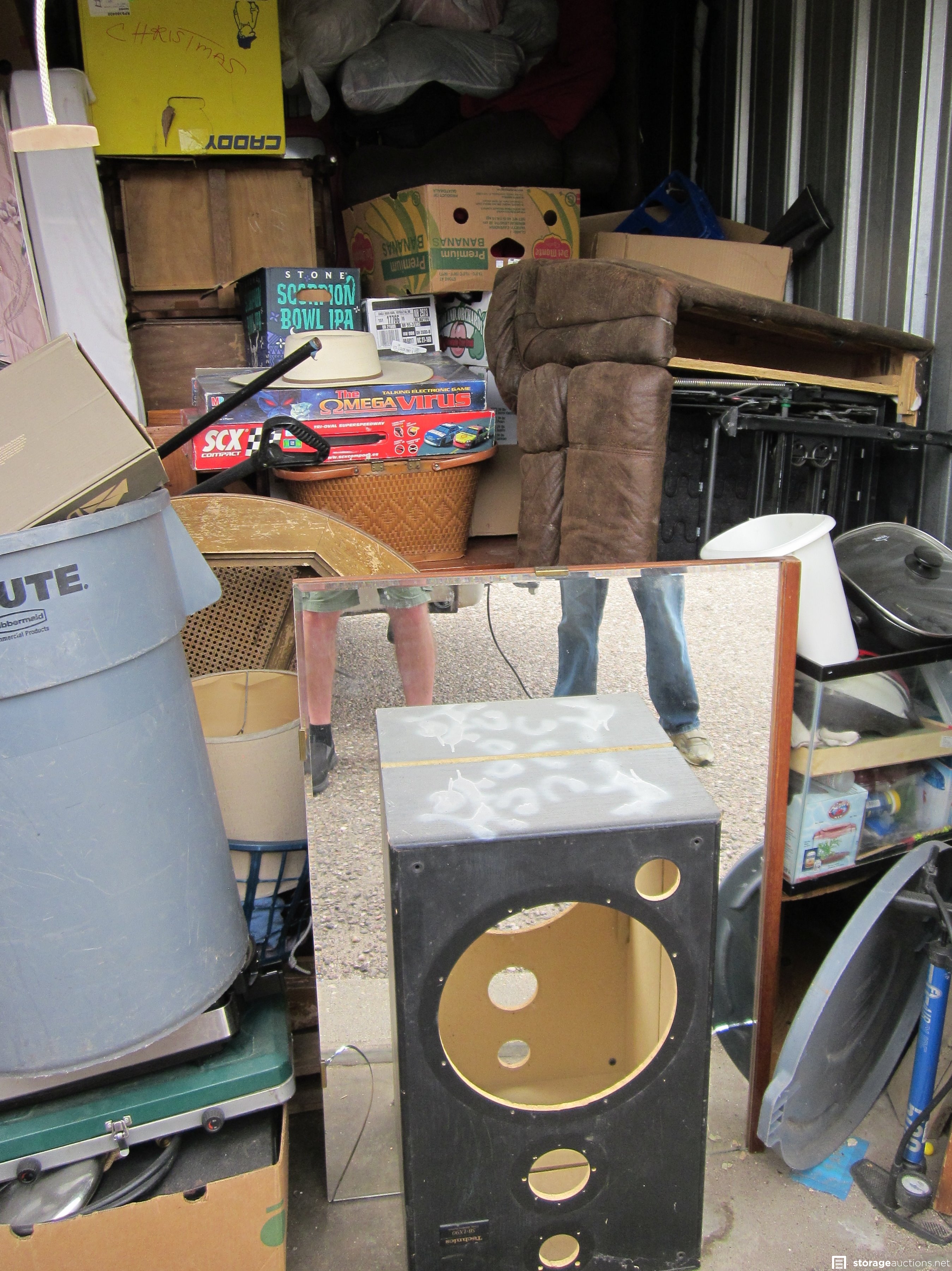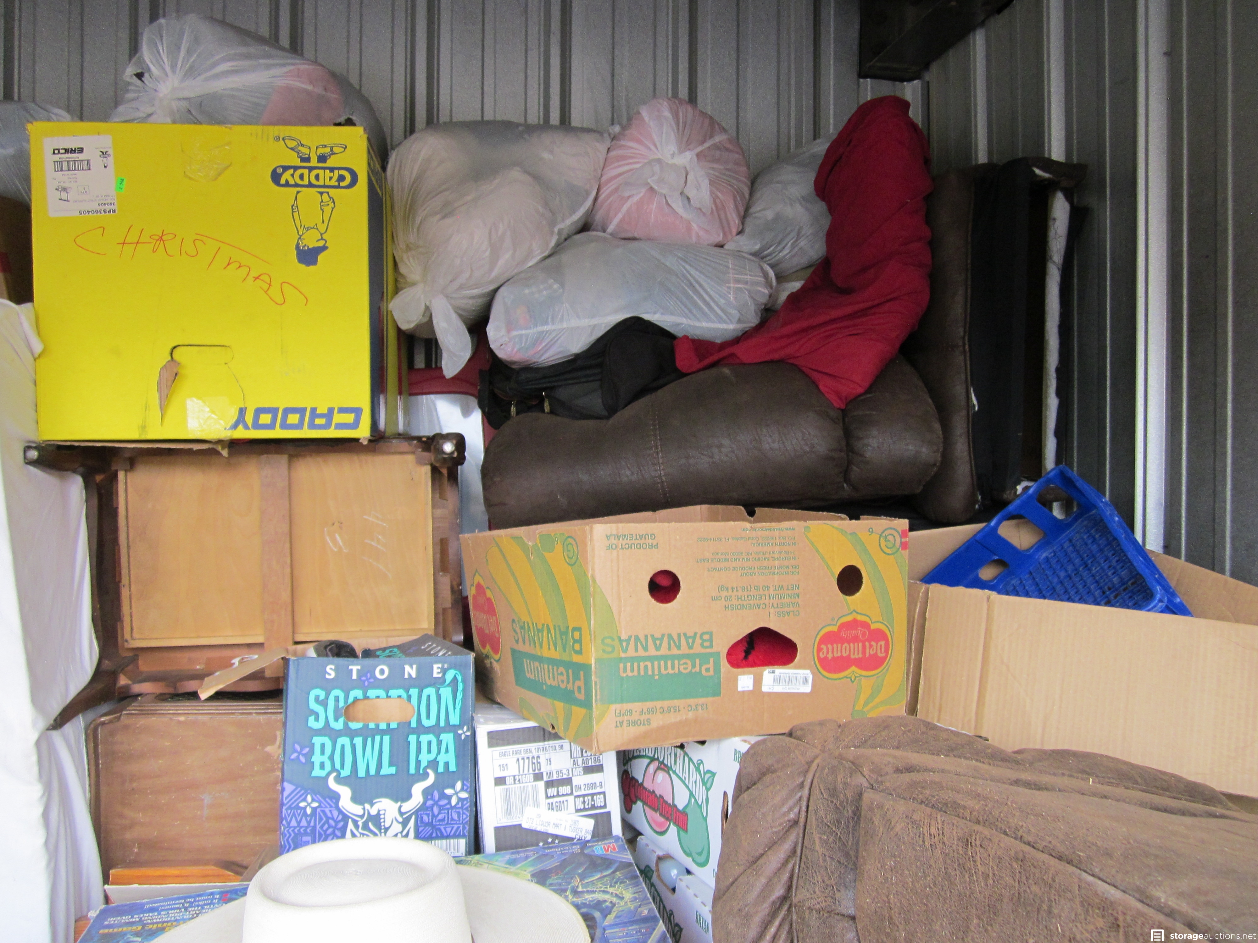 furniture, tools, household items, stereo components, sporting goods?, boxes, containers, bags