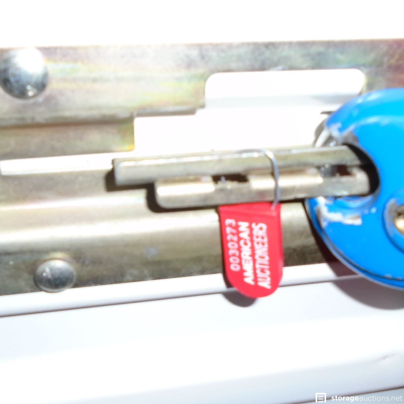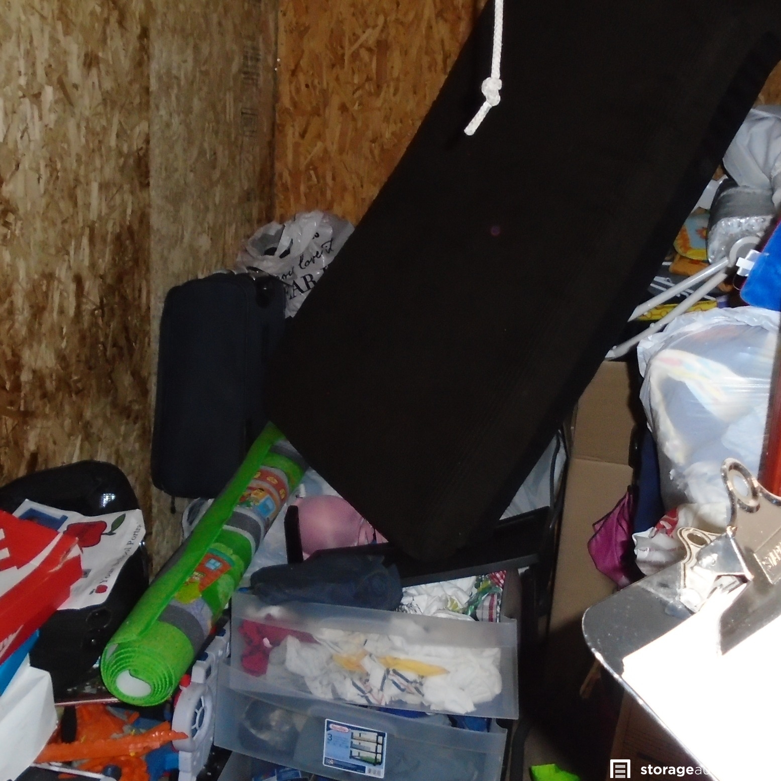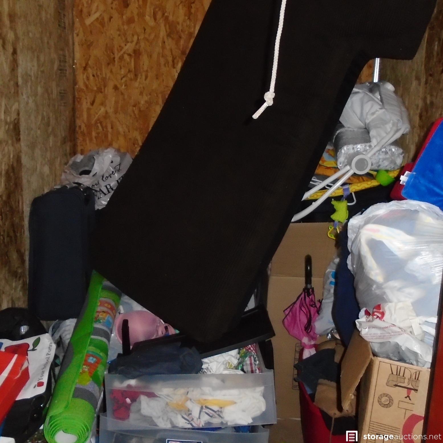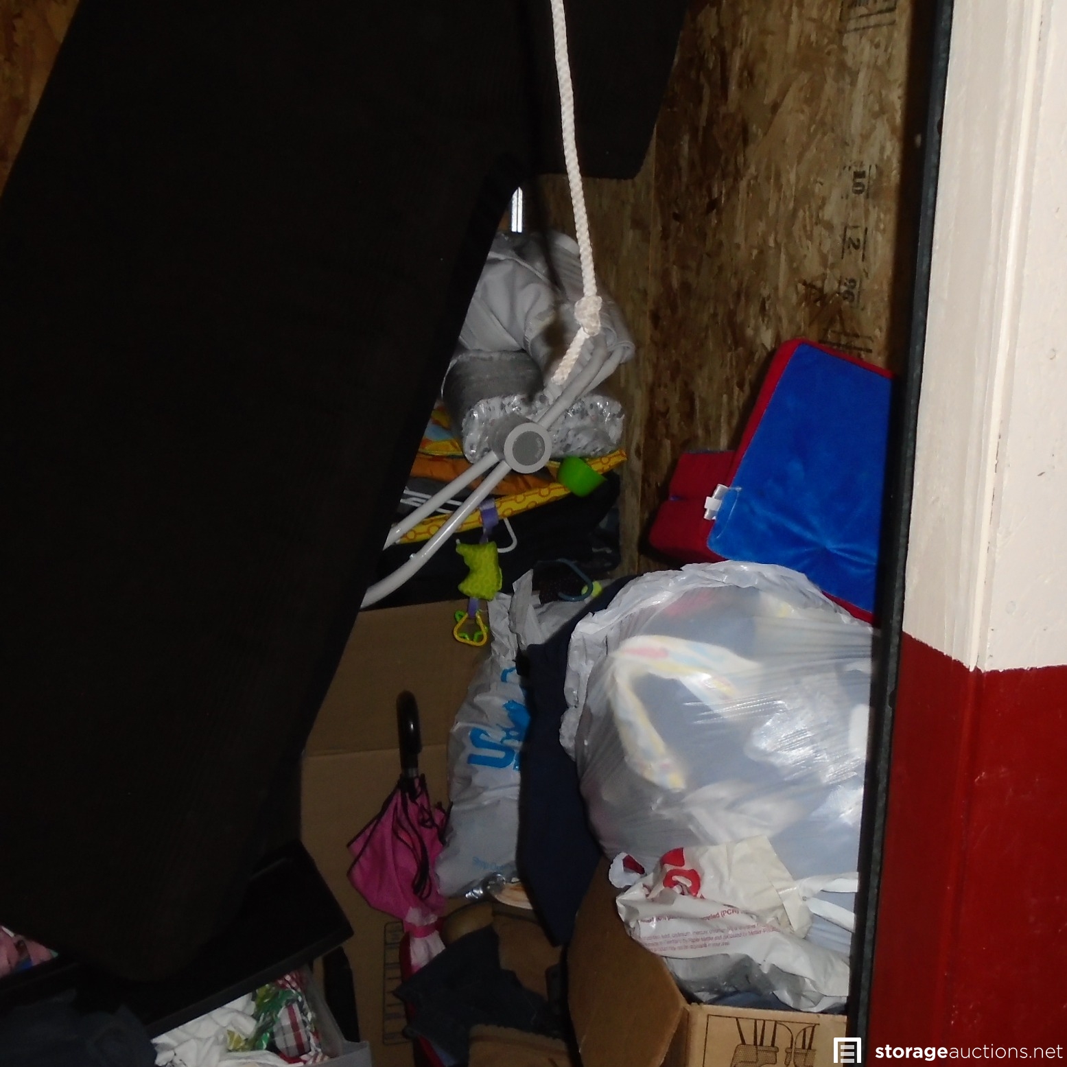 Unit appears to contain clothes, baby swing, shoes, suitcase, totes, toys