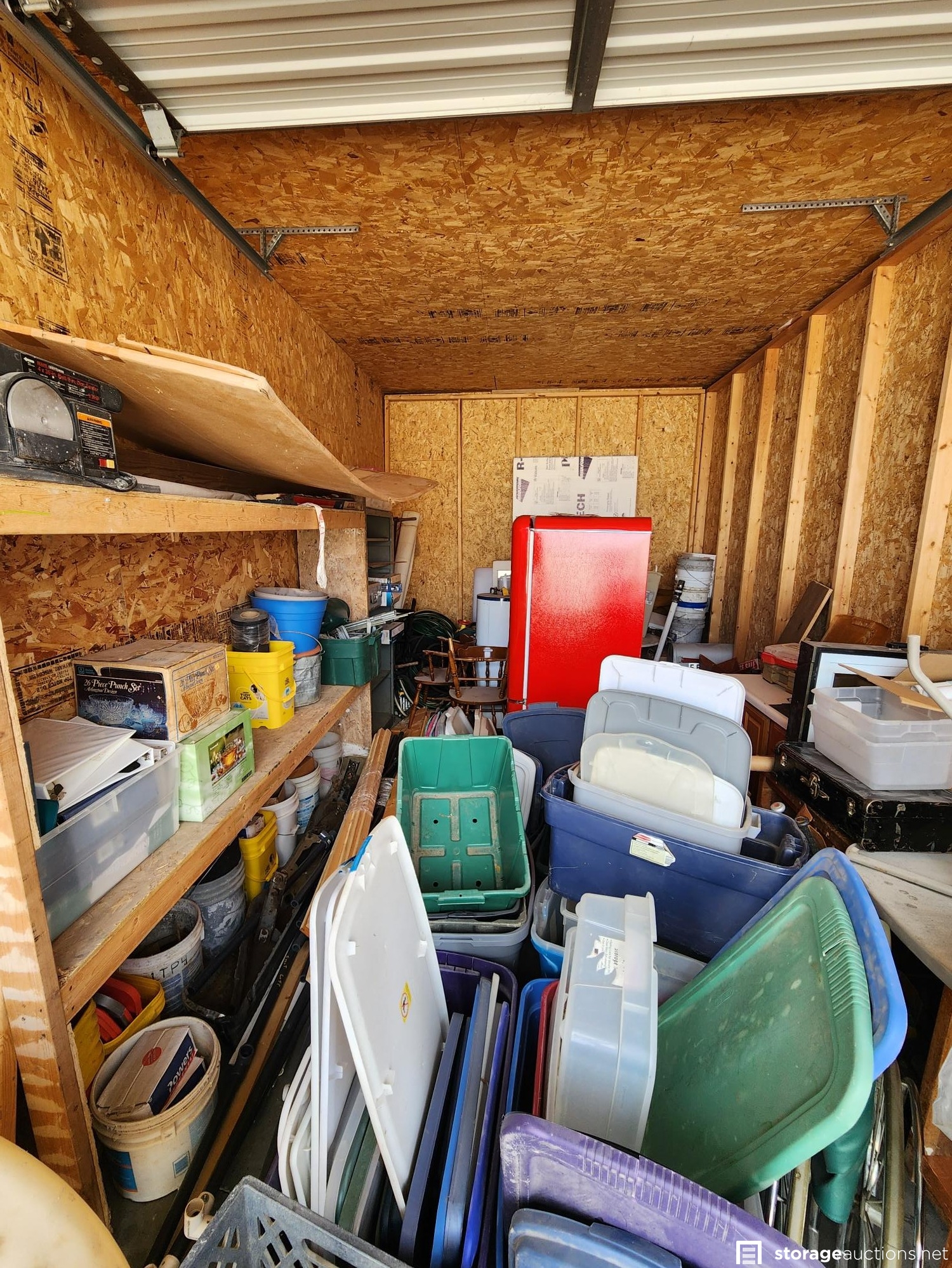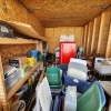 totes, boxes, tools, refrigerator, tank, equipment, furniture, shelf, chairs, buckets, misc items.
