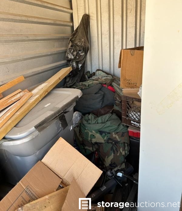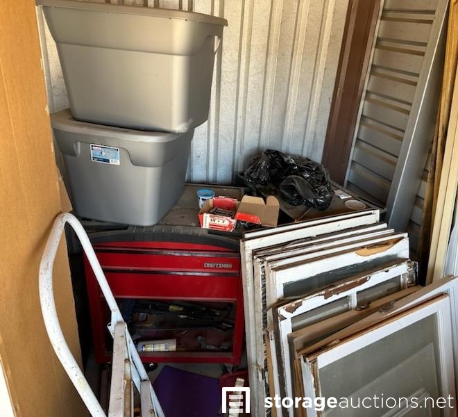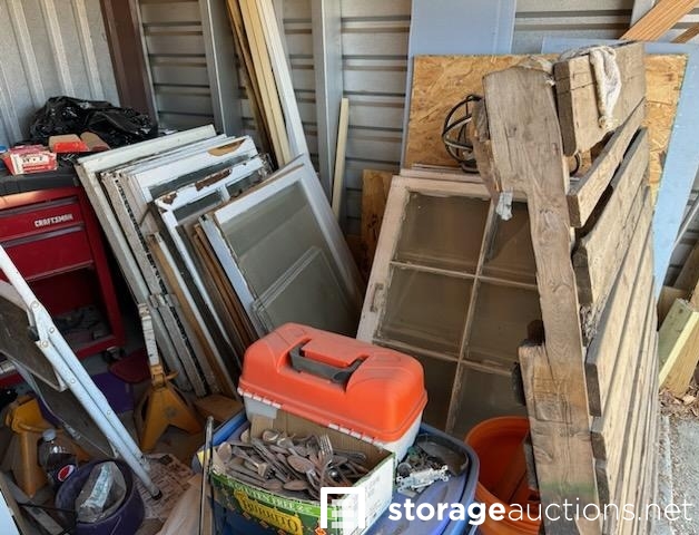 THIS UNIT IS FULL OF WOOD, OLD WINDOWS (FOR THE DIY CRAFTY PEOPLE), CRAFTSMAN TOOL BOX, SILVERWARE, ARMY CLOTHING, BOXES, TOTES AND A WHITE CABINET