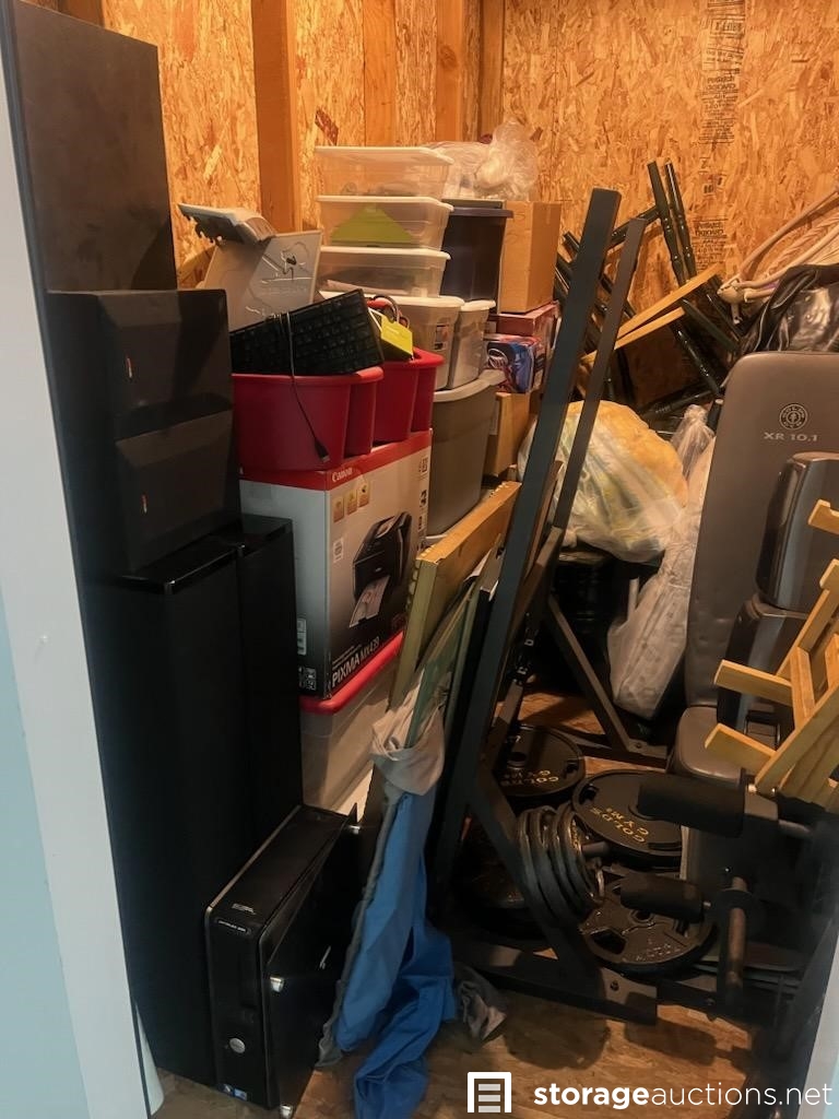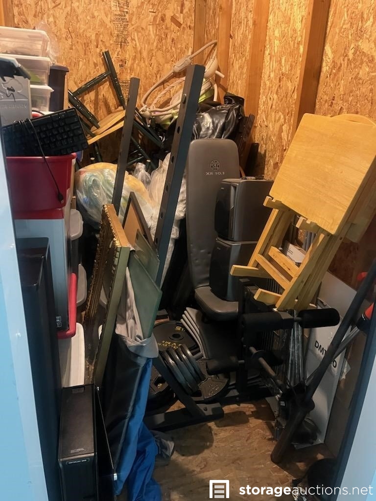 Unit appears to have Golds Gym free weights, Golds gym weight bench, speakers, totes, chairs, wall art, possible printer and keyboard.