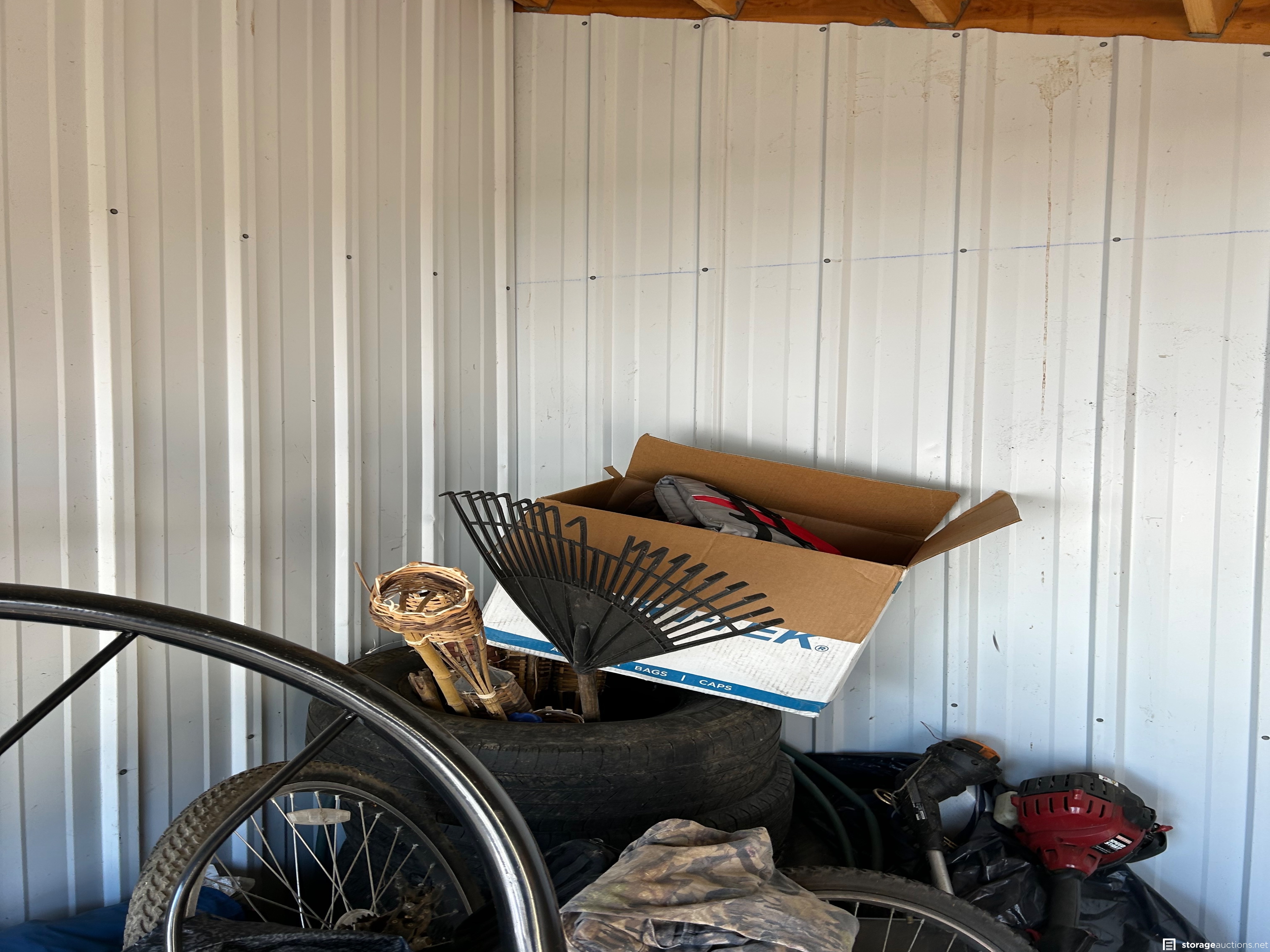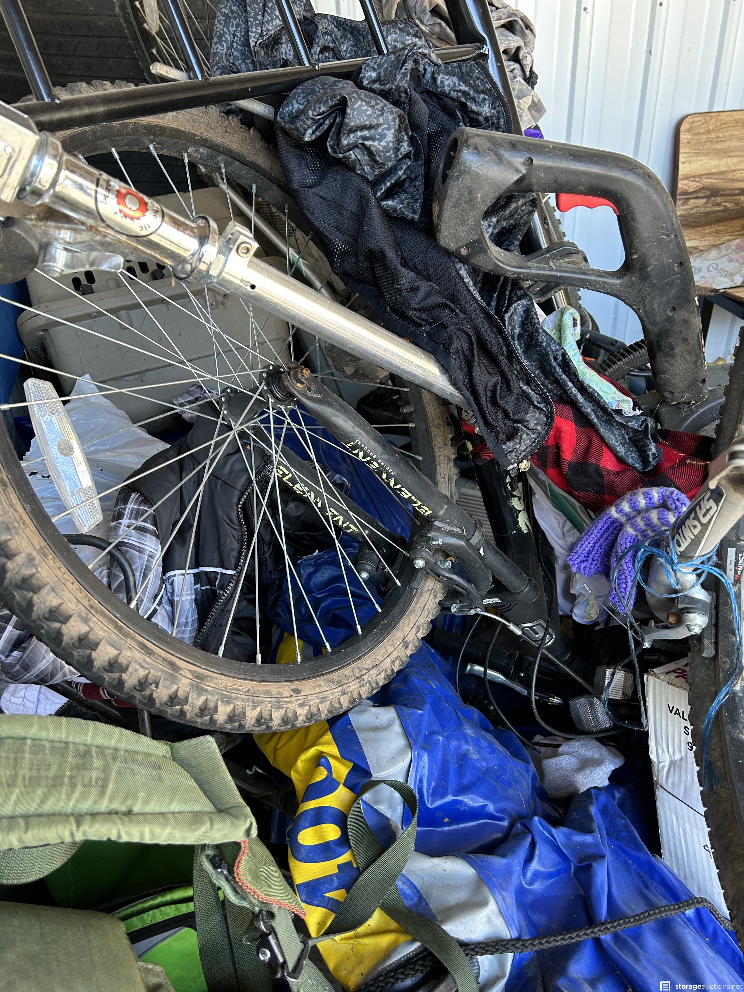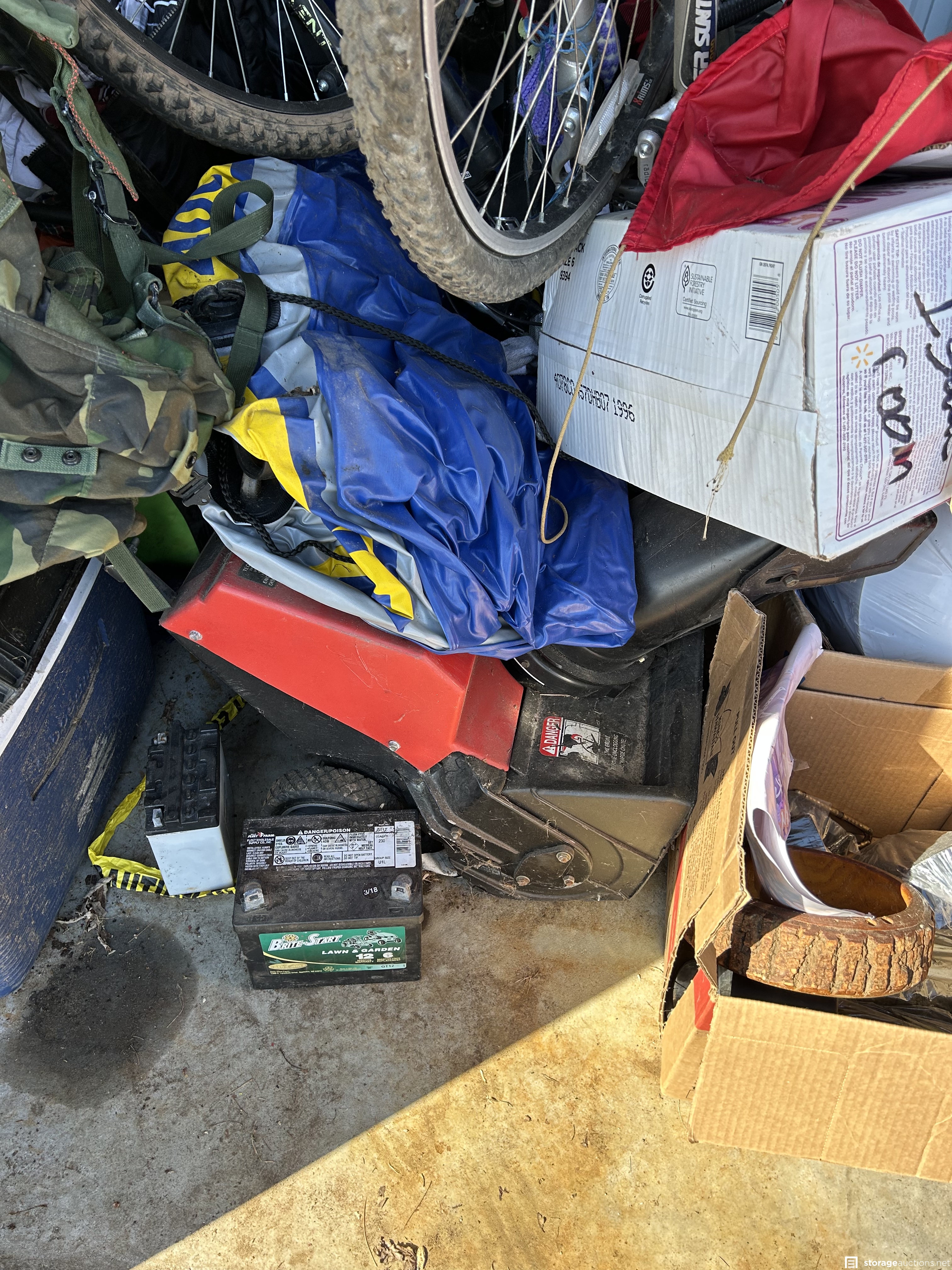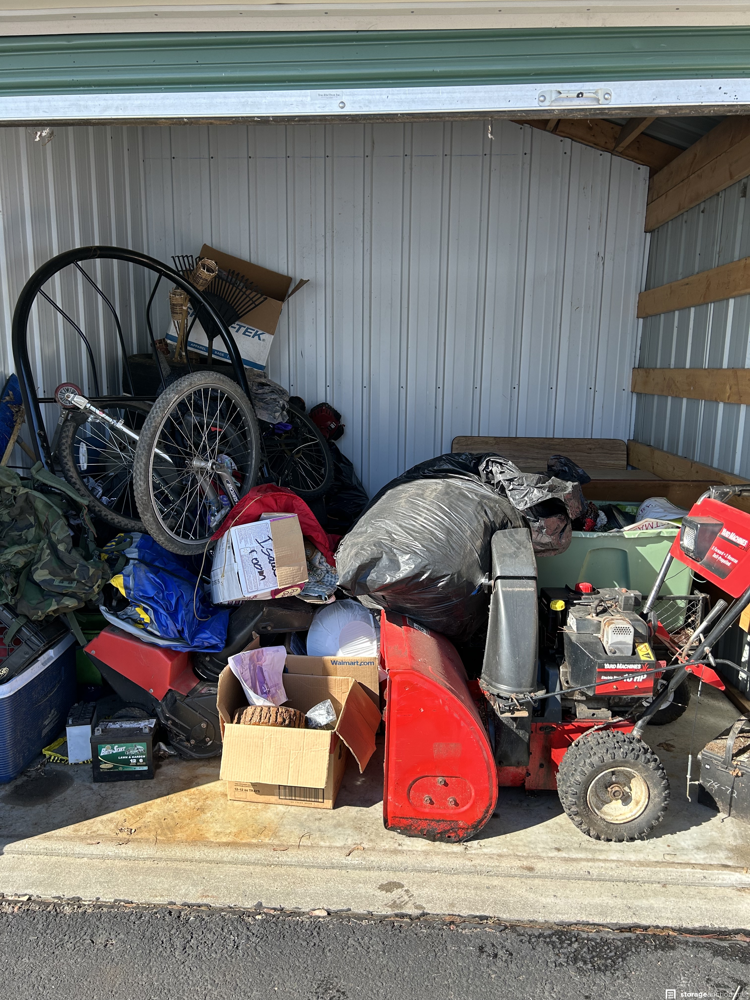 This unit appears to contain a Yard Machine self propelled snow blower, snow thrower, lawn battery, Mongoose bike, Schwann bike, 2 kids scooters, week whacked, hiking pack, cooler, raft, life jacket, pet carrier, clothing, restaurant booth, camping chair, torches, speakers, yard wagon, twin headboard, microwave