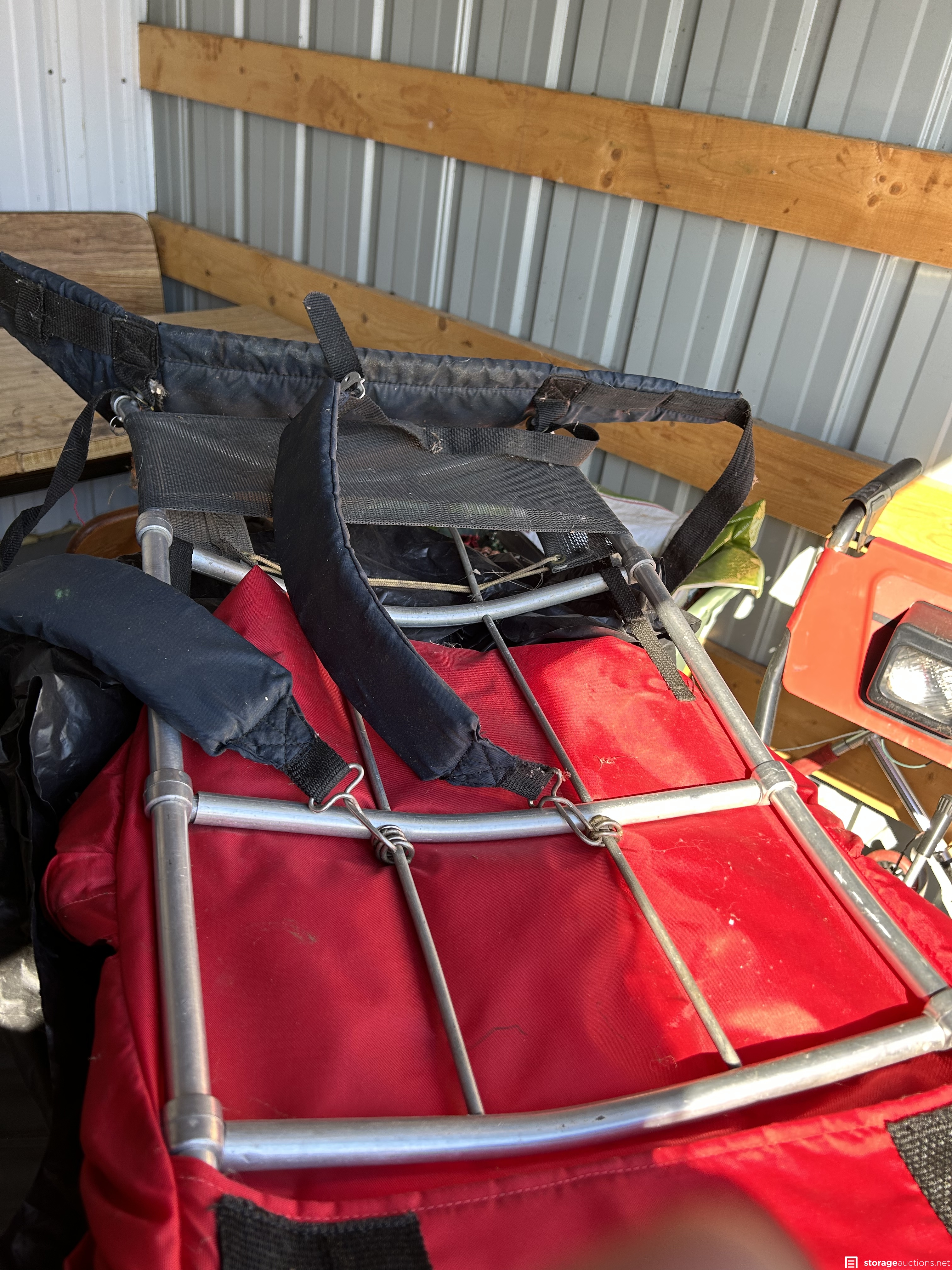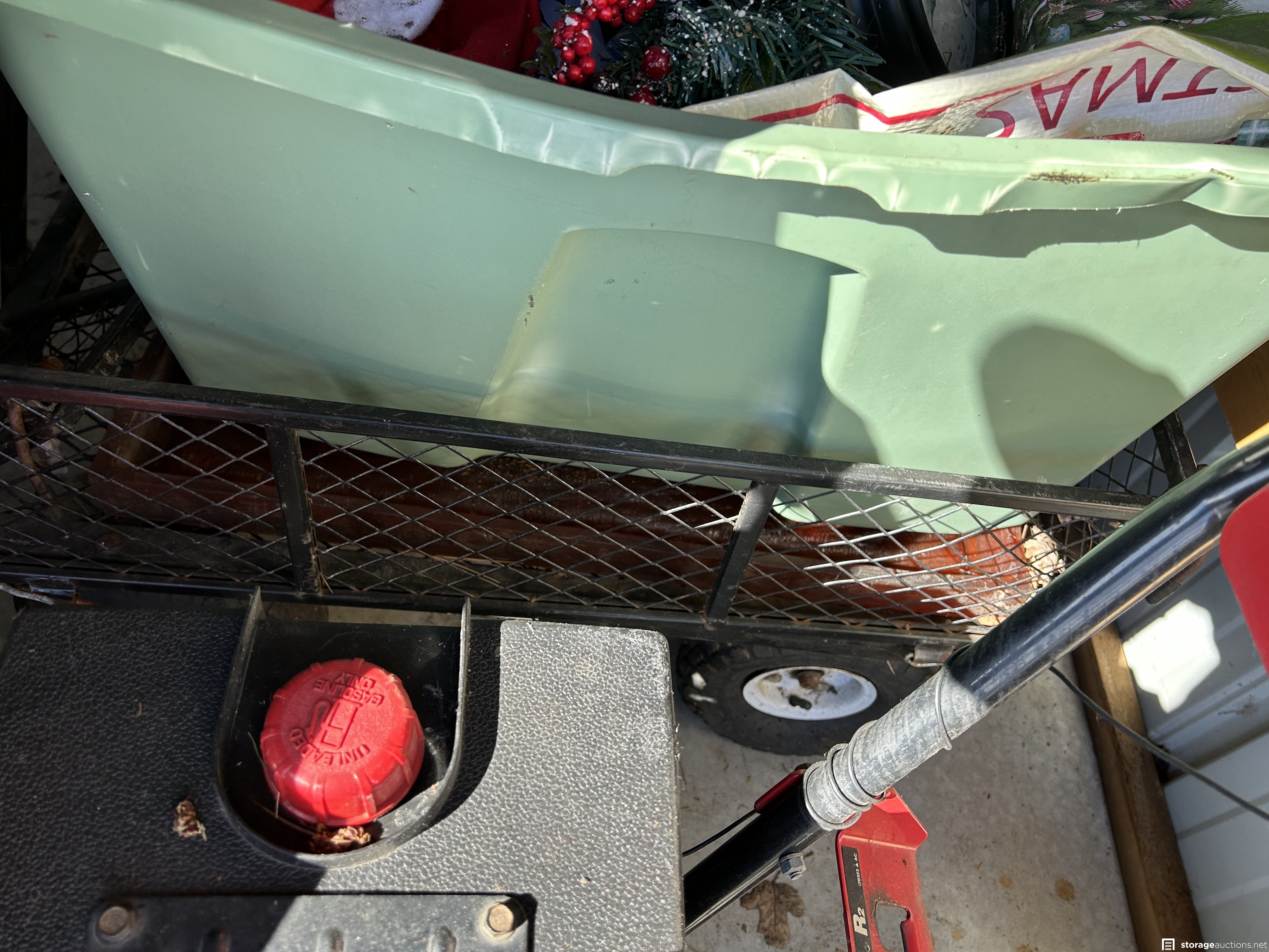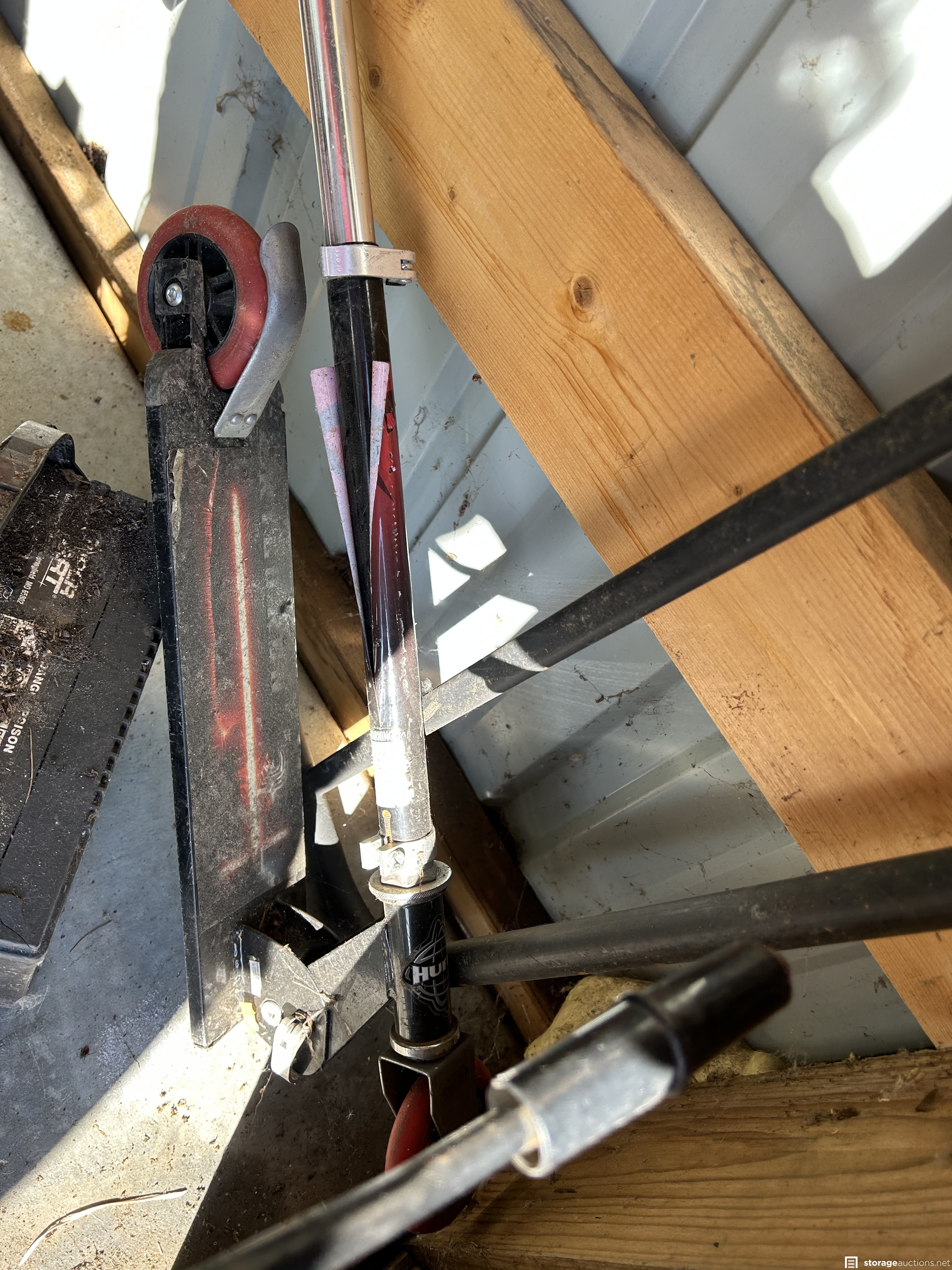 This unit appears to contain a Yard Machine self propelled snow blower, snow thrower, lawn battery, Mongoose bike, Schwann bike, 2 kids scooters, week whacked, hiking pack, cooler, raft, life jacket, pet carrier, clothing, restaurant booth, camping chair, torches, speakers, yard wagon, twin headboard, microwave