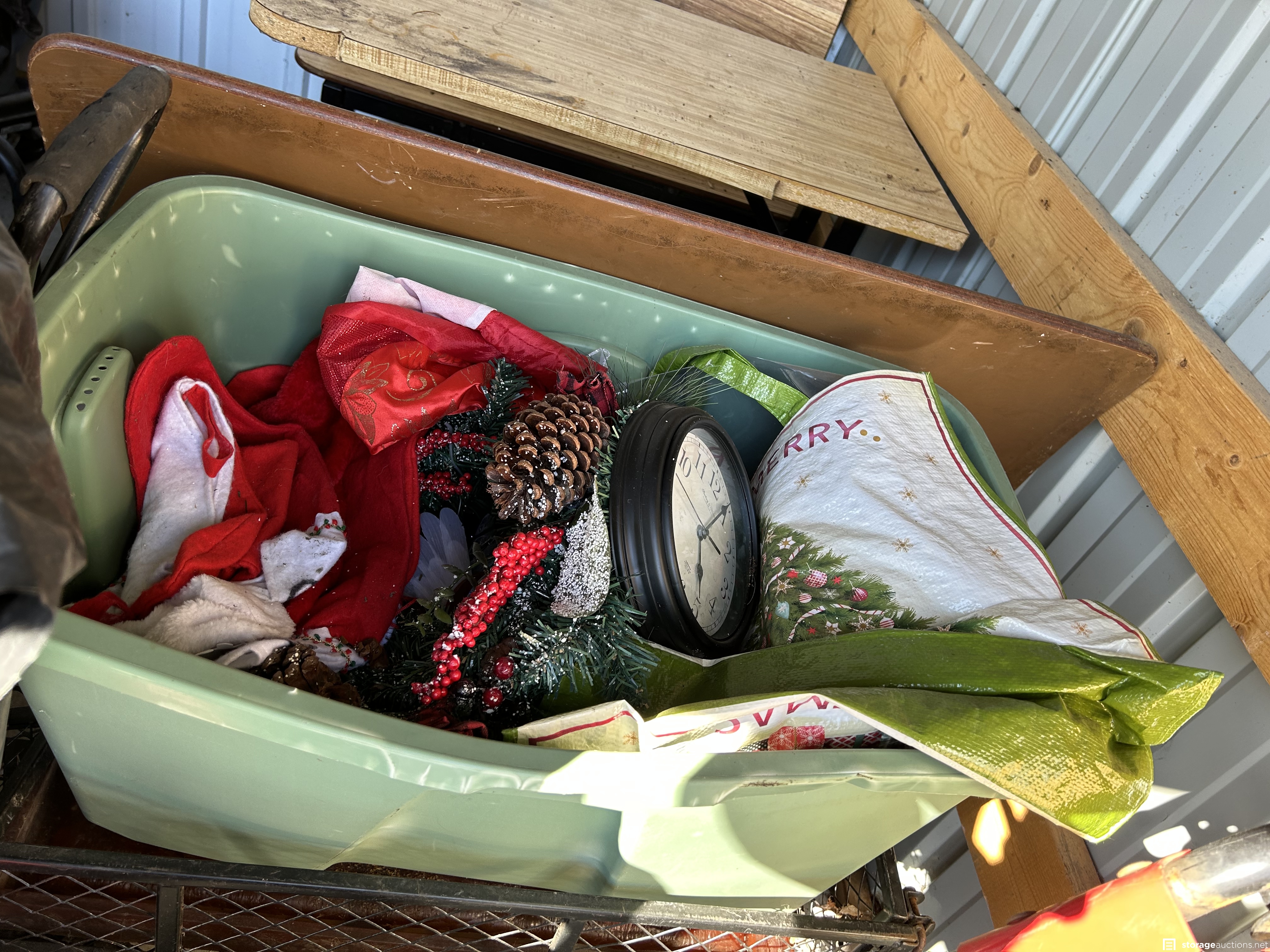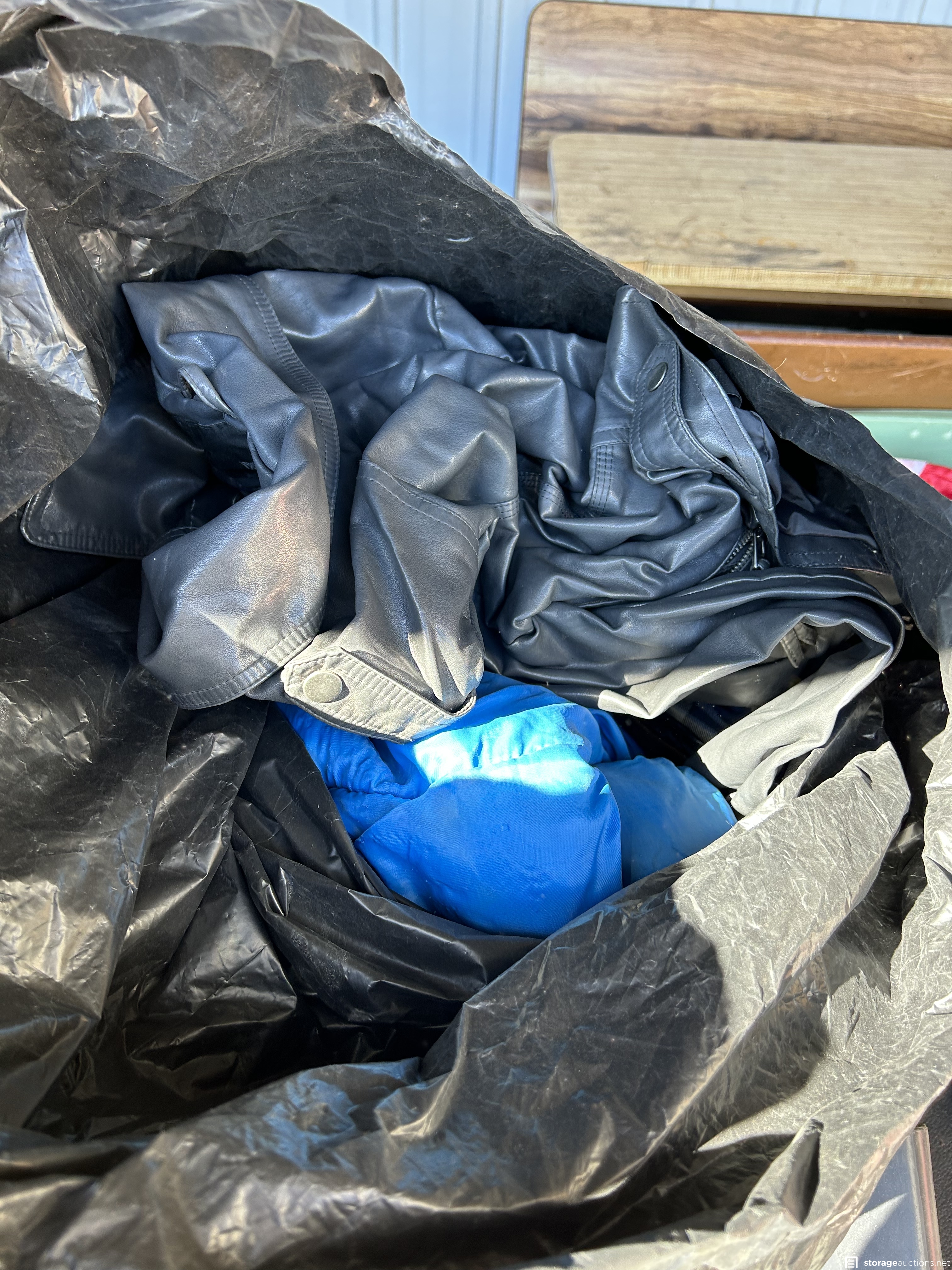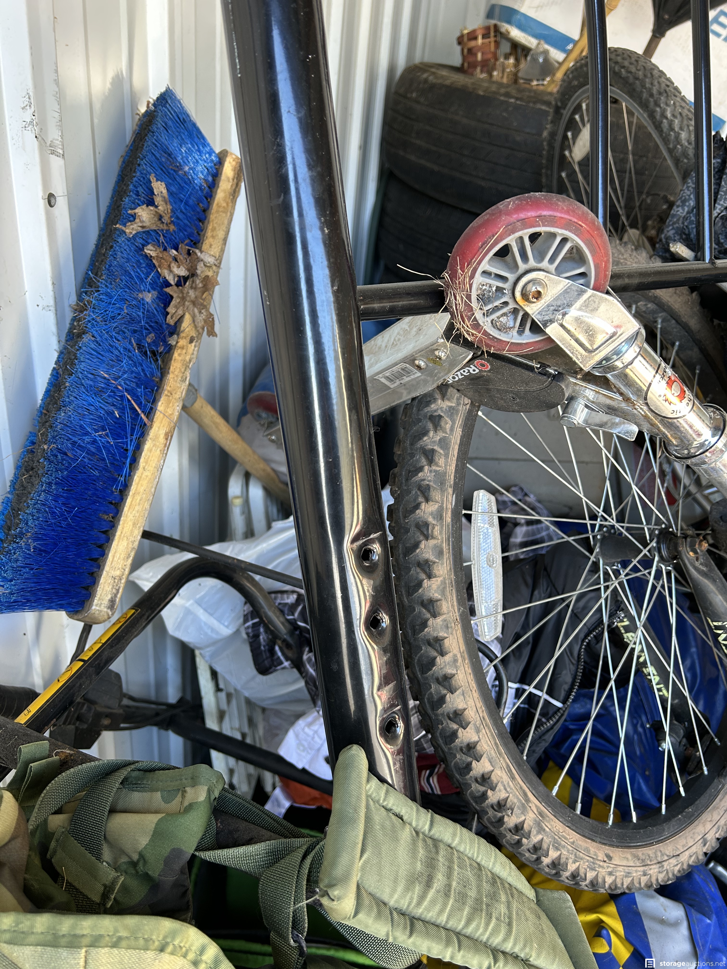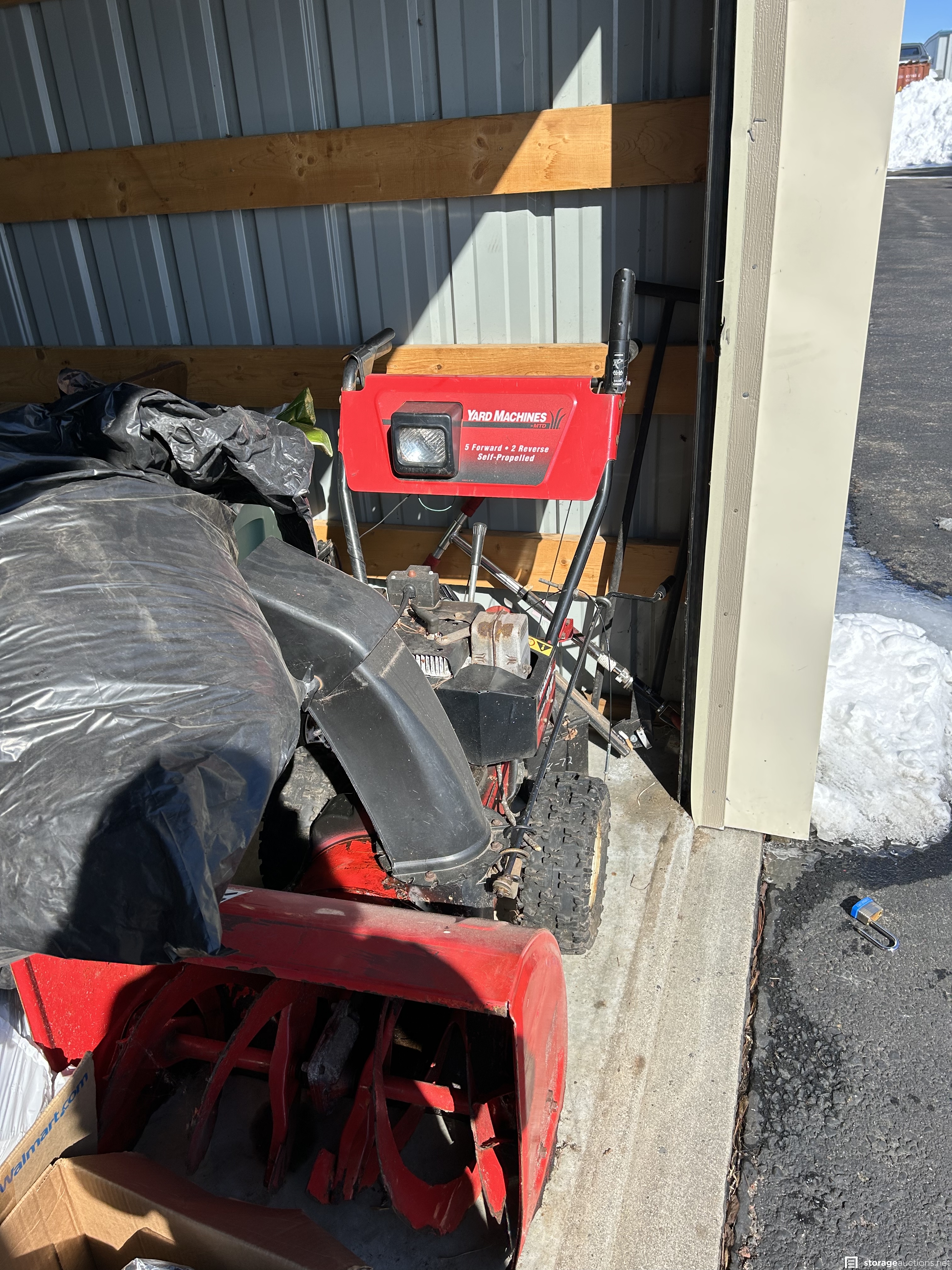 This unit appears to contain a Yard Machine self propelled snow blower, snow thrower, lawn battery, Mongoose bike, Schwann bike, 2 kids scooters, week whacked, hiking pack, cooler, raft, life jacket, pet carrier, clothing, restaurant booth, camping chair, torches, speakers, yard wagon, twin headboard, microwave