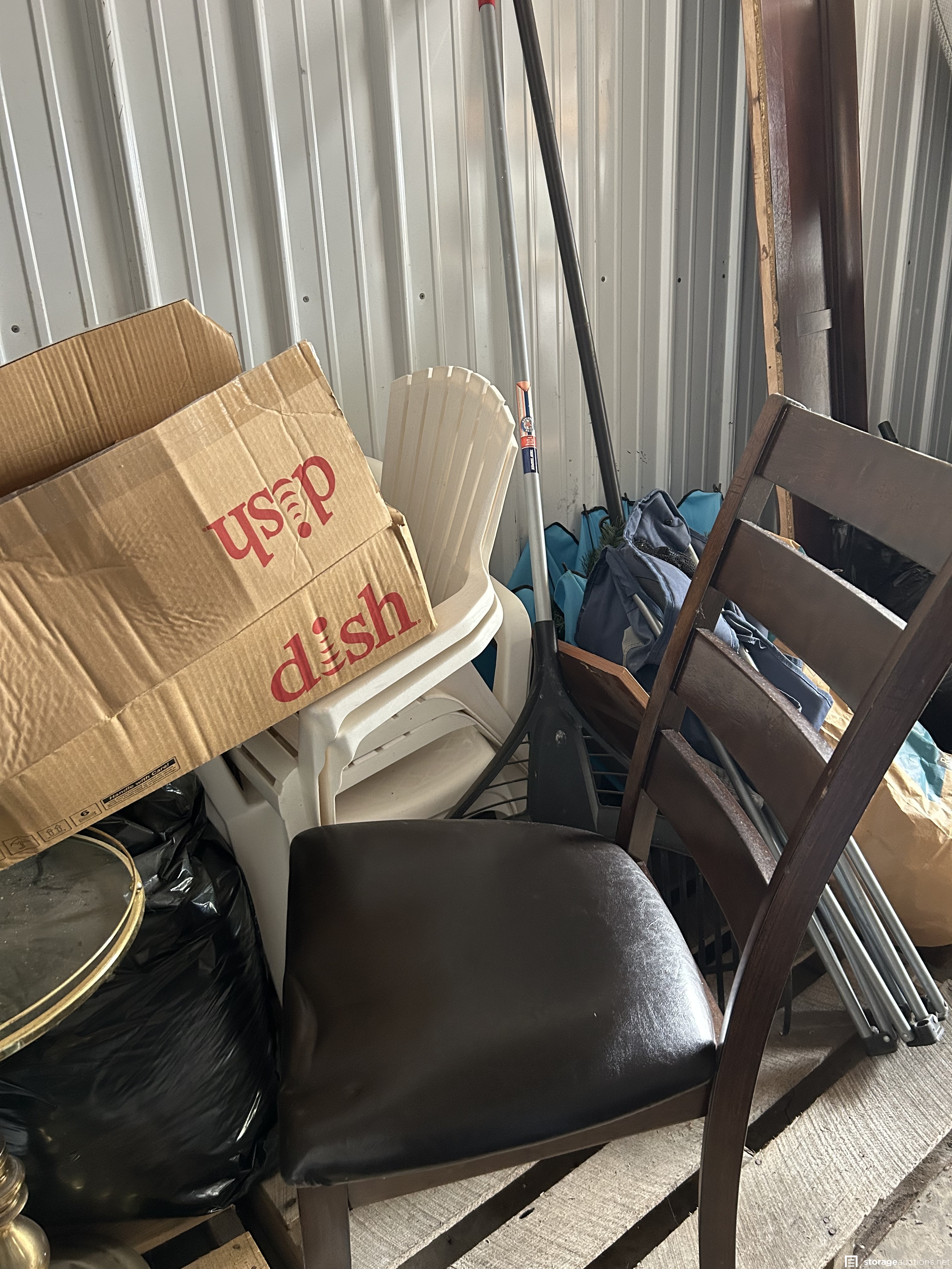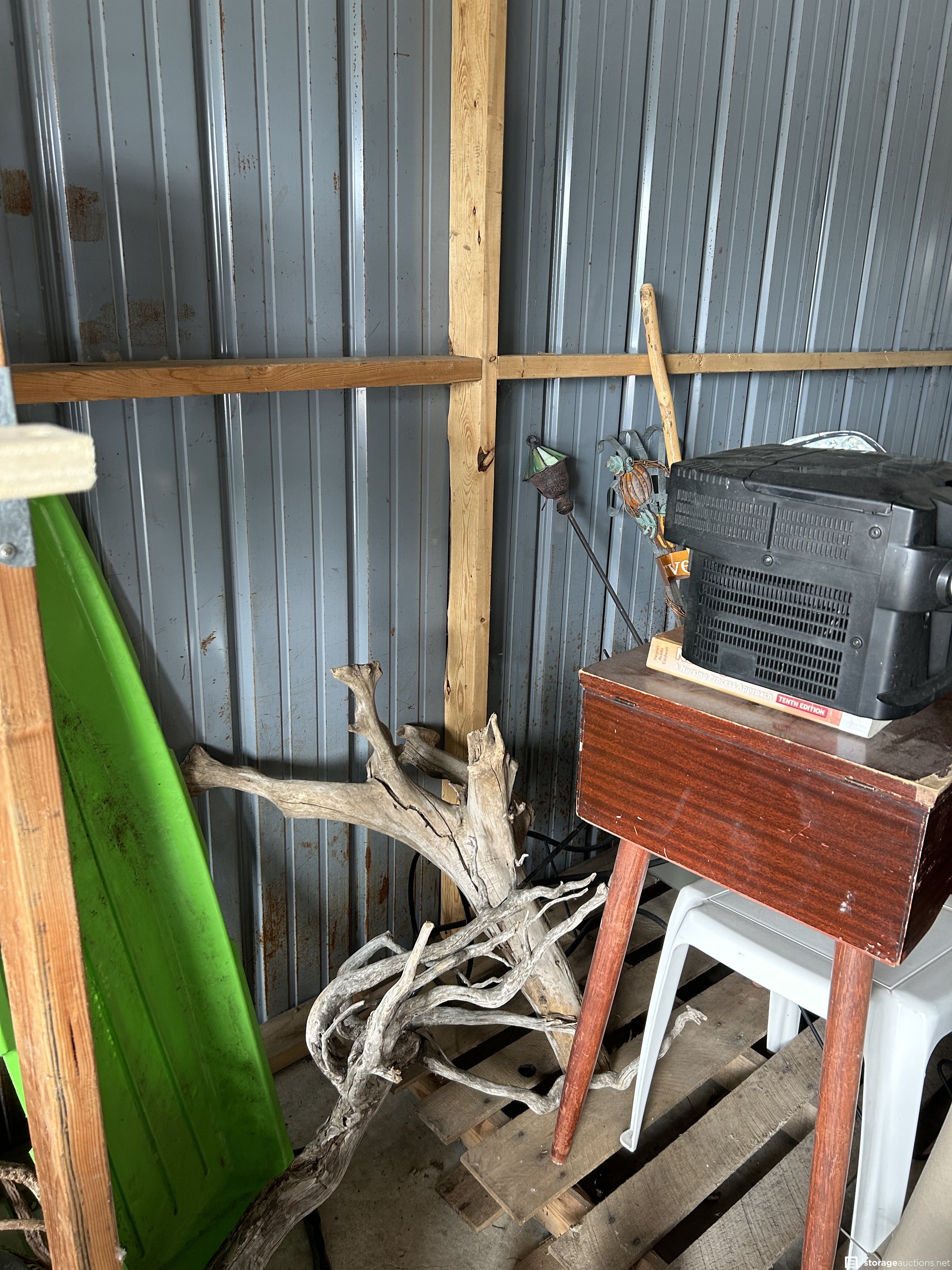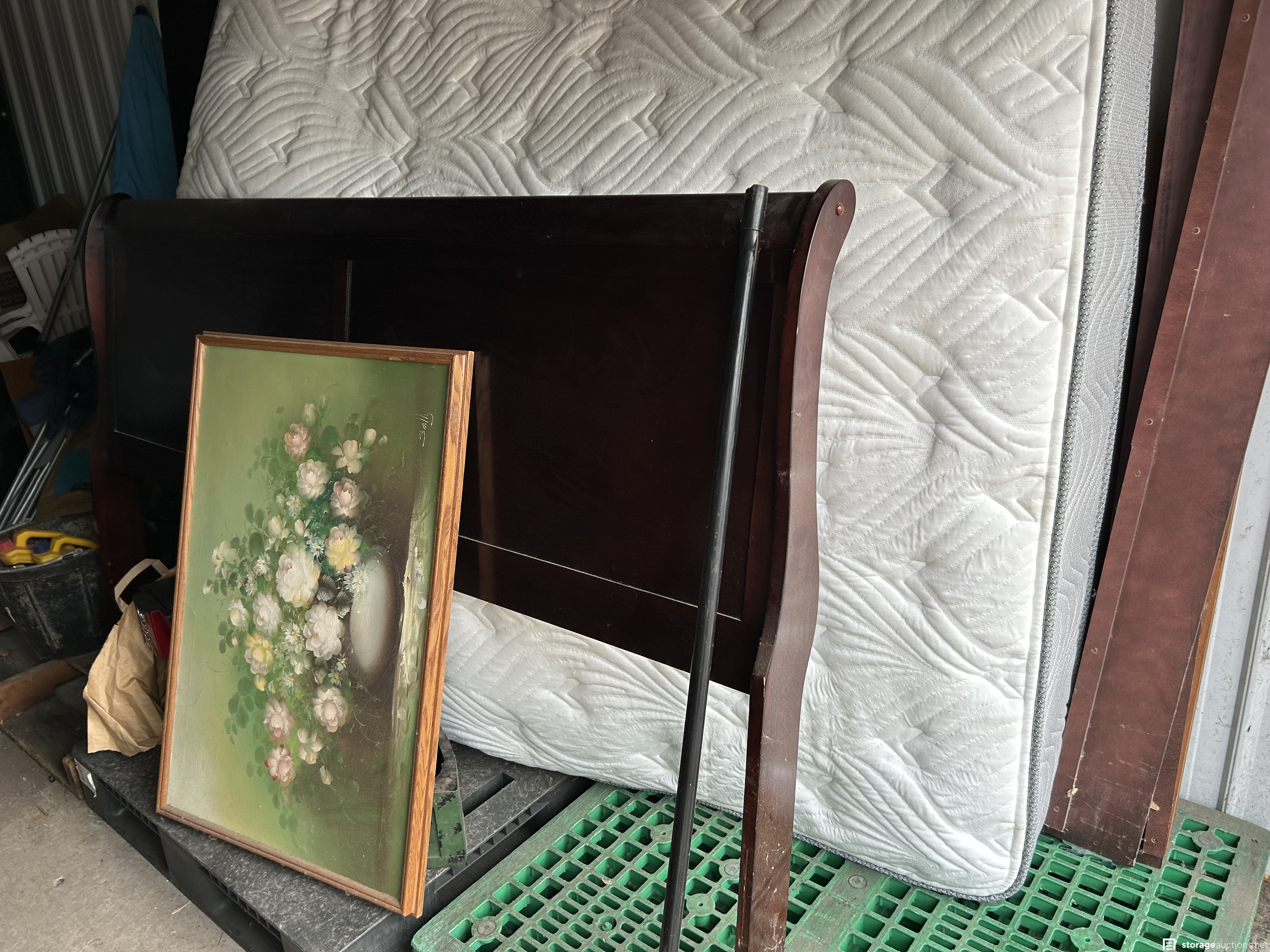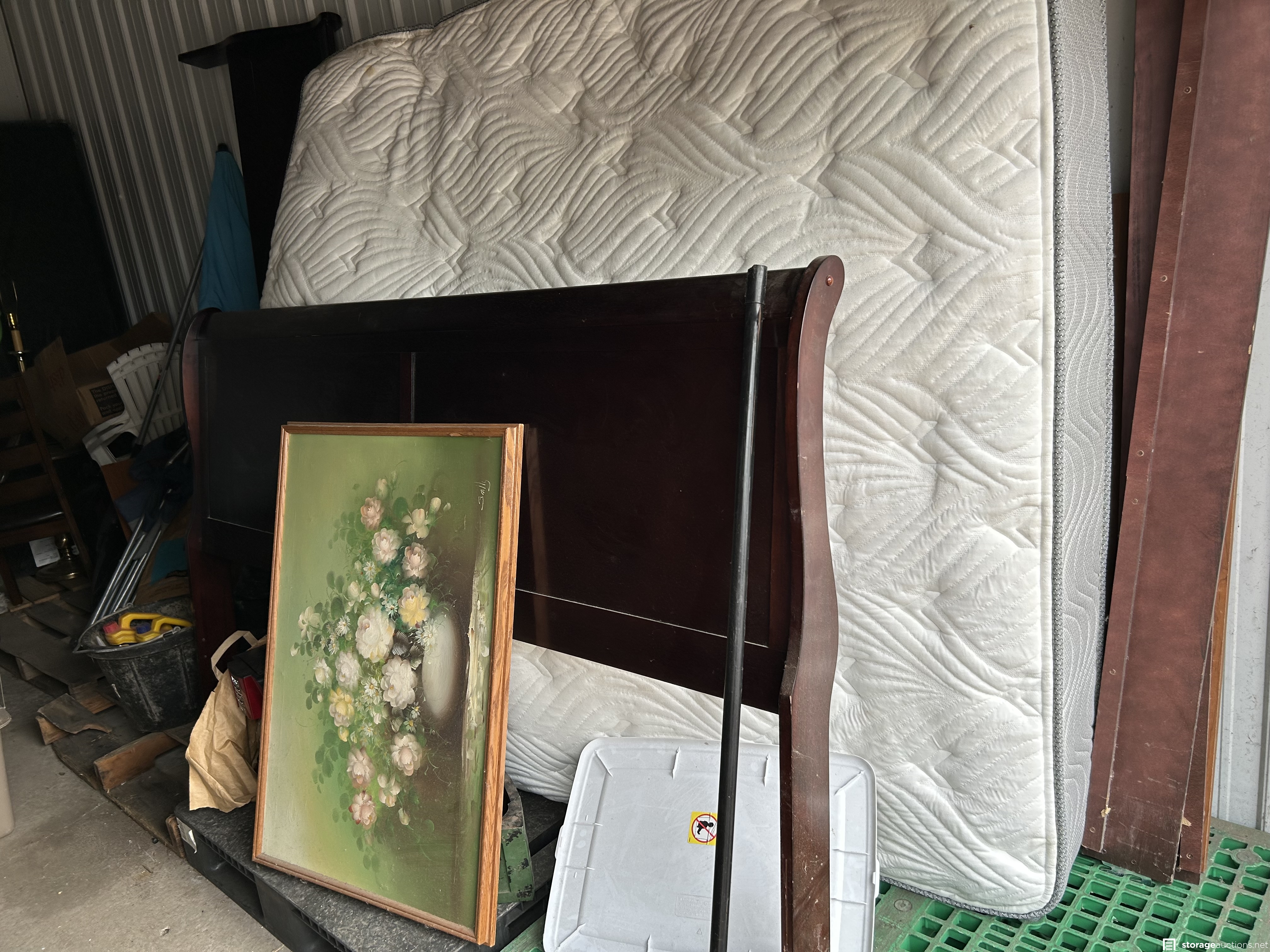 This unit appears to contain a cherry scroll headboard/footboard, garden supplies, outdoor glass-top table, plastic outdoor chairs, 2 kids Adirondack chairs, wood shelf, tv stand,