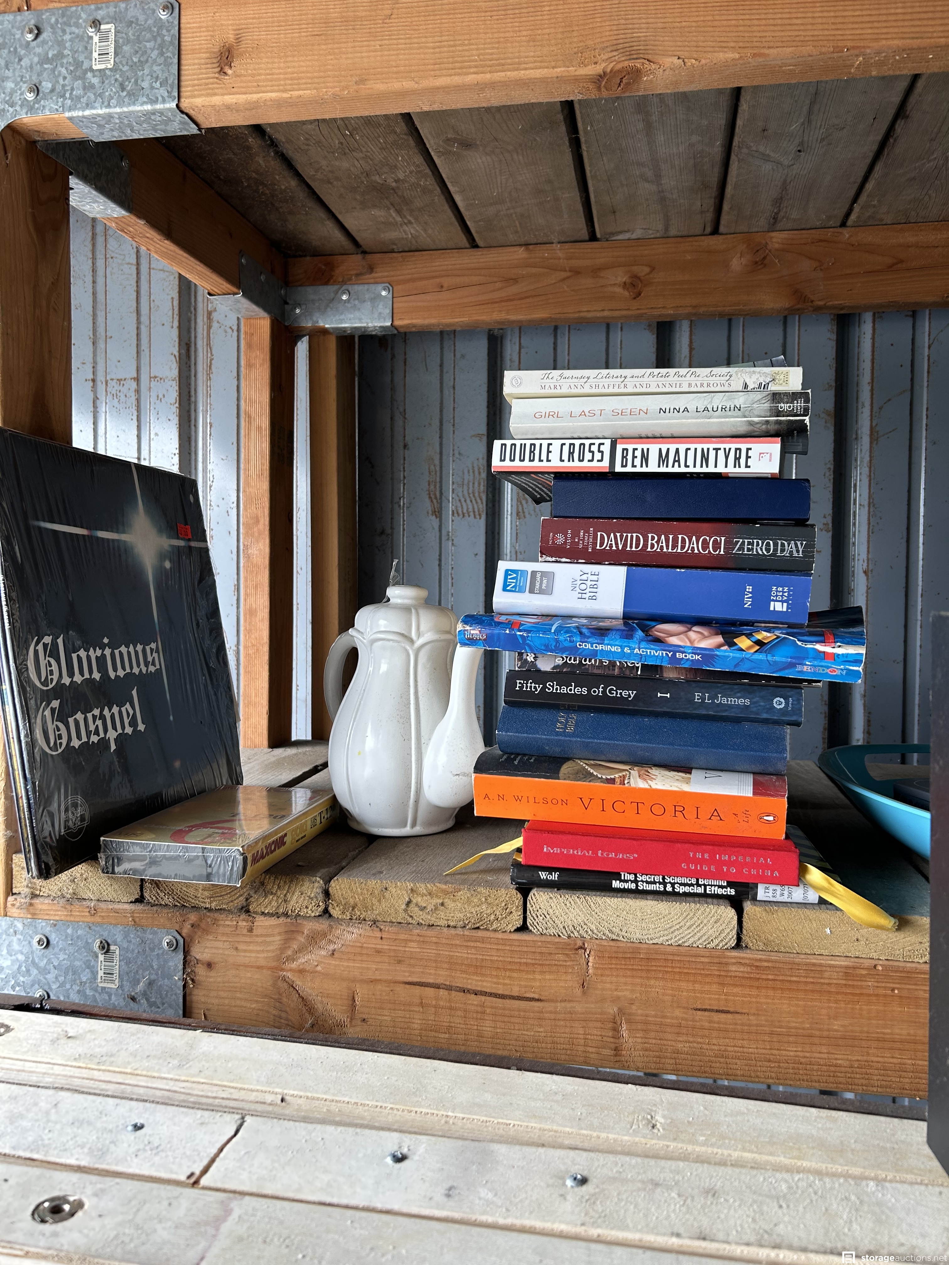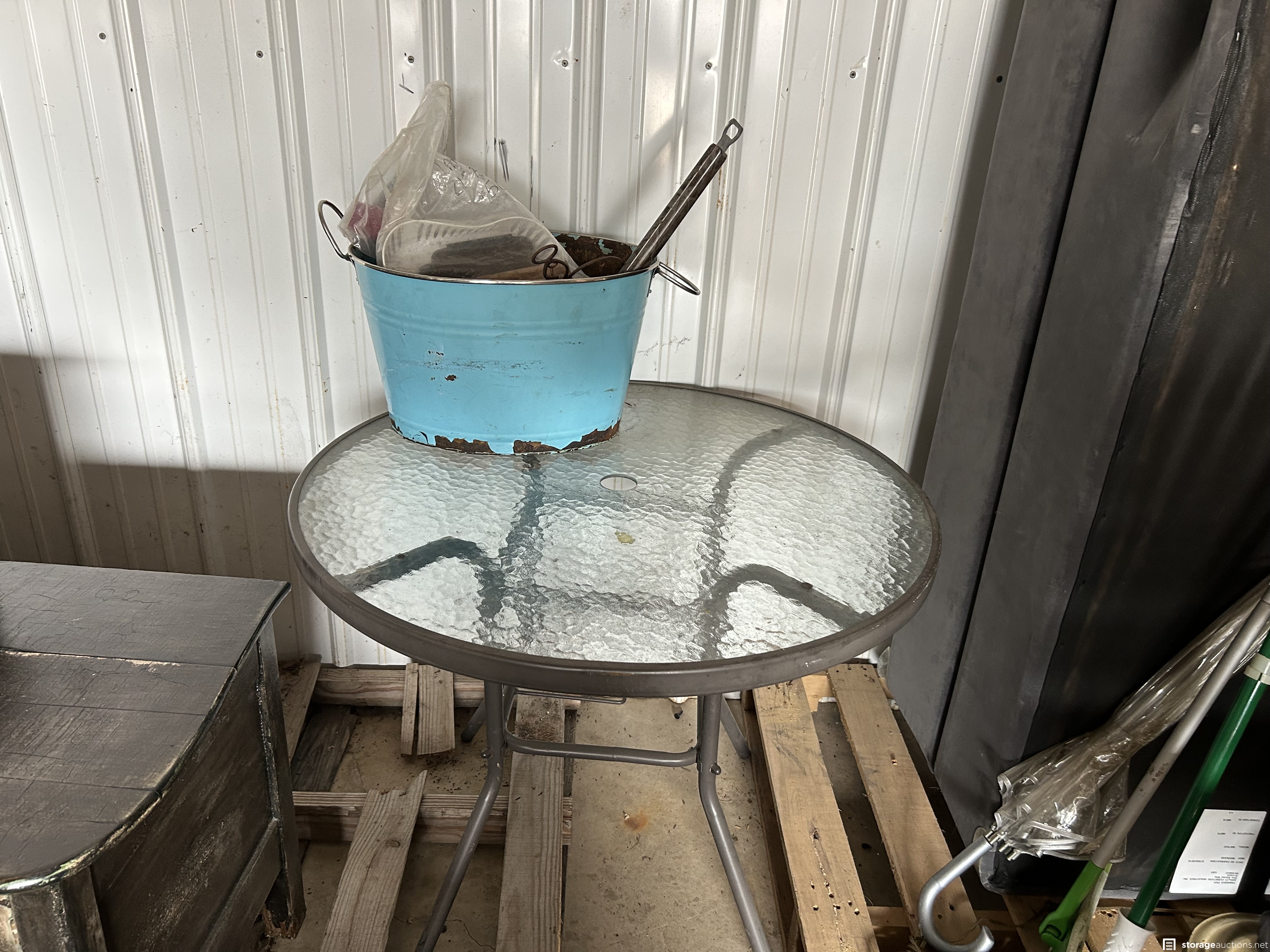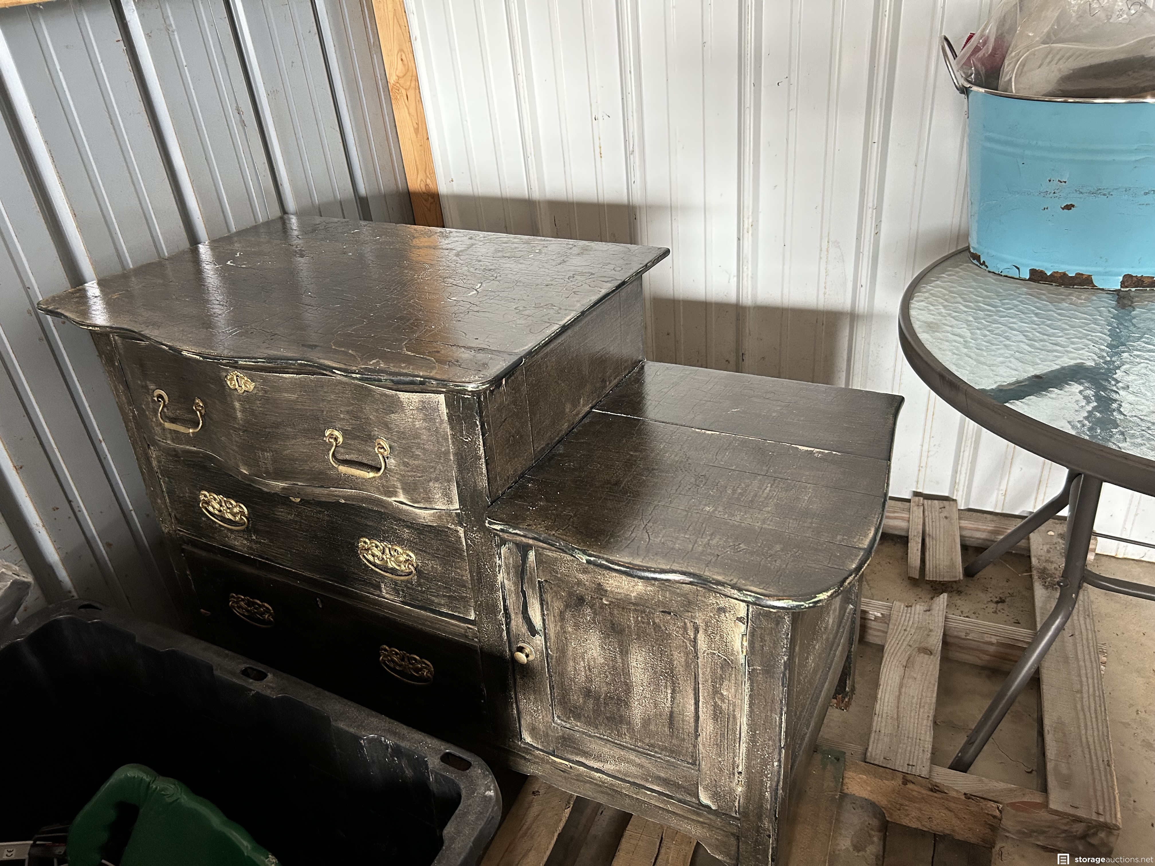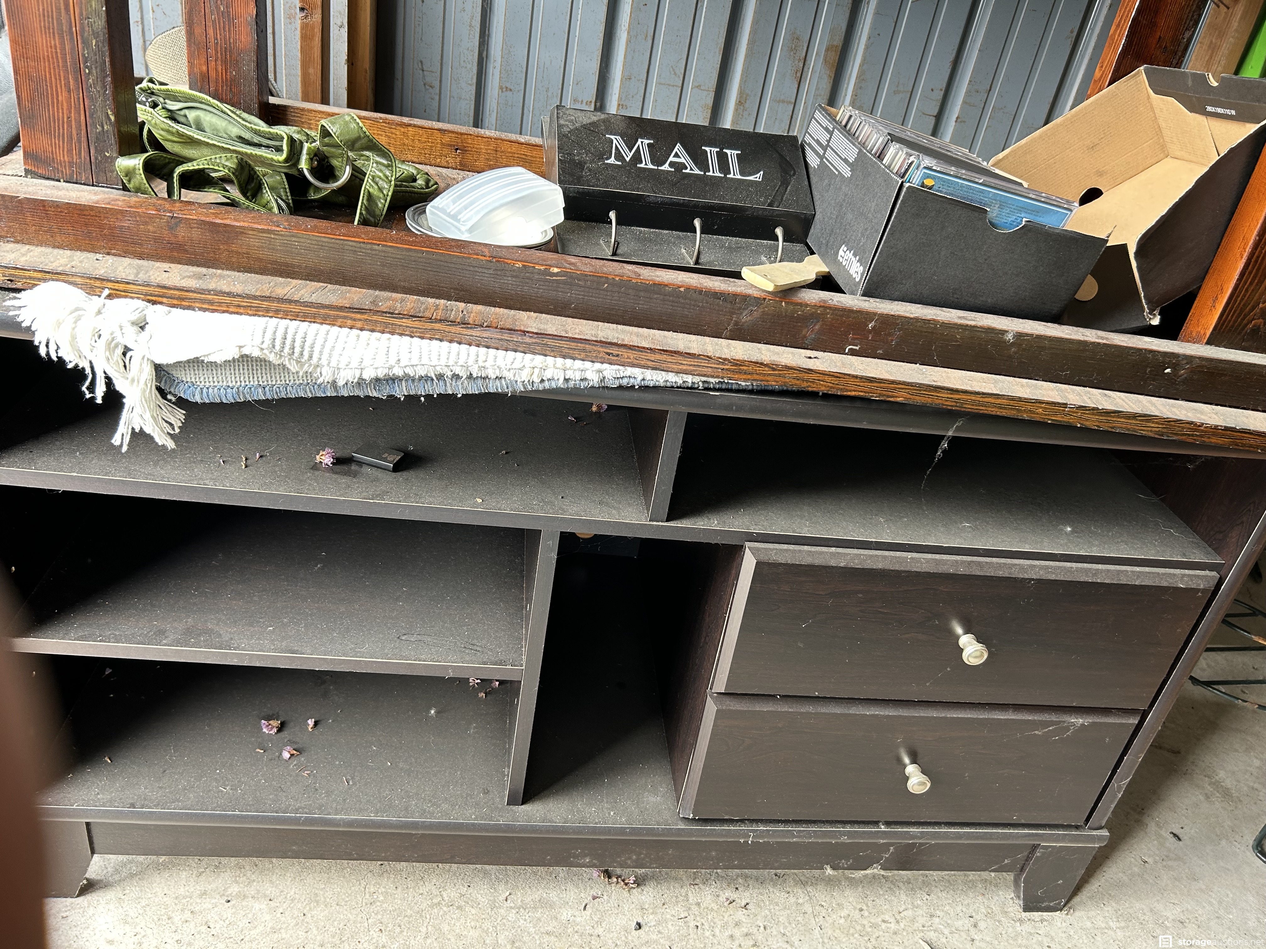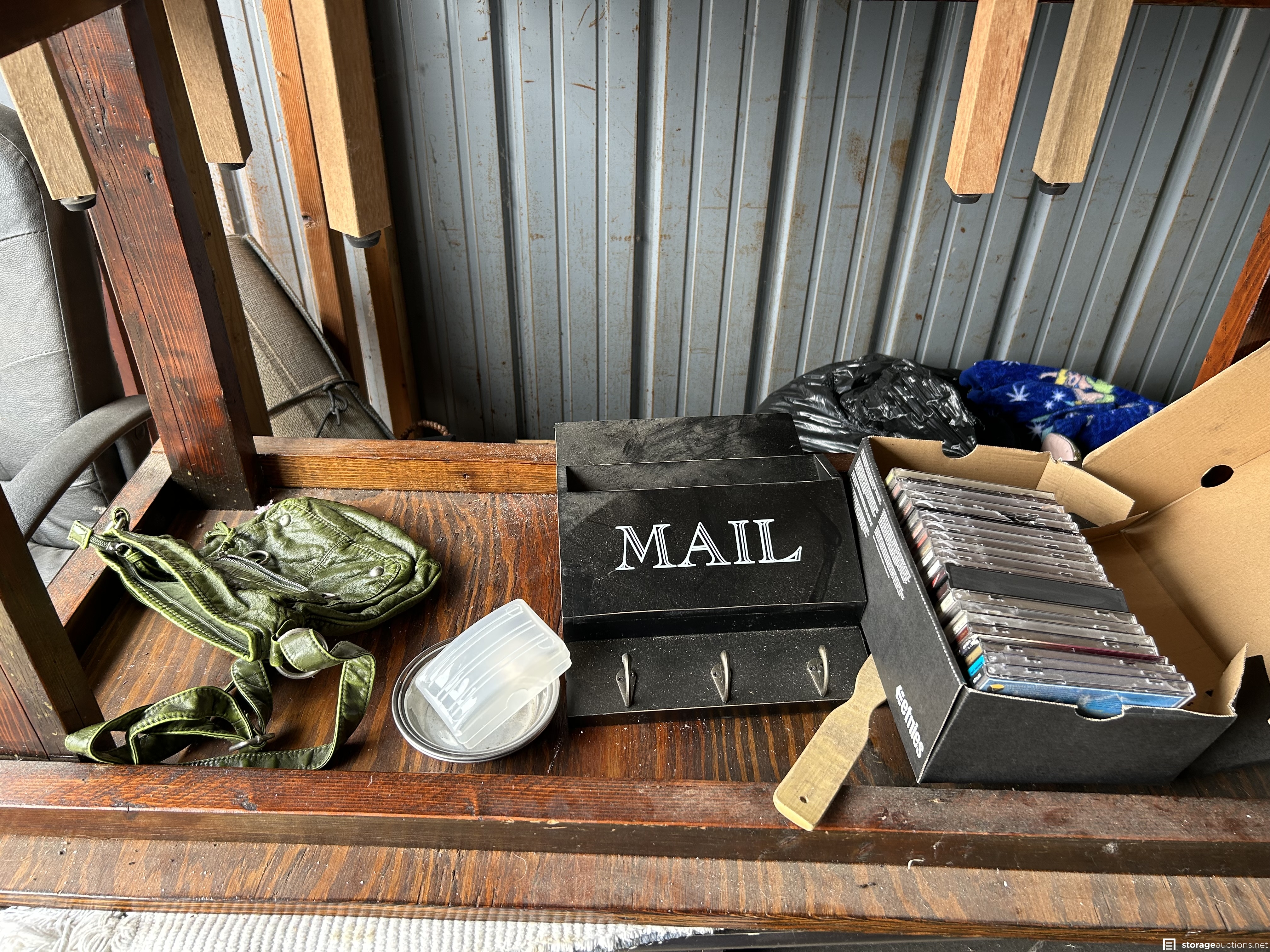 This unit appears to contain a cherry scroll headboard/footboard, garden supplies, outdoor glass-top table, plastic outdoor chairs, 2 kids Adirondack chairs, wood shelf, tv stand,