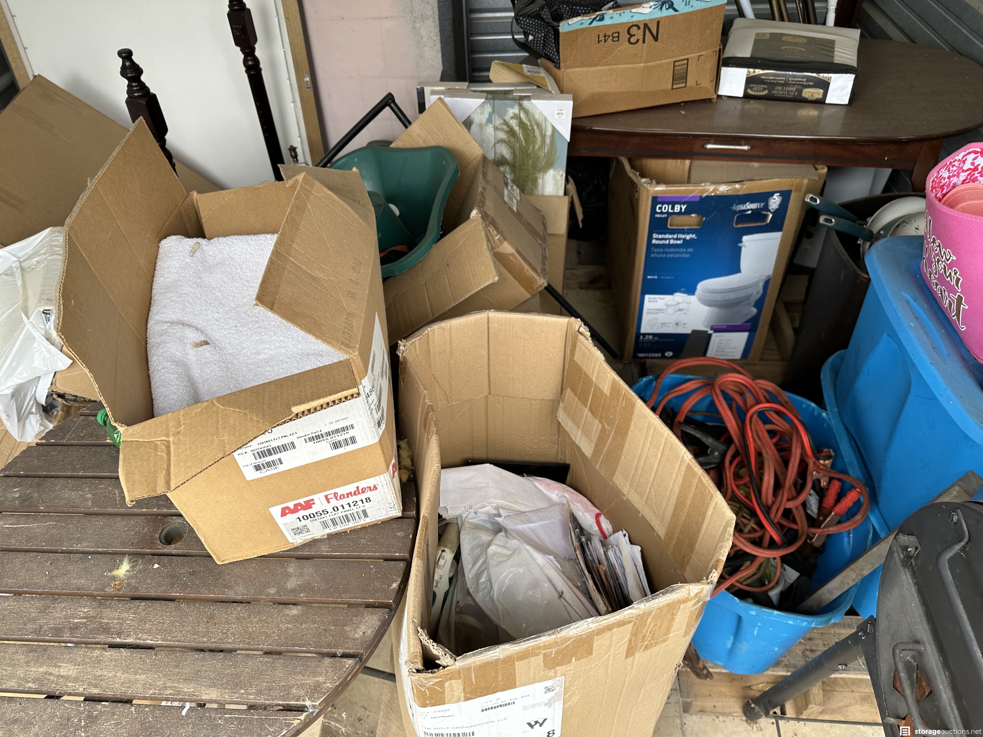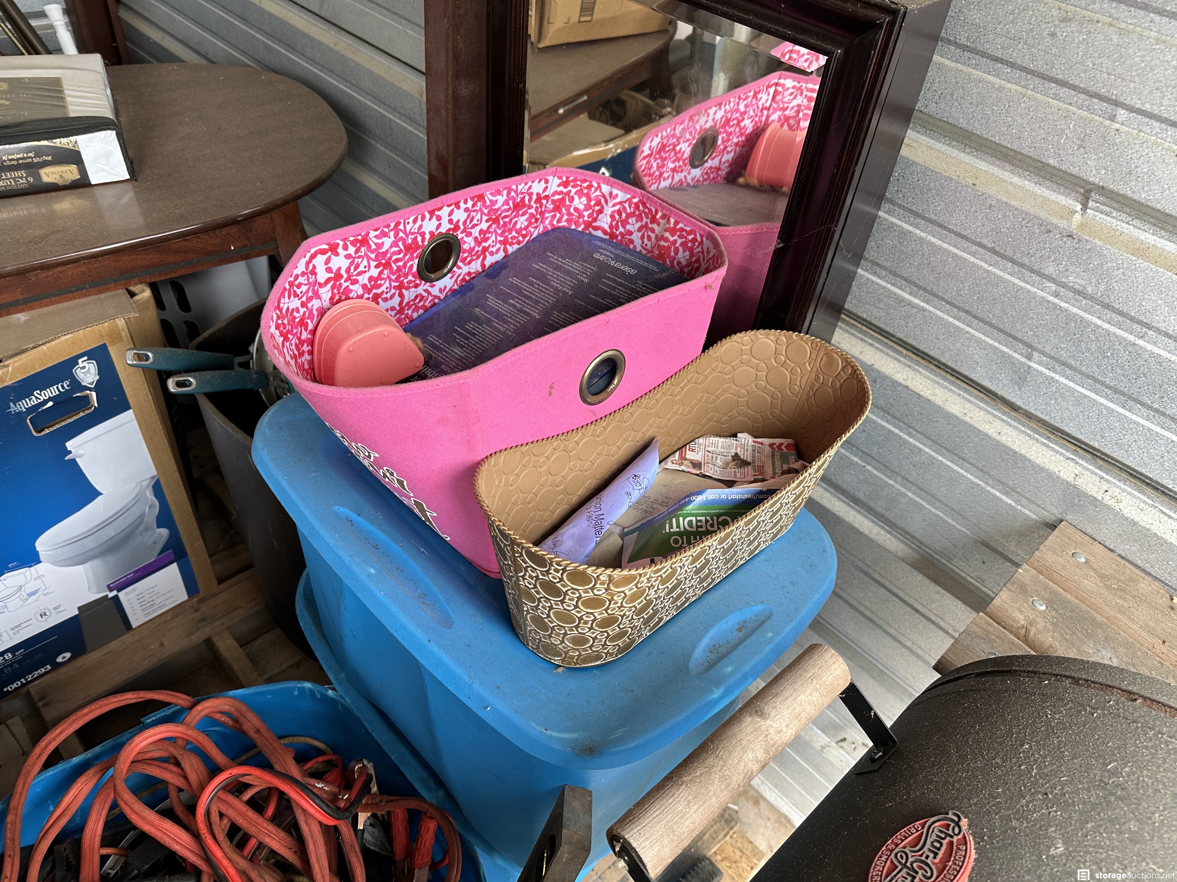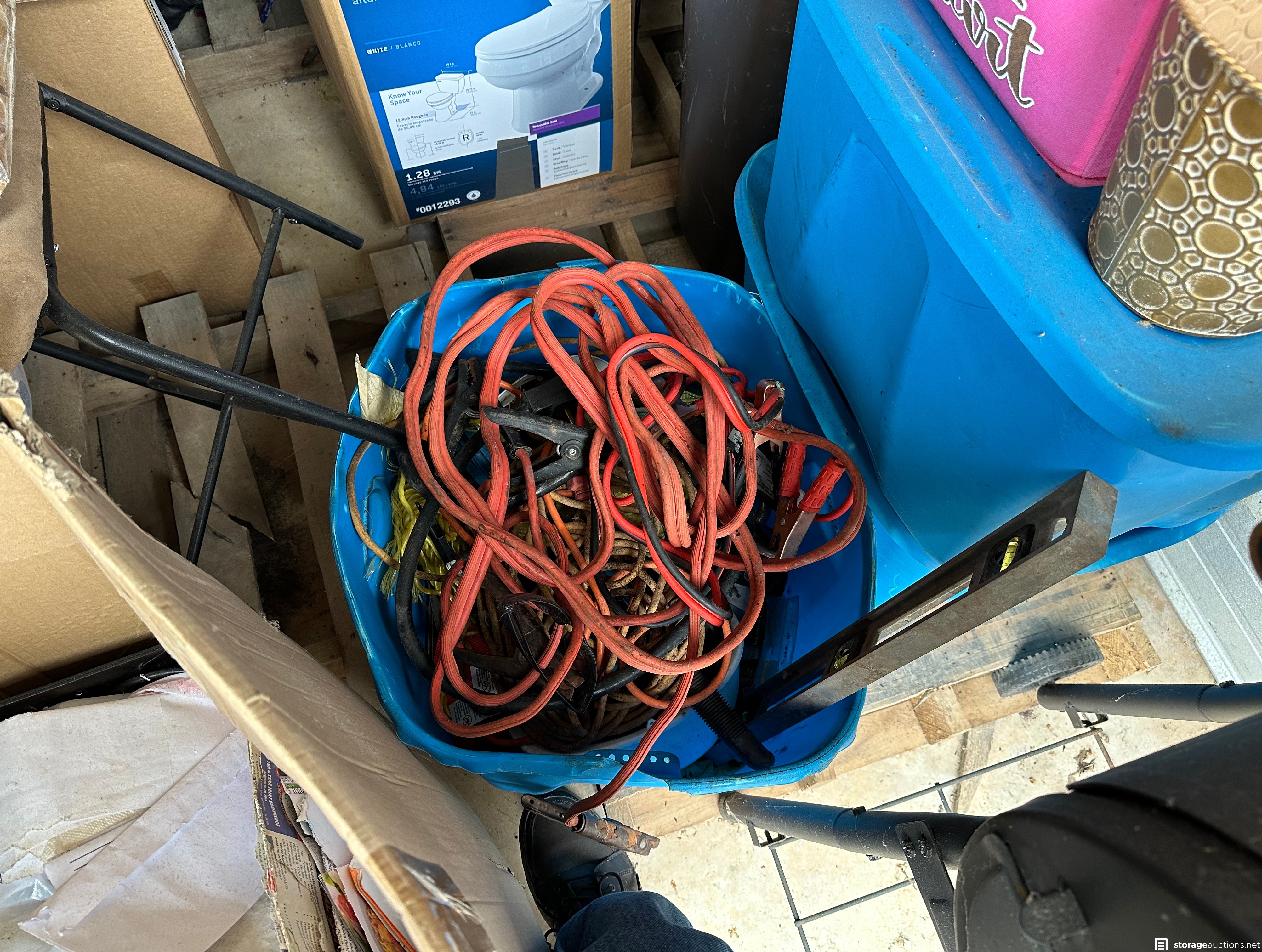 Shovel, Car seat, box spring, bed frame, jumping cables, extension wire, tools, table, CharGriller, kitchen pans, mirror