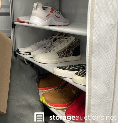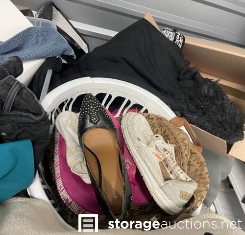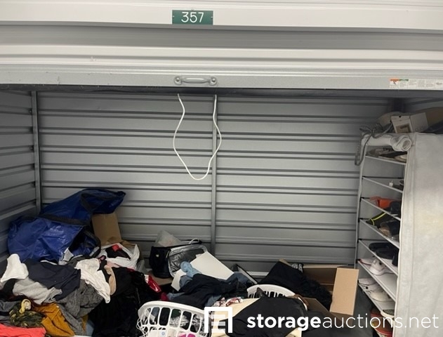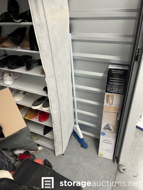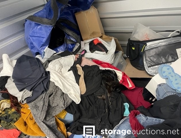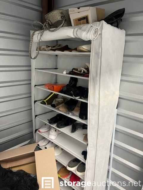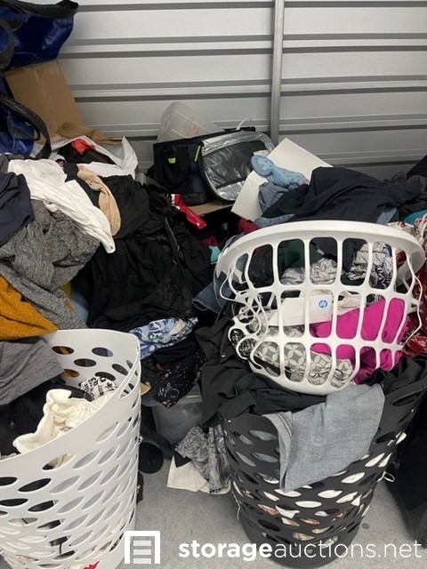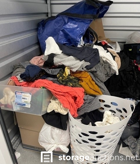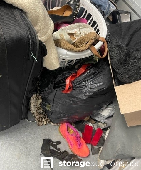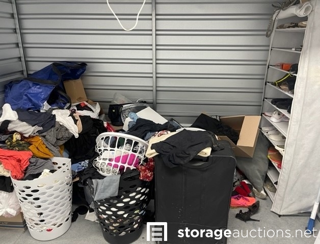 Unit appears to contain clothes, shoes, purses, shoe rack, suit case, baskets, totes, boxes