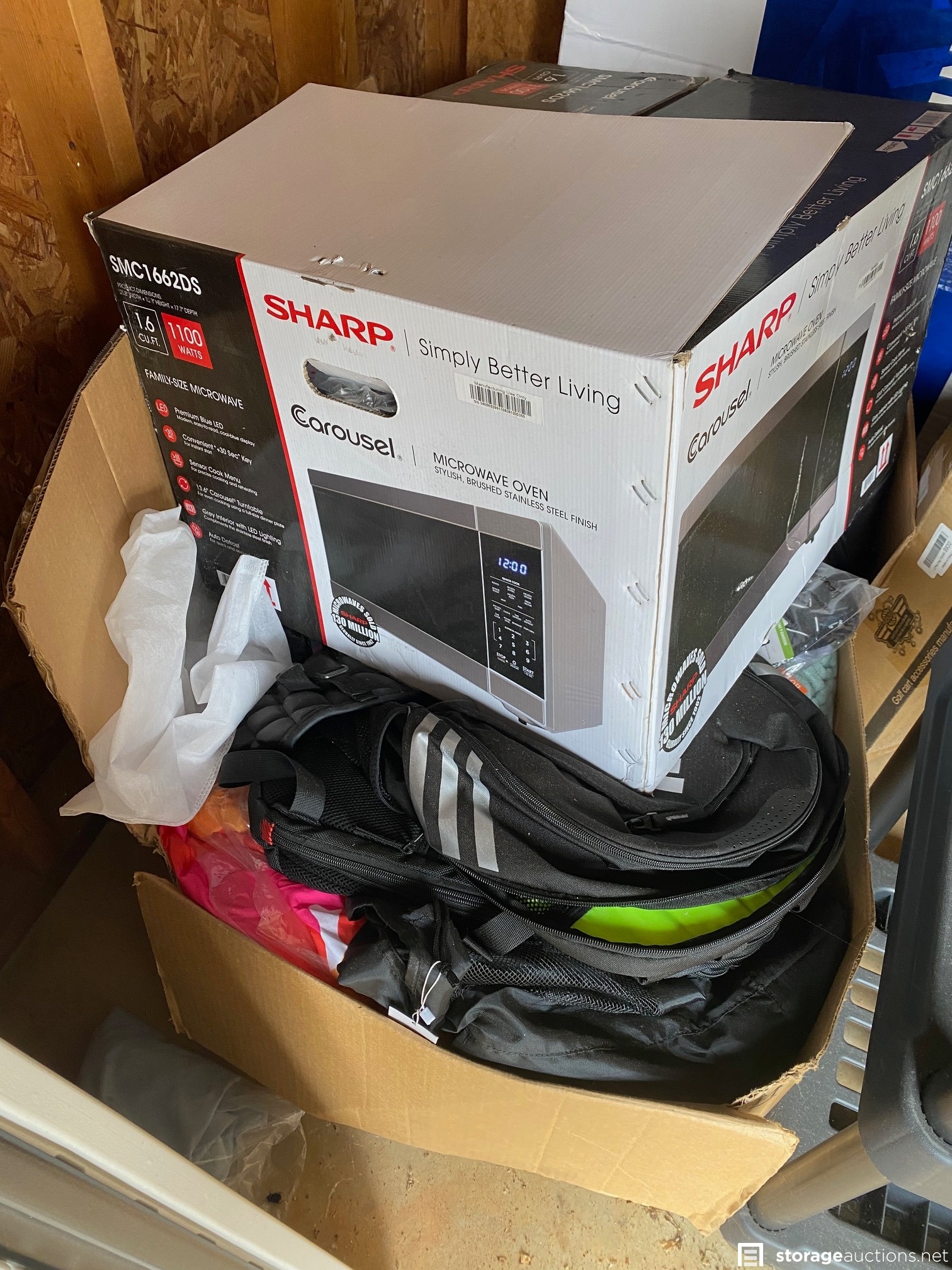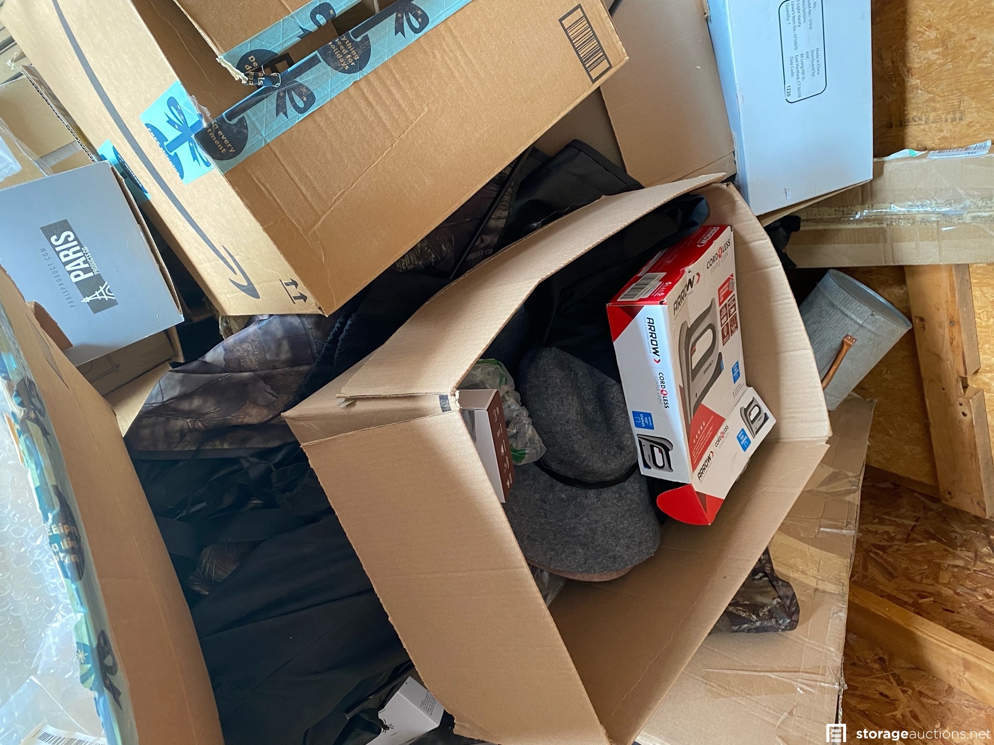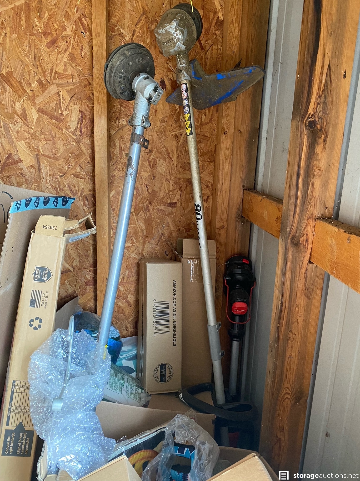 Shelves, tables, microwave, lawncare equipment, tools, household items, clothes, etc
