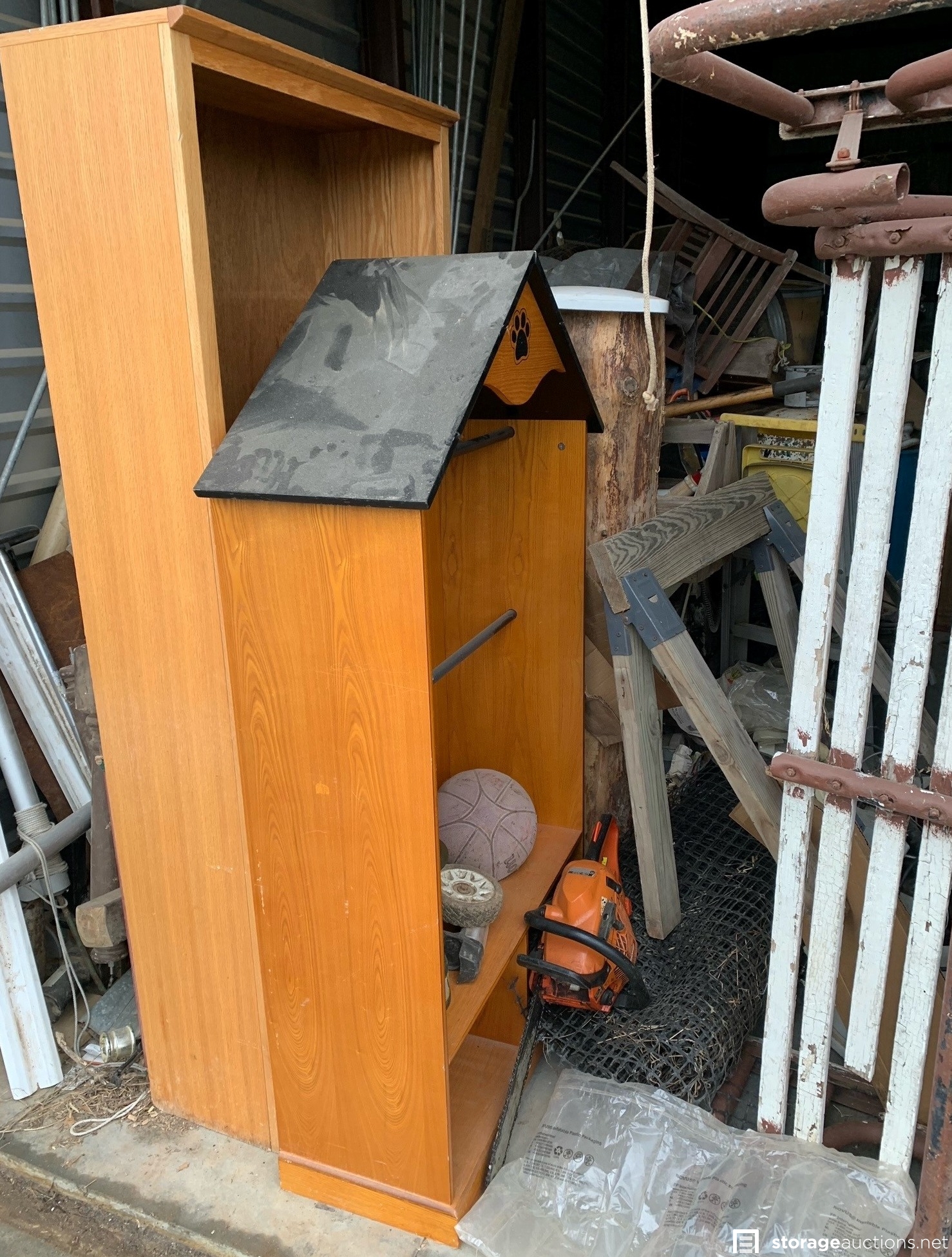 Miscellaneous electric tools, wood burning stoves, furniture, ladder, fence, tires, wheelchair, metal piping, lawn equipment, electronics, luggage, small snow blower, propane heater, and chainsaws.