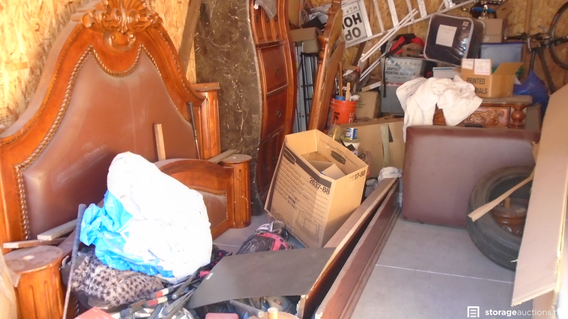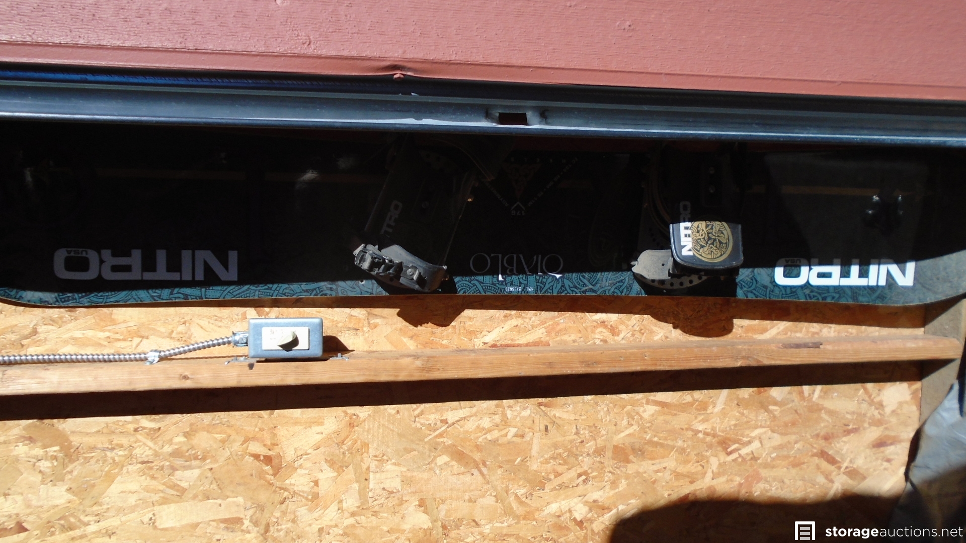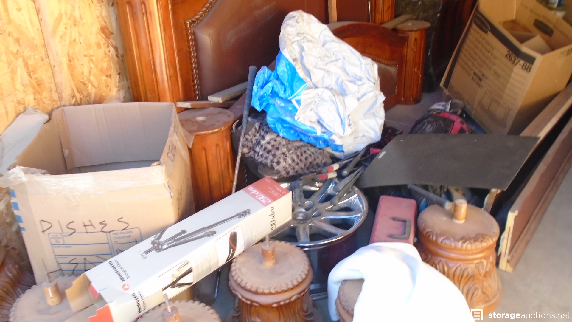 Unit appears to contain: Nitro Snow Board, BMW rim, Bumper cover and rocker covers, golf clubs, wooden headboard and footboard, massage table, tools, ladder and 15+boxes