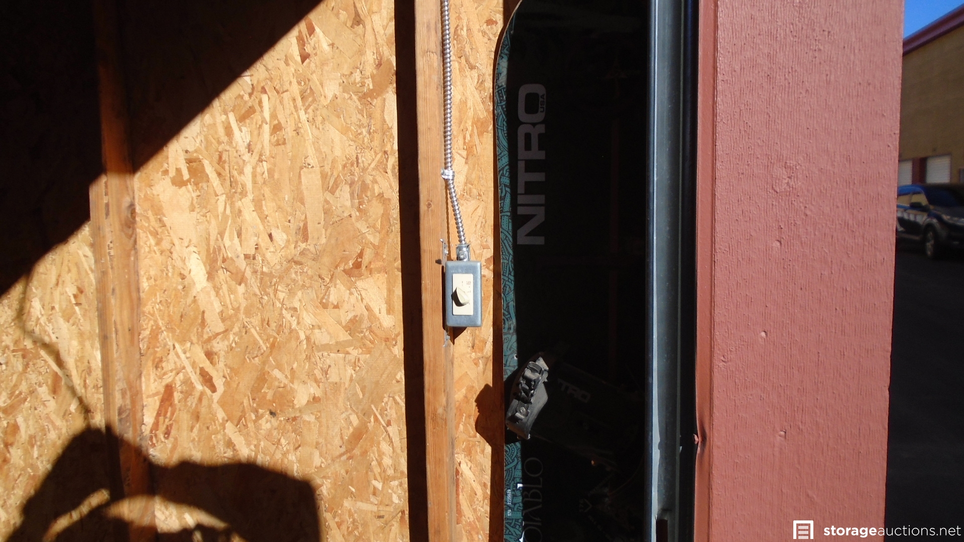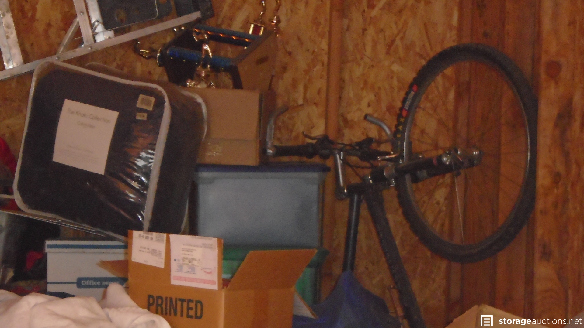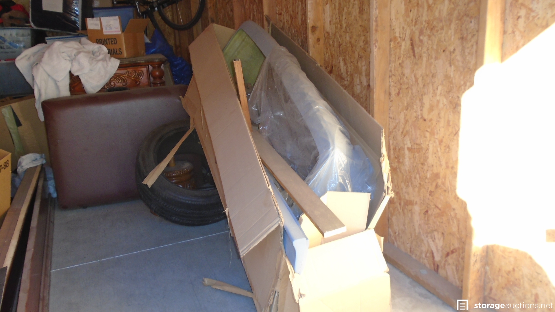 Unit appears to contain: Nitro Snow Board, BMW rim, Bumper cover and rocker covers, golf clubs, wooden headboard and footboard, massage table, tools, ladder and 15+boxes