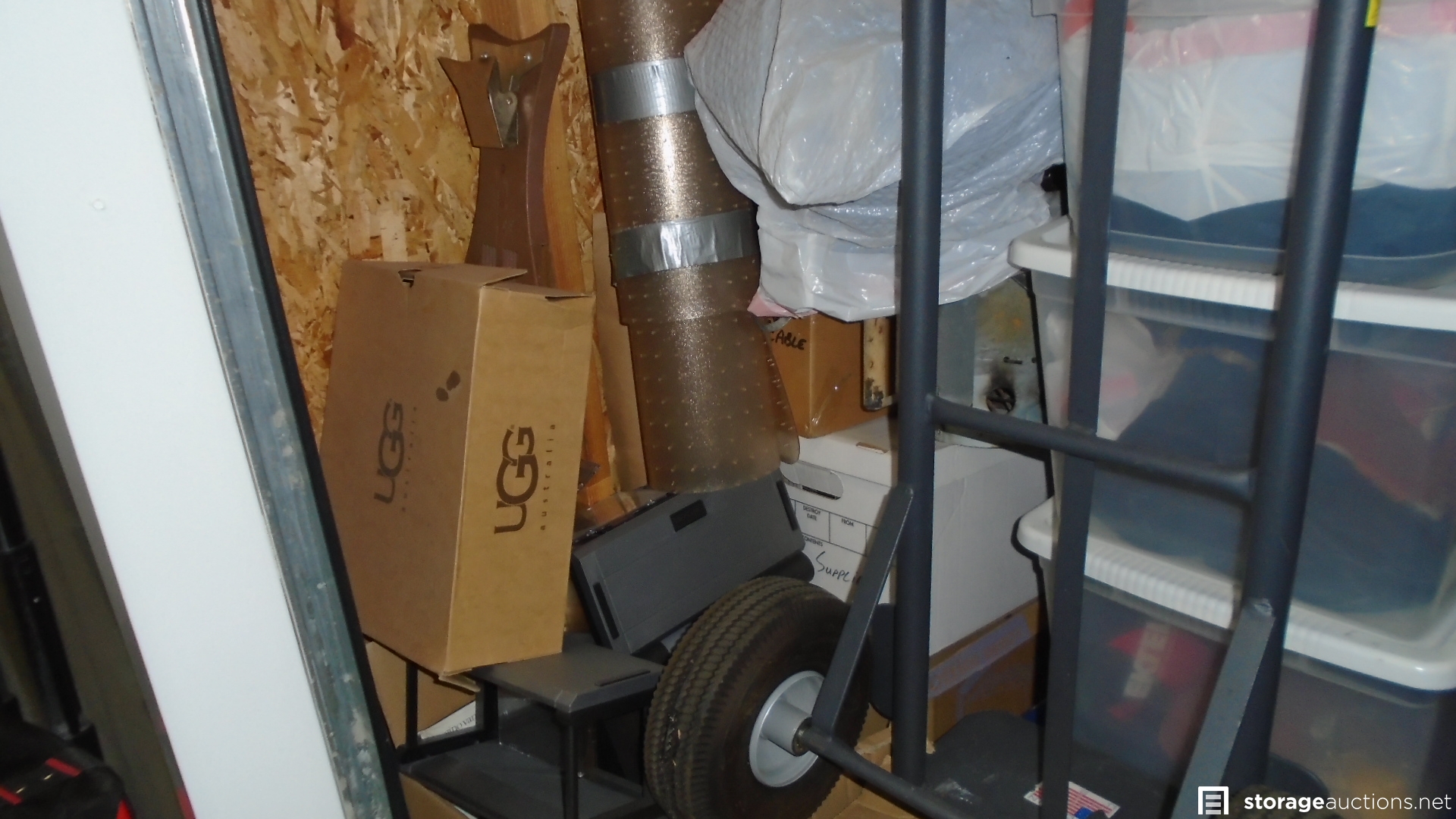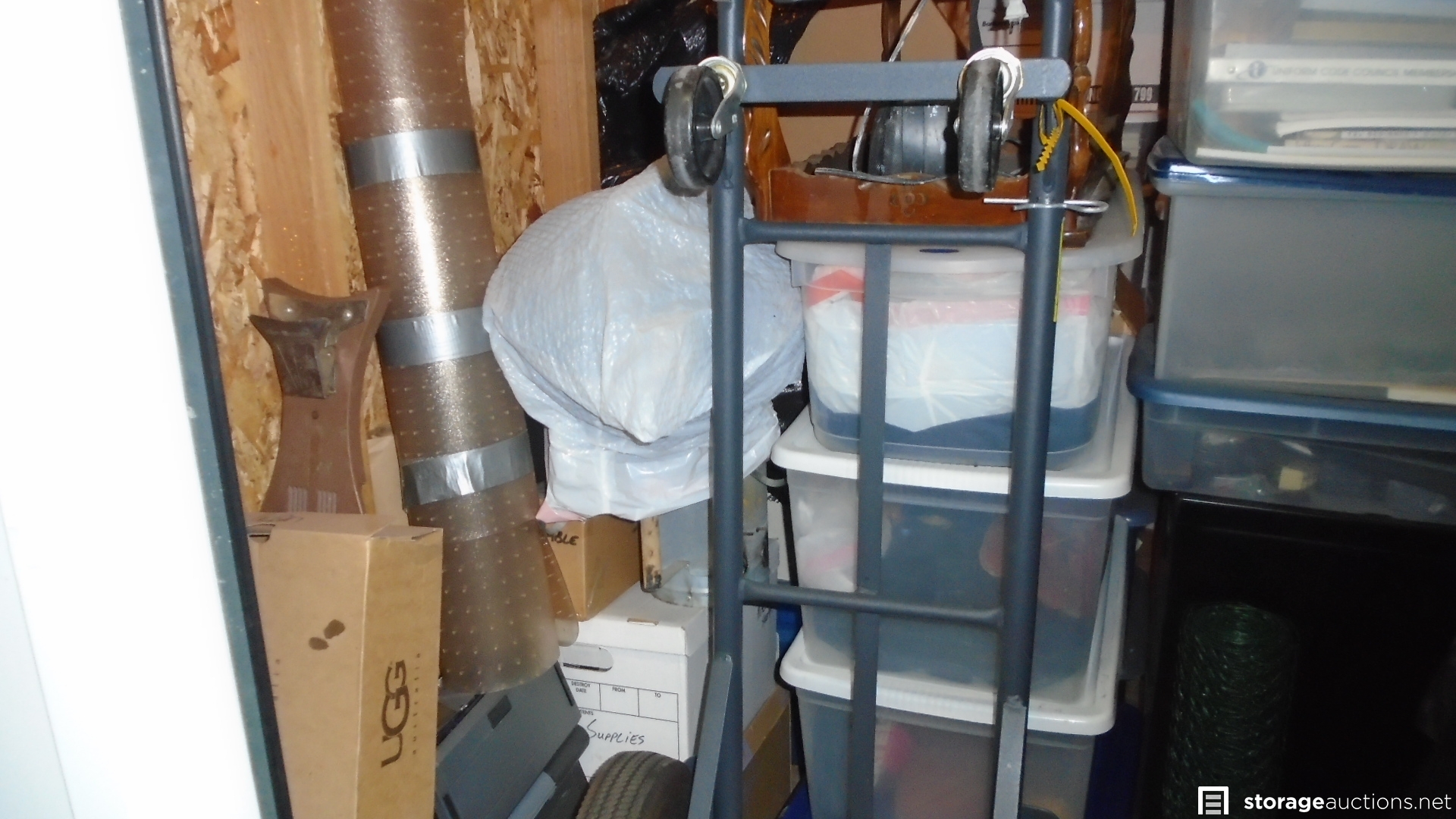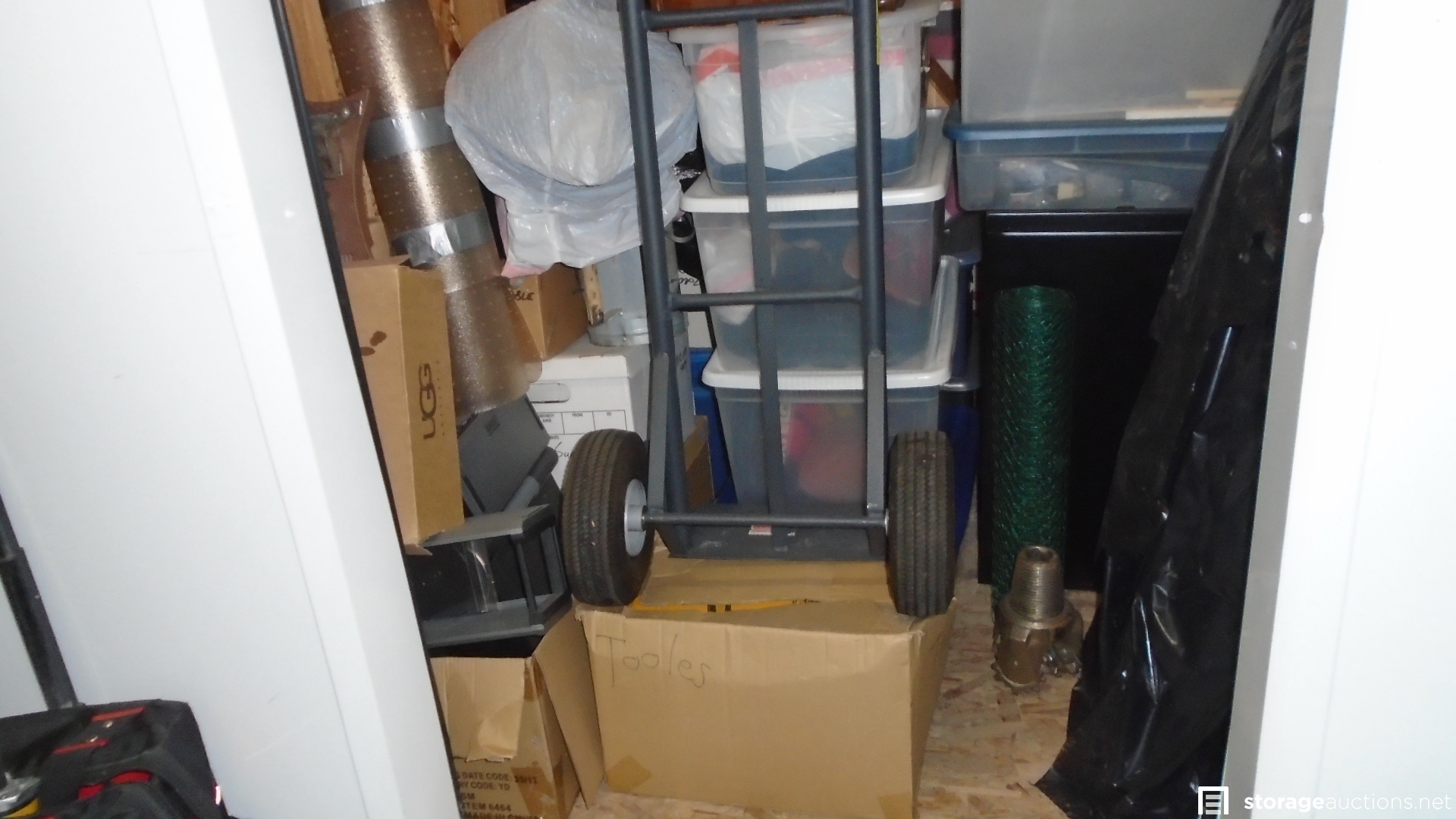 Unit appears to containg:30 totes, dolly, Uggs, tools, Rock Drill bit