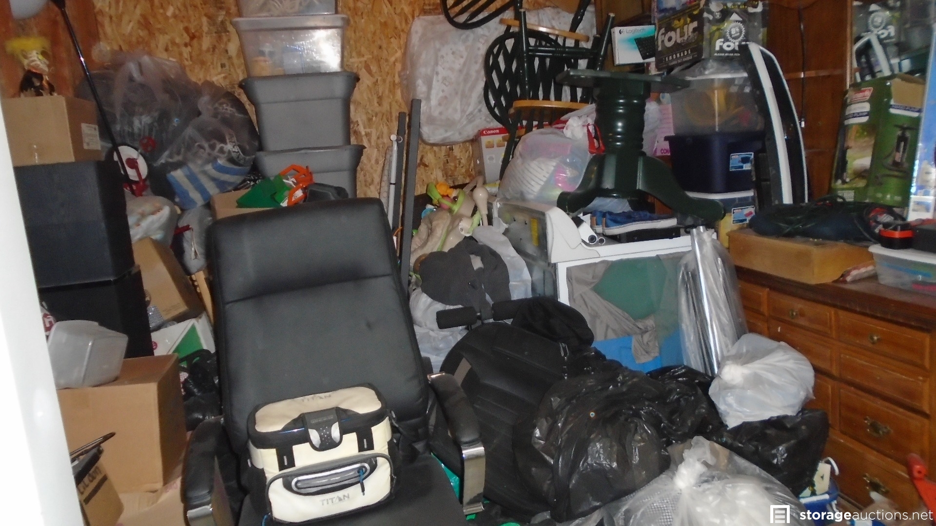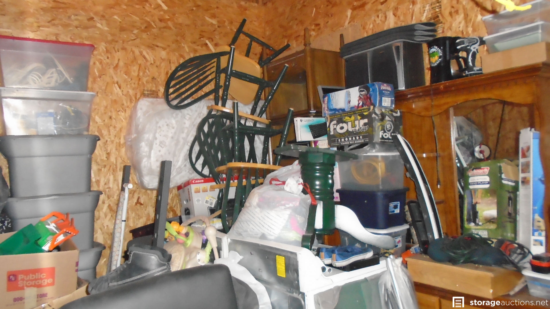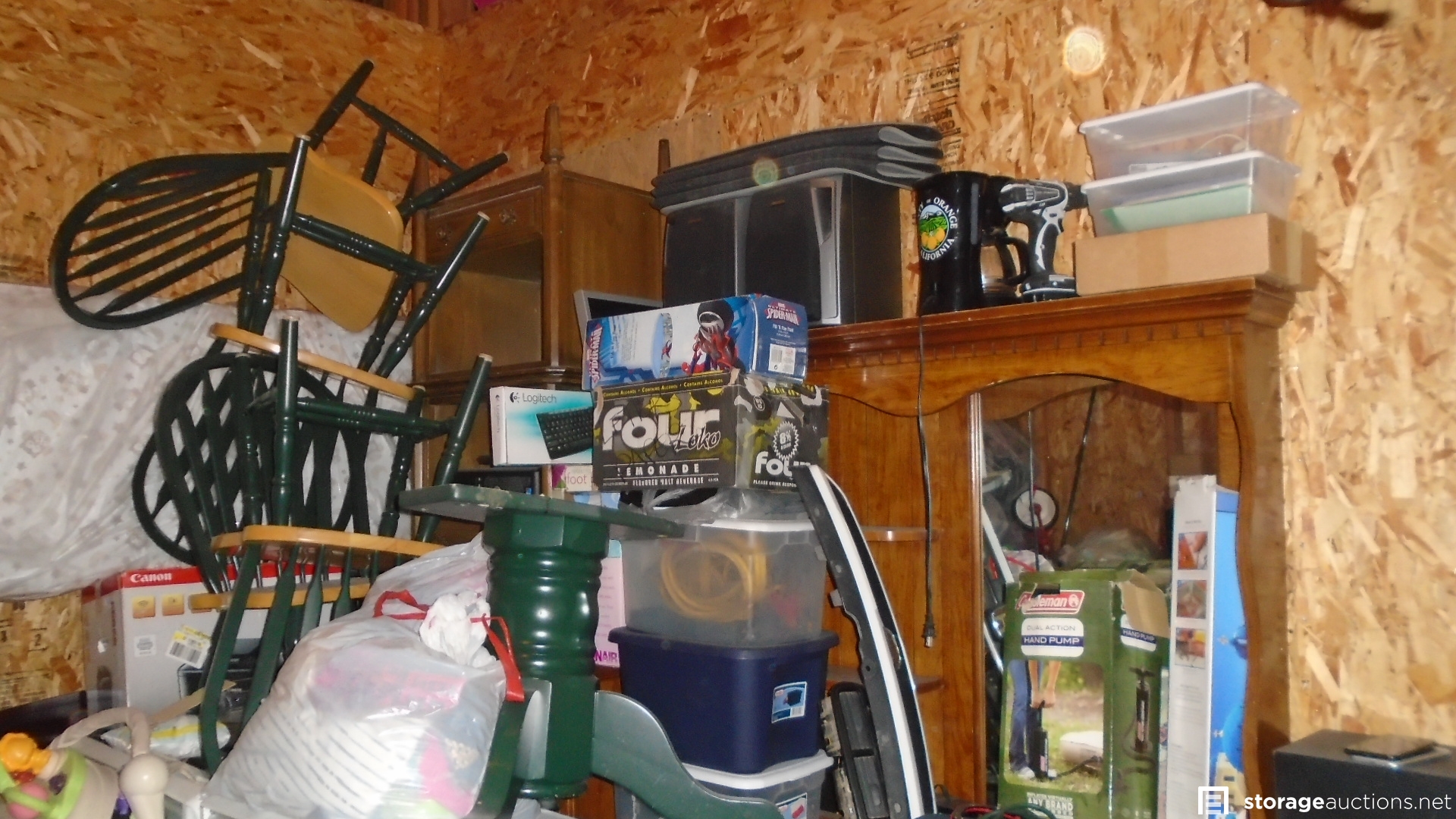 Unit appears to contain: Washer and Dryer, tools, mirror, dresser, End tables, electronics, table and chairs, weight bench, speakers, artwork, kids toys and 20+ boxes