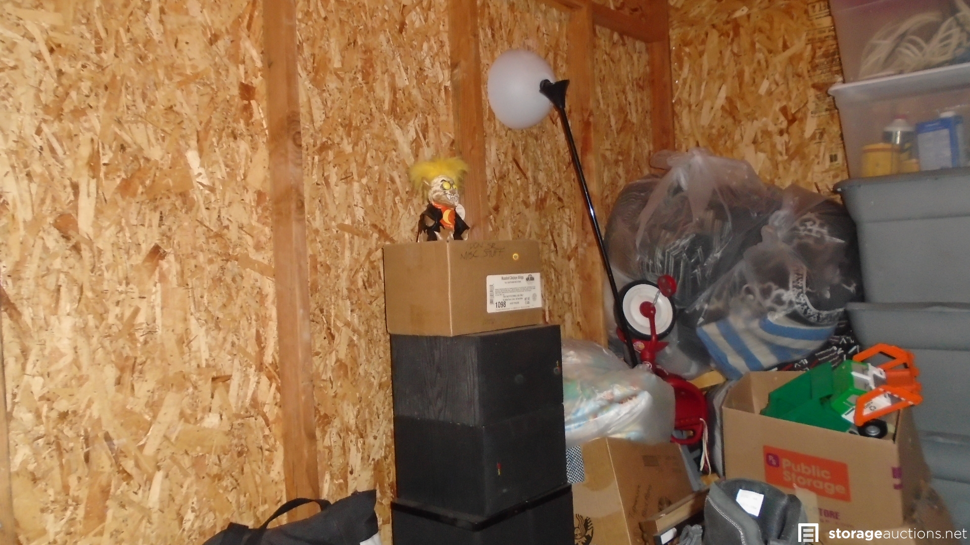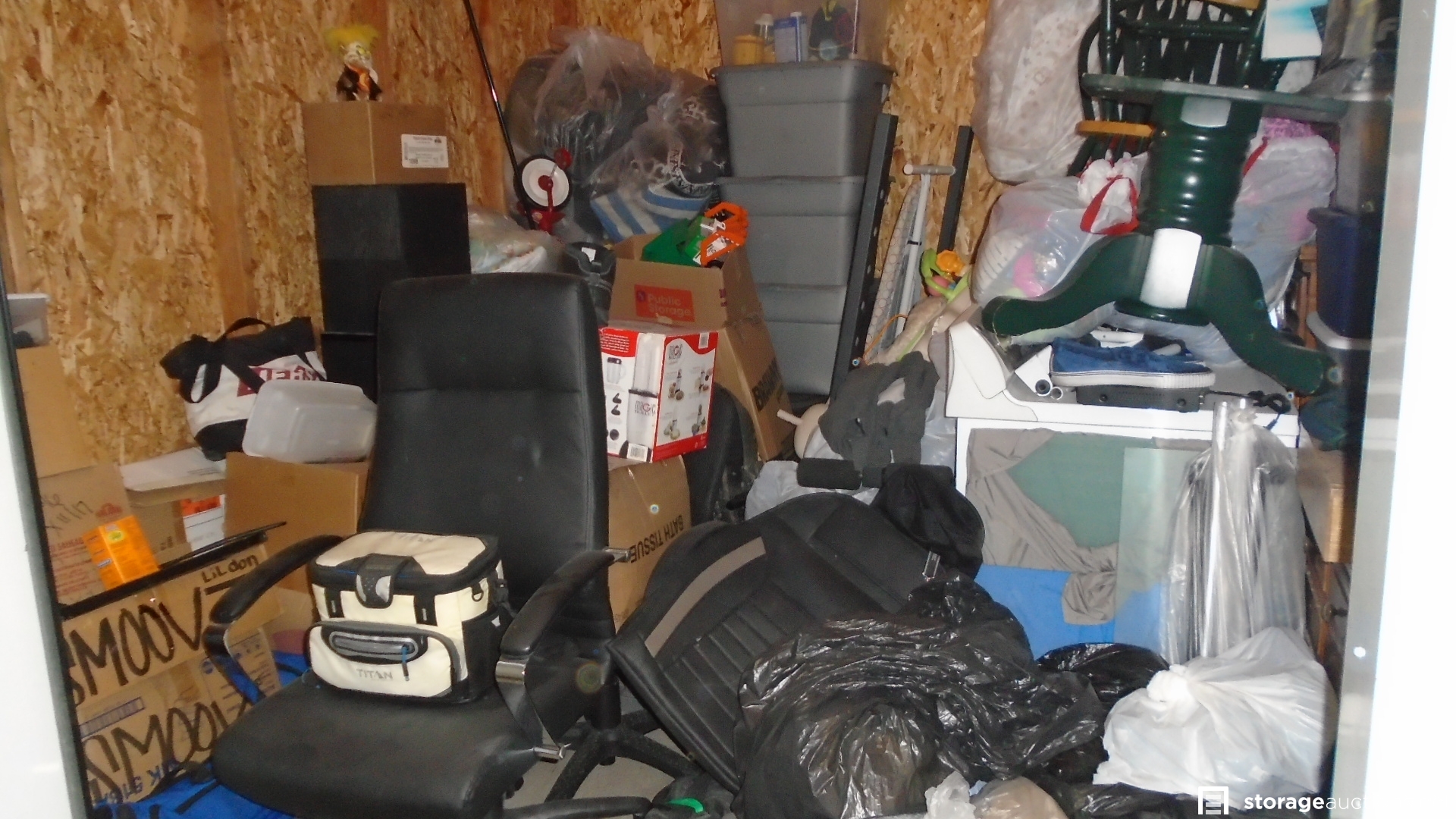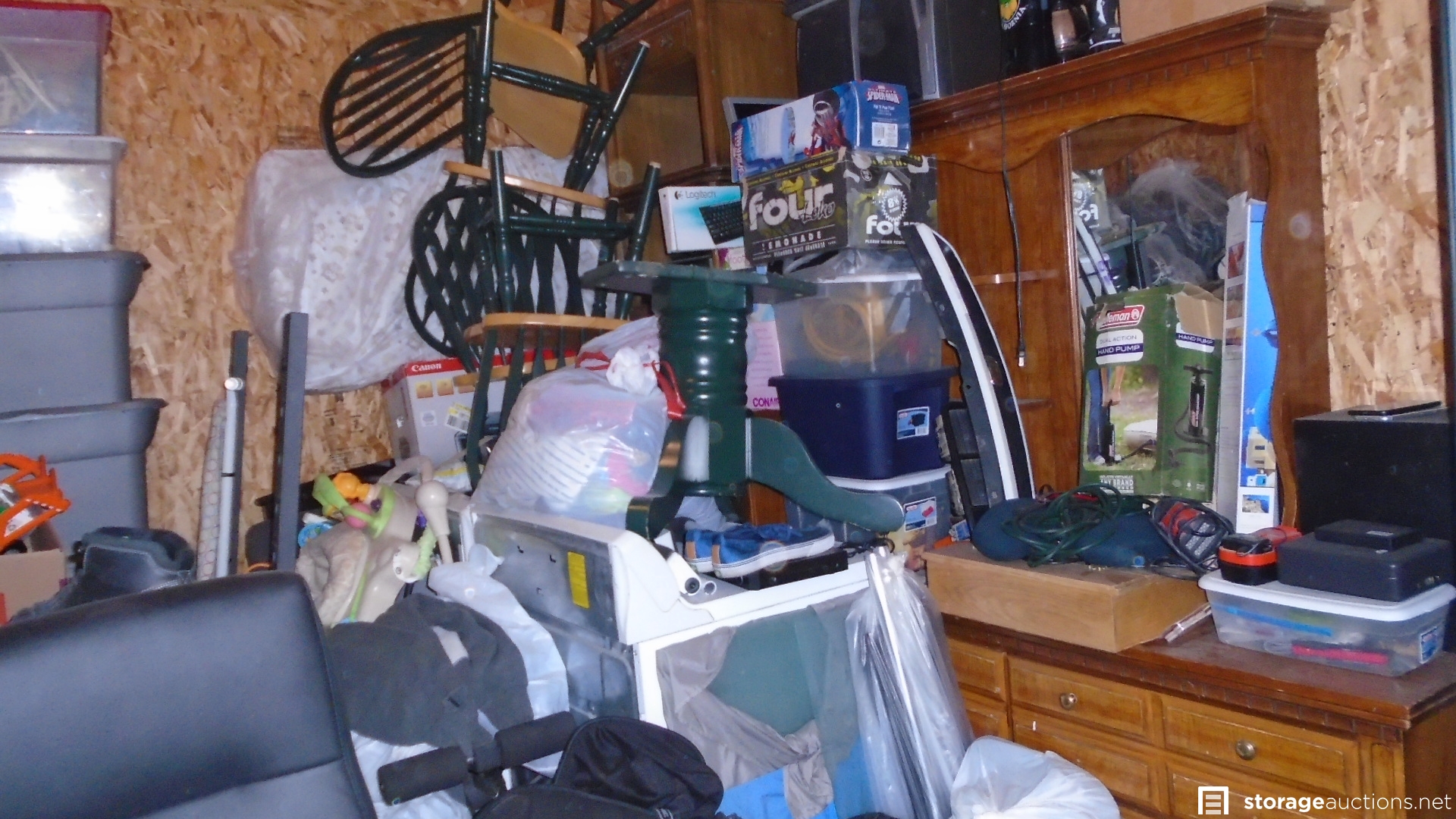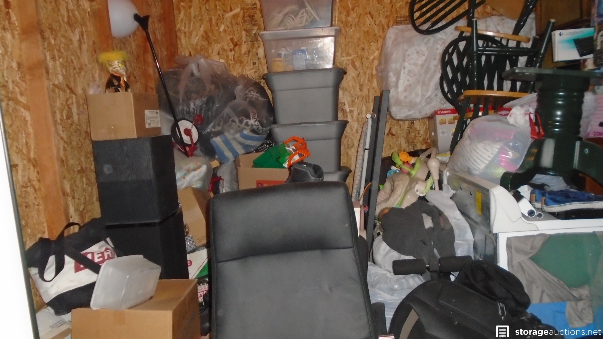 Unit appears to contain: Washer and Dryer, tools, mirror, dresser, End tables, electronics, table and chairs, weight bench, speakers, artwork, kids toys and 20+ boxes
