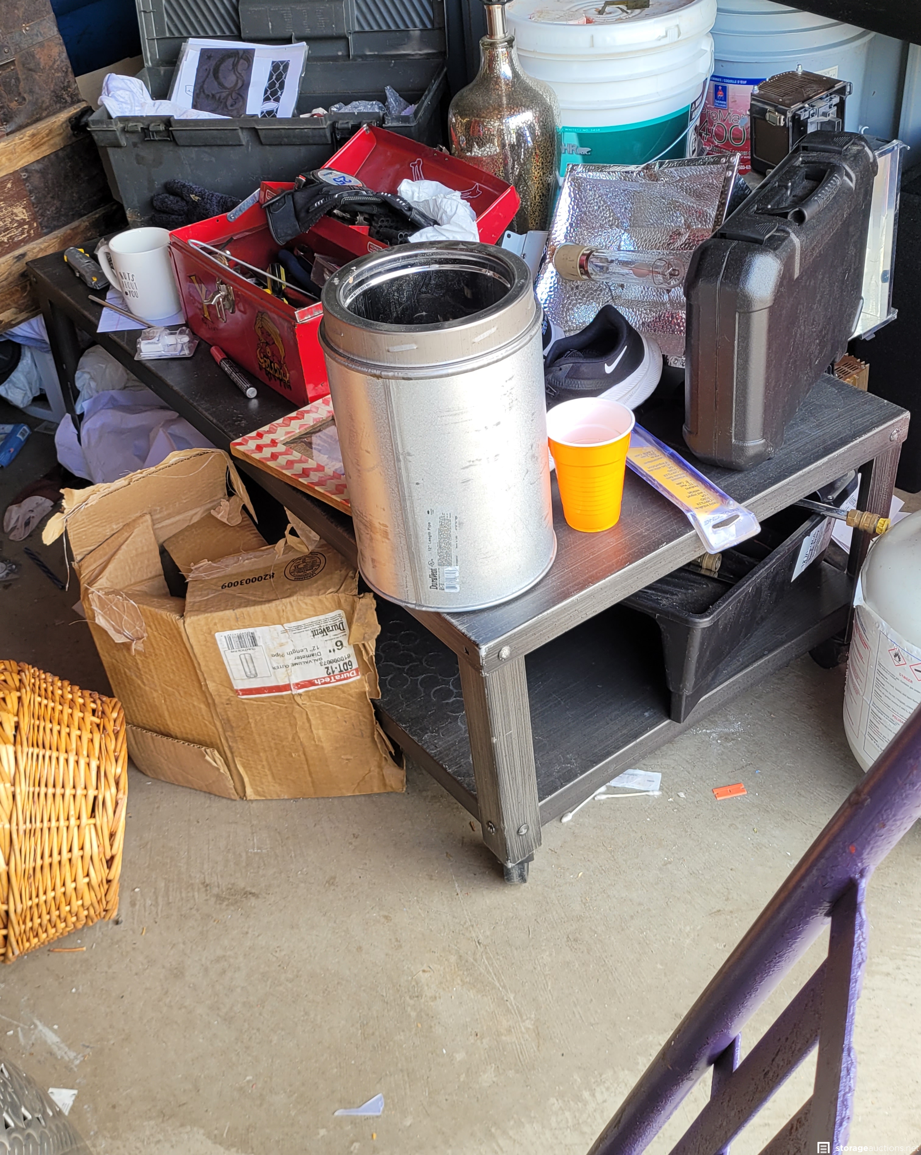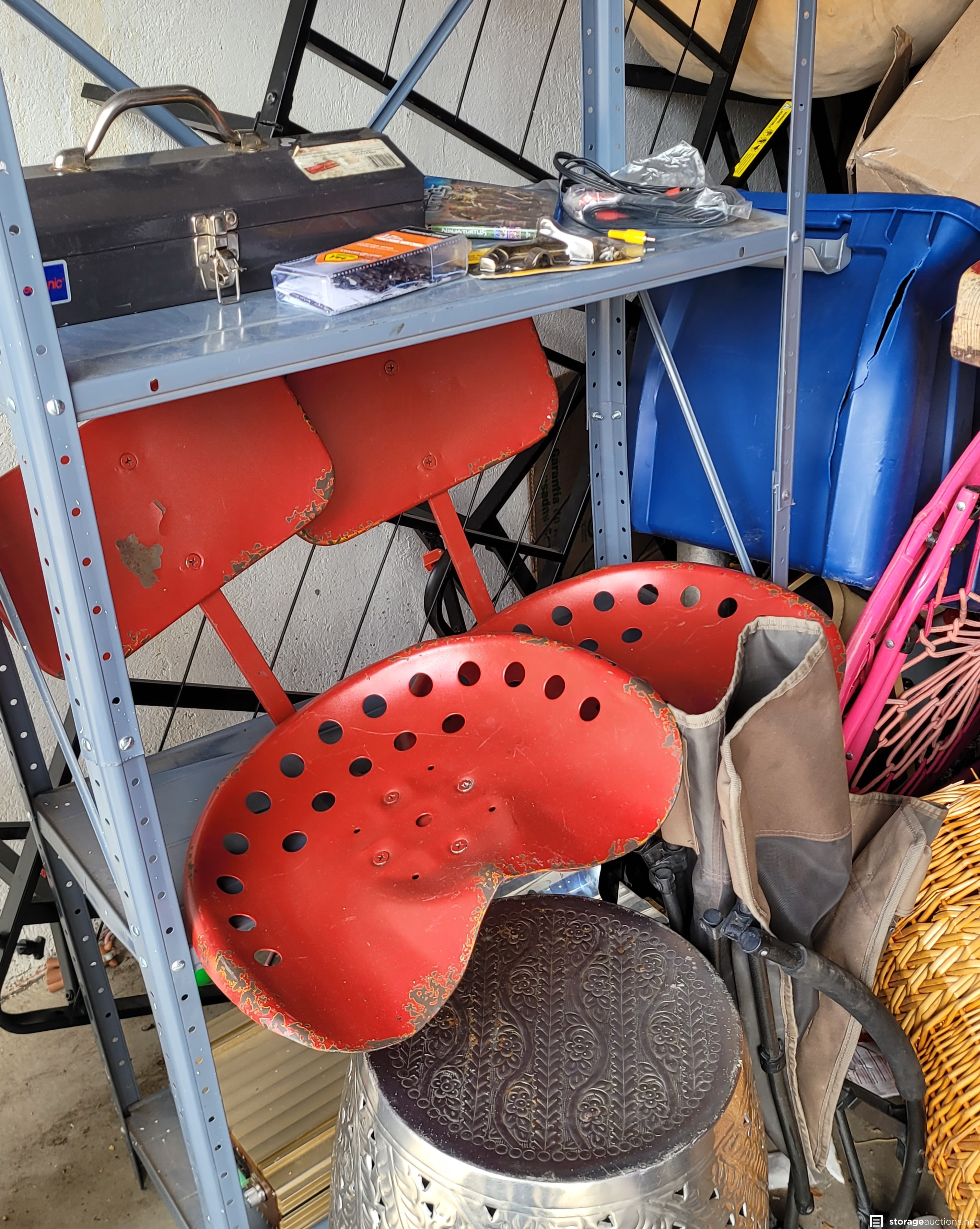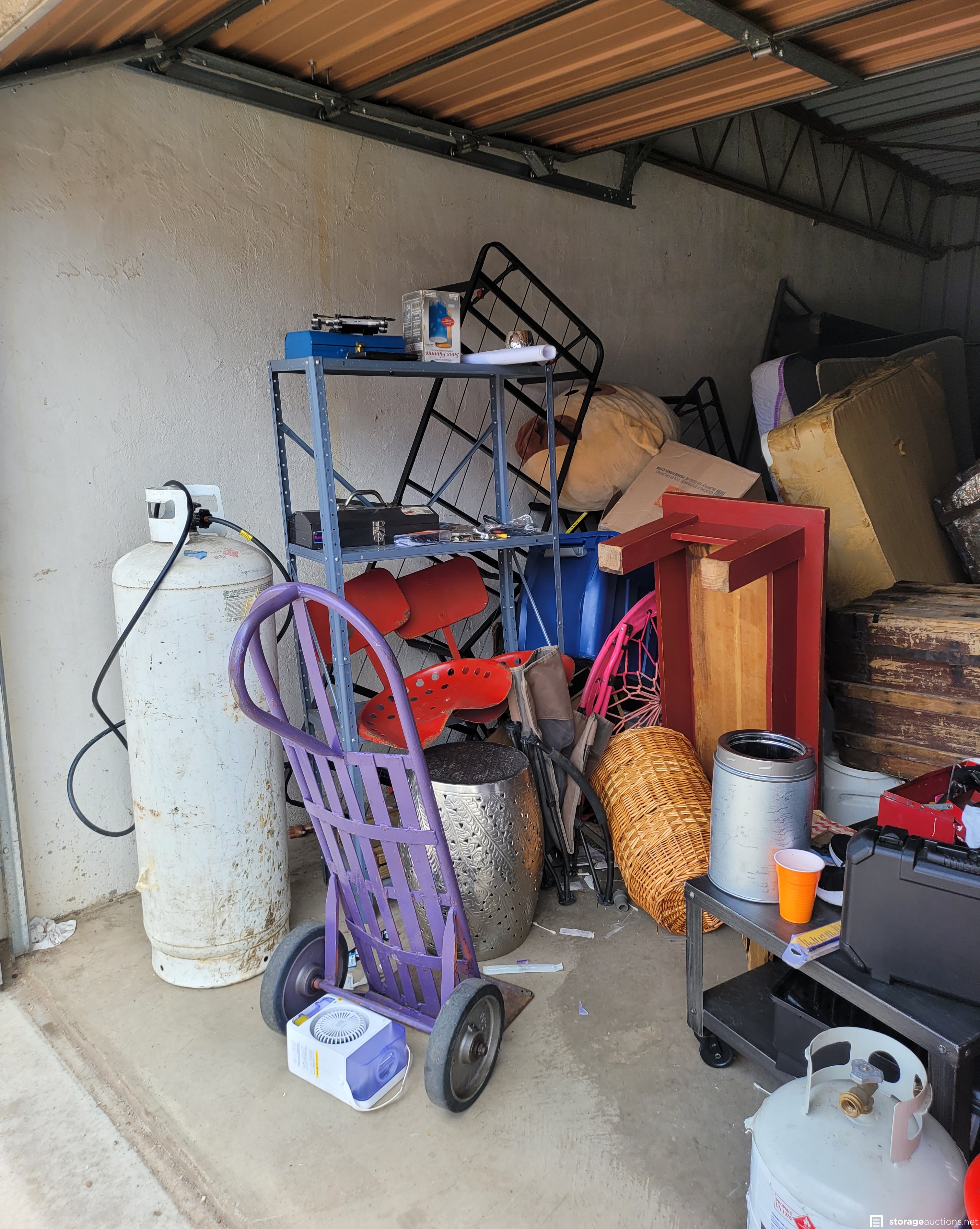 Tractor seats, old wooden trunks, tool boxes, metal dolly, metal shelve, Speaker boxes, rolling metal project table, Misc Household items, toys, tools, clothes, propane tank and with weed torch.