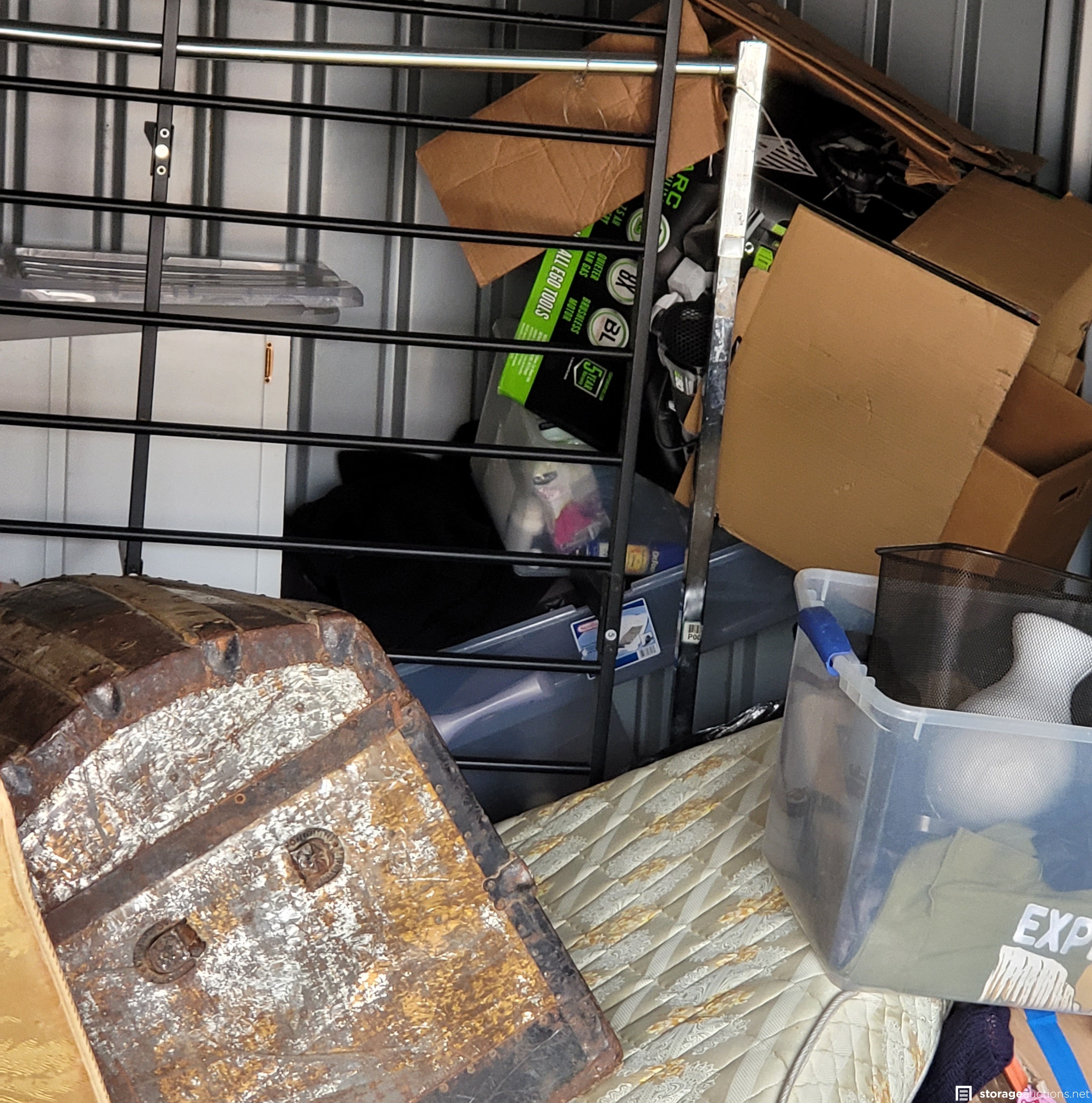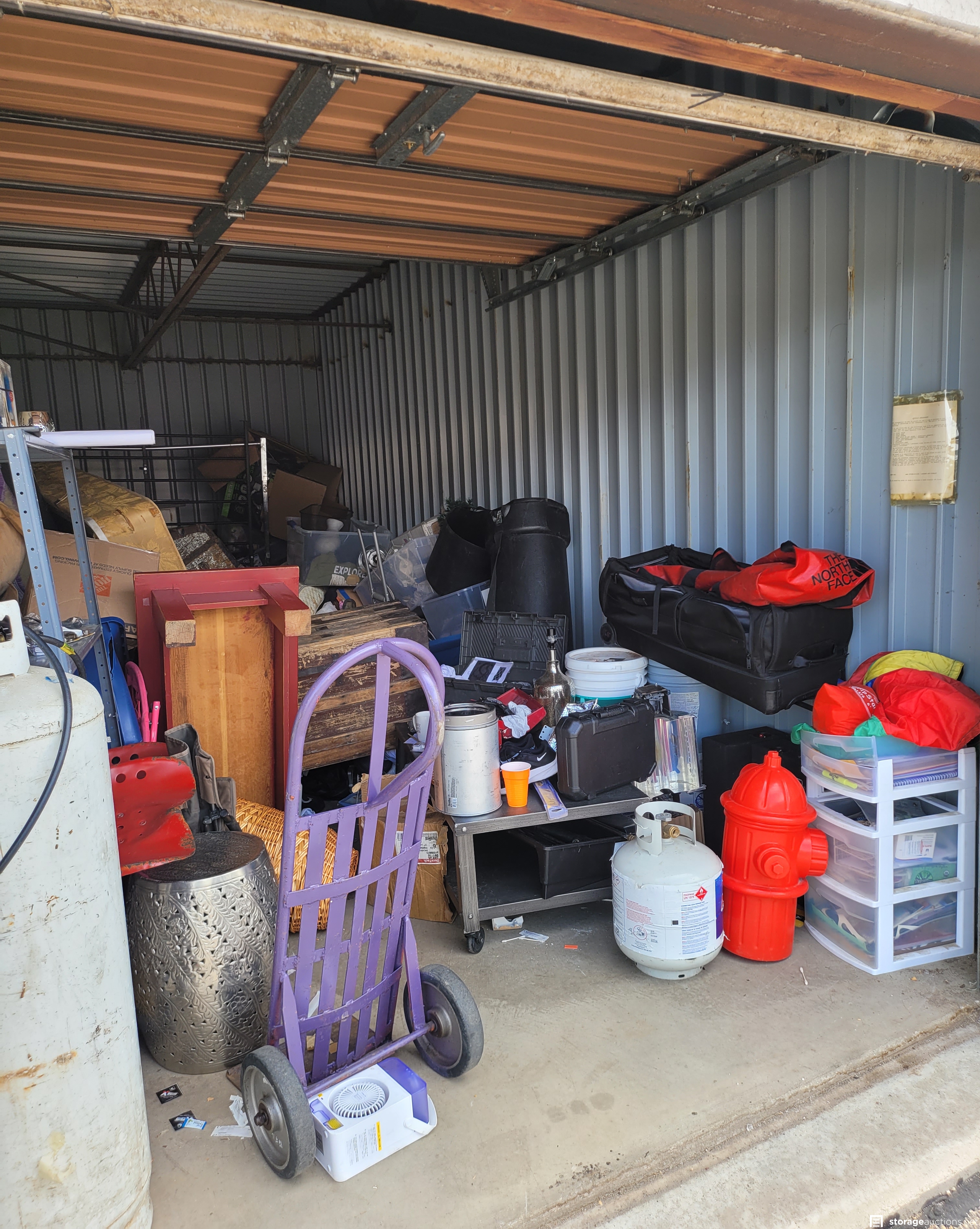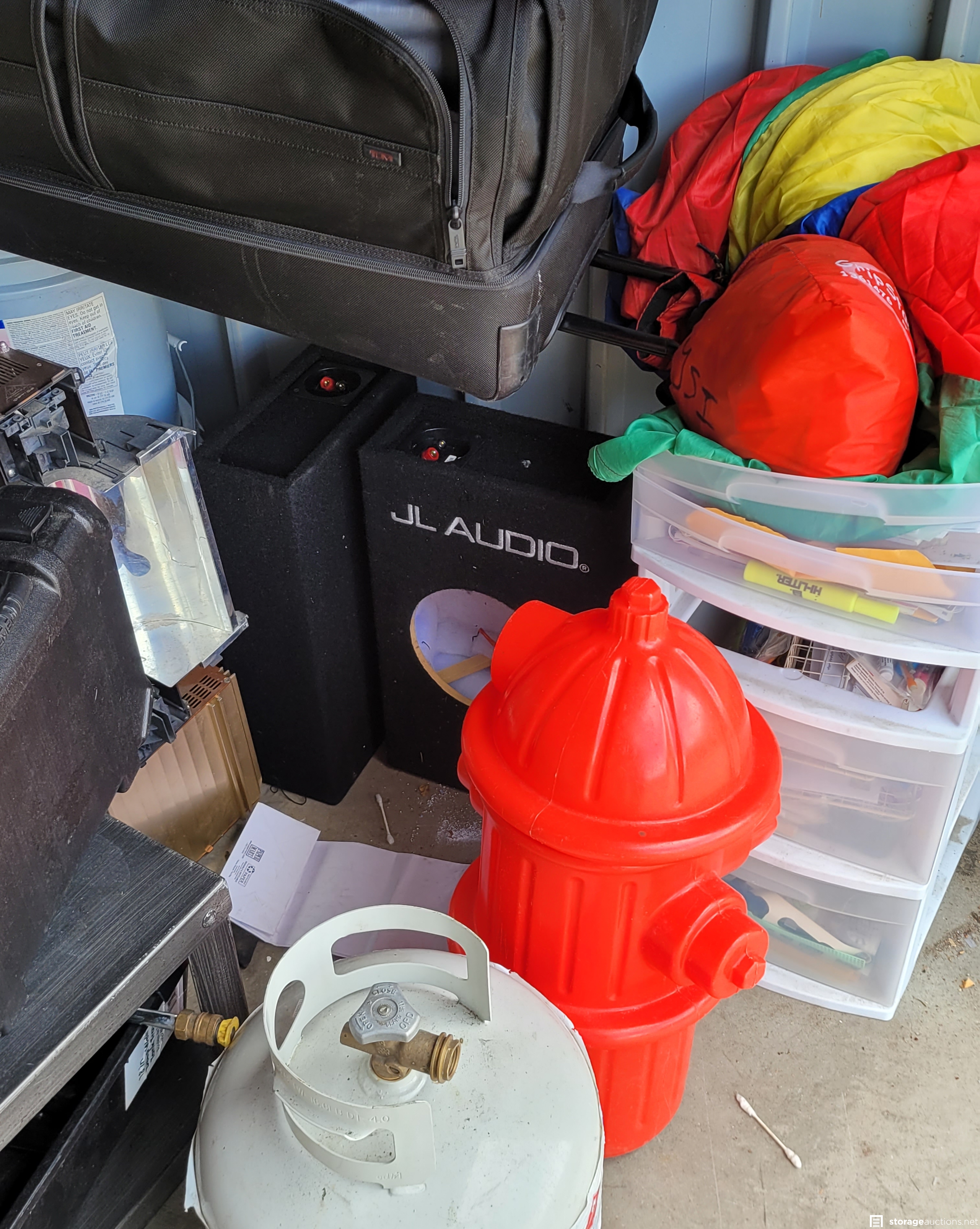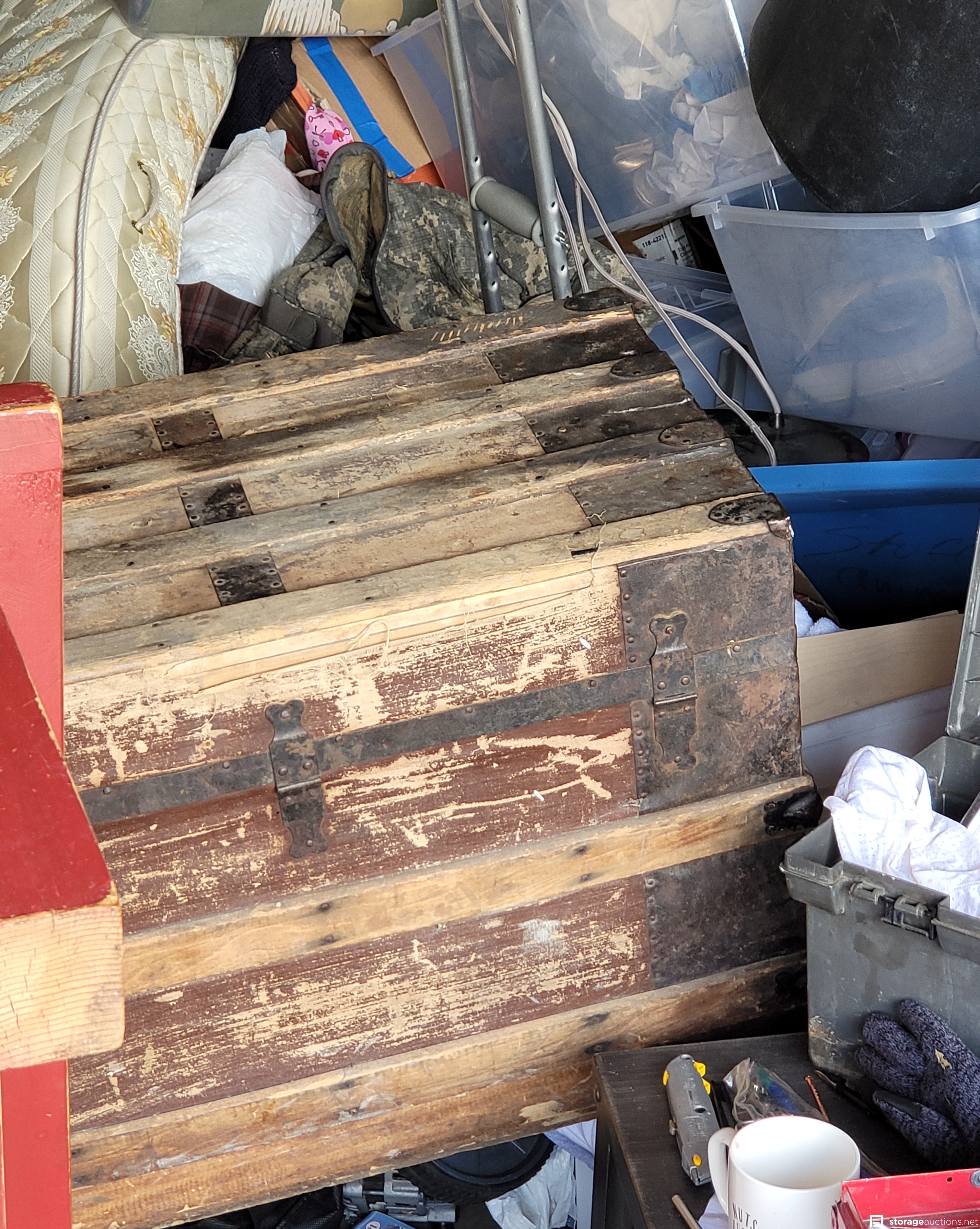 Tractor seats, old wooden trunks, tool boxes, metal dolly, metal shelve, Speaker boxes, rolling metal project table, Misc Household items, toys, tools, clothes, propane tank and with weed torch.