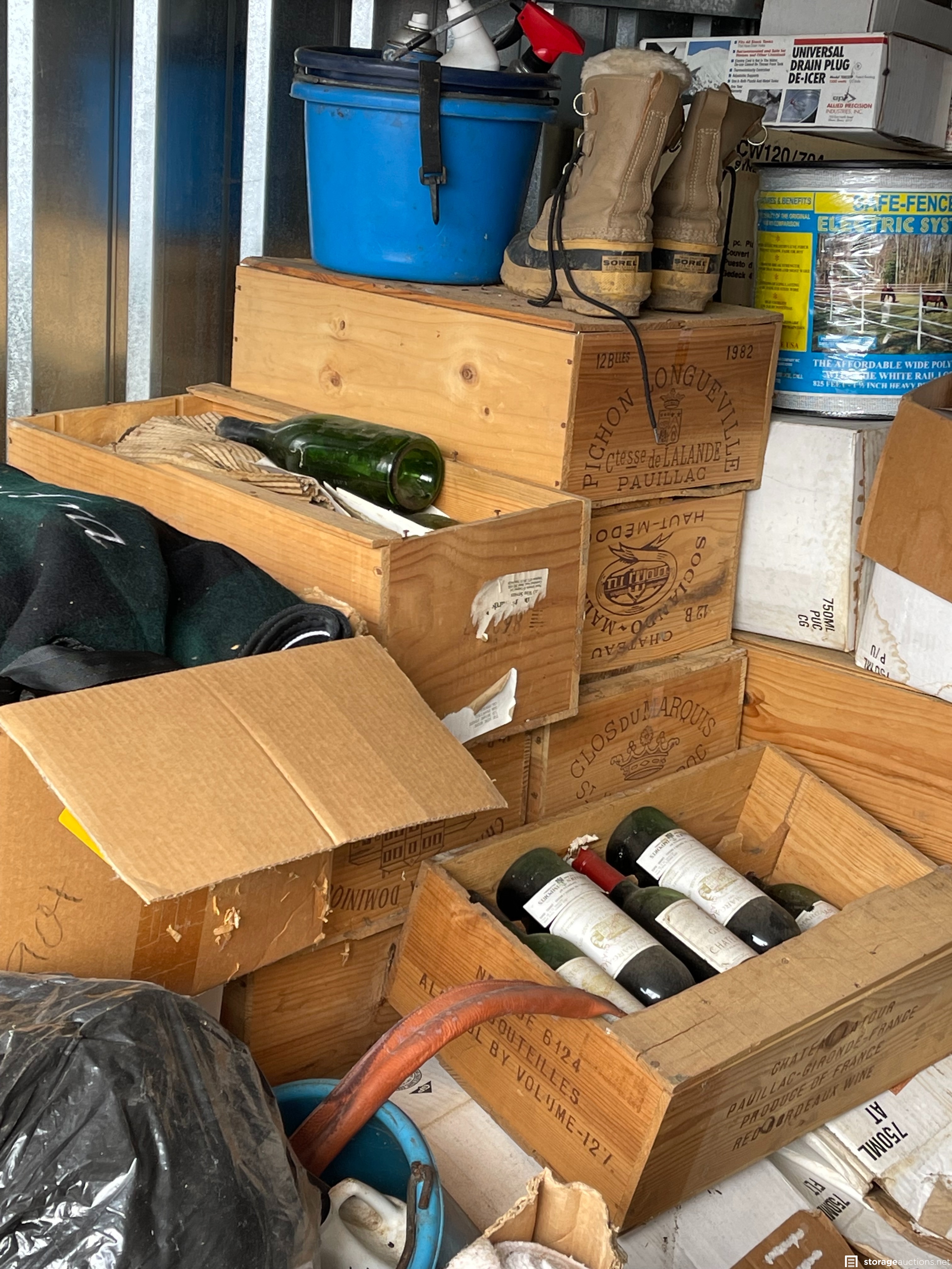 There appears to be horse blankets, several cases of wine, washer, dryer, metal kitchen chairs, 5-gallon buckets, a dolly, electric fence system, stock tank deicers, Sorrell boots, horse supplies, toolset, oil heater, DVD/CD Player, metal art piece, small metal animal crate, a lot of totes and boxes and other misc. items.