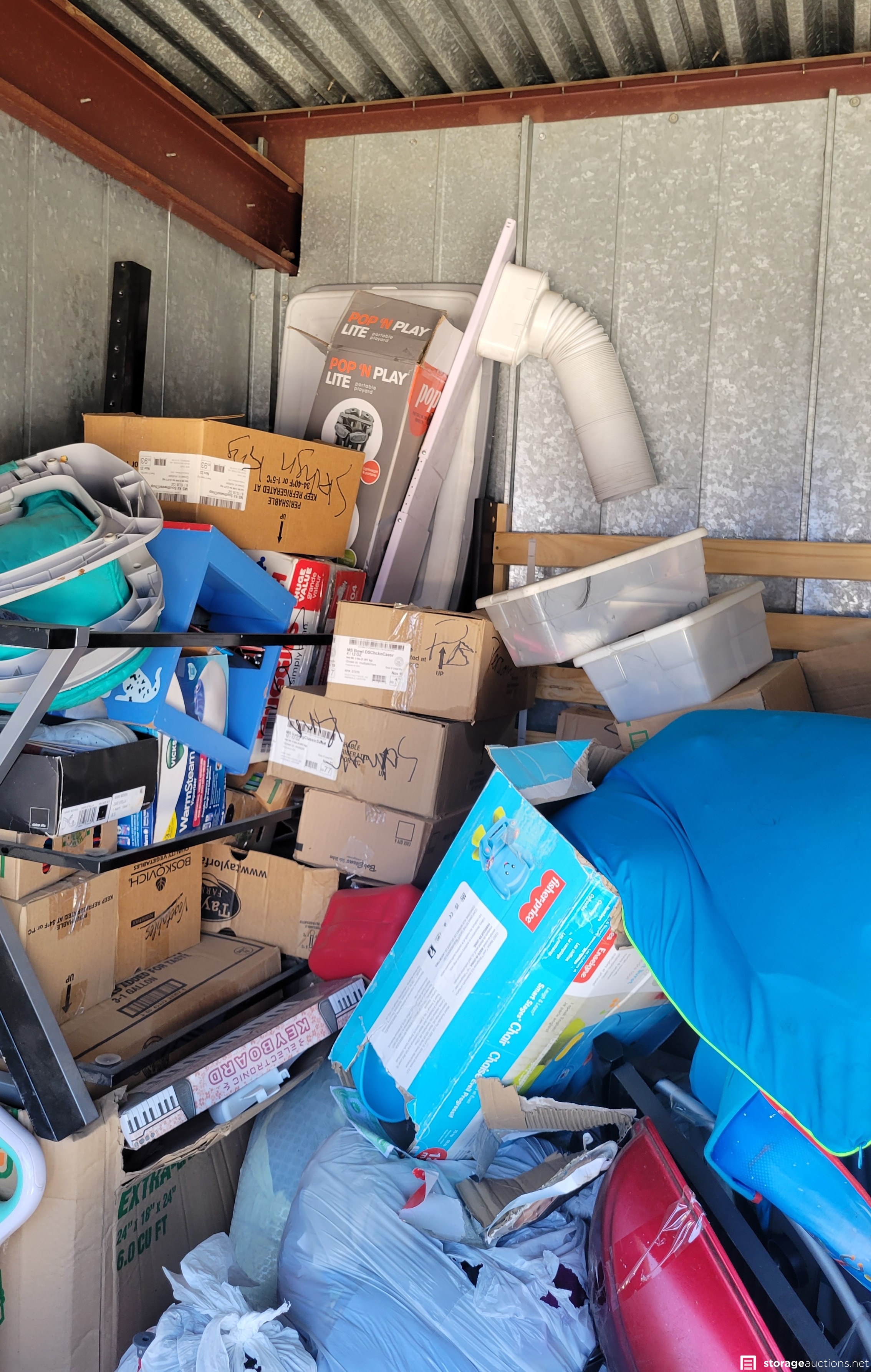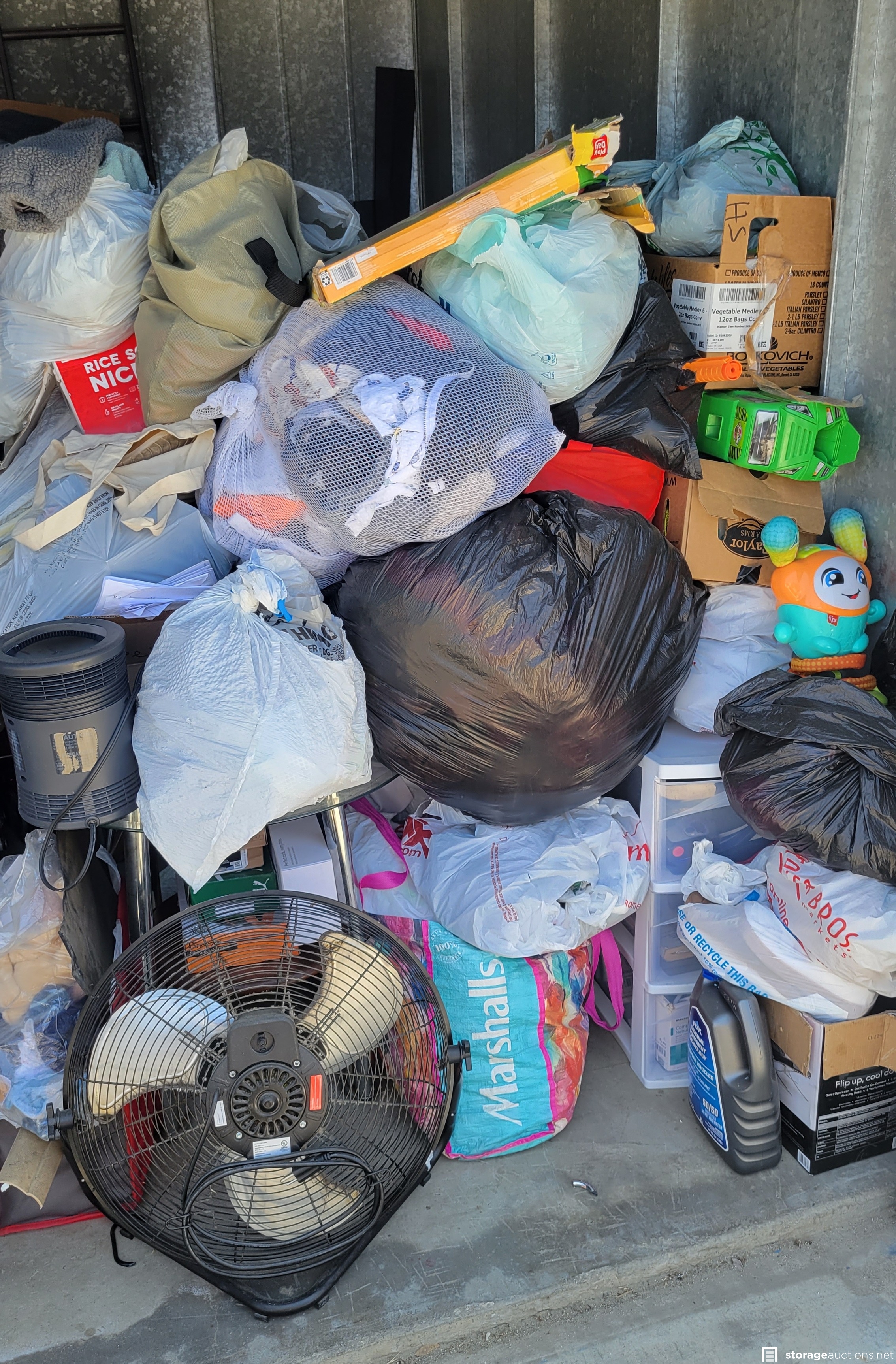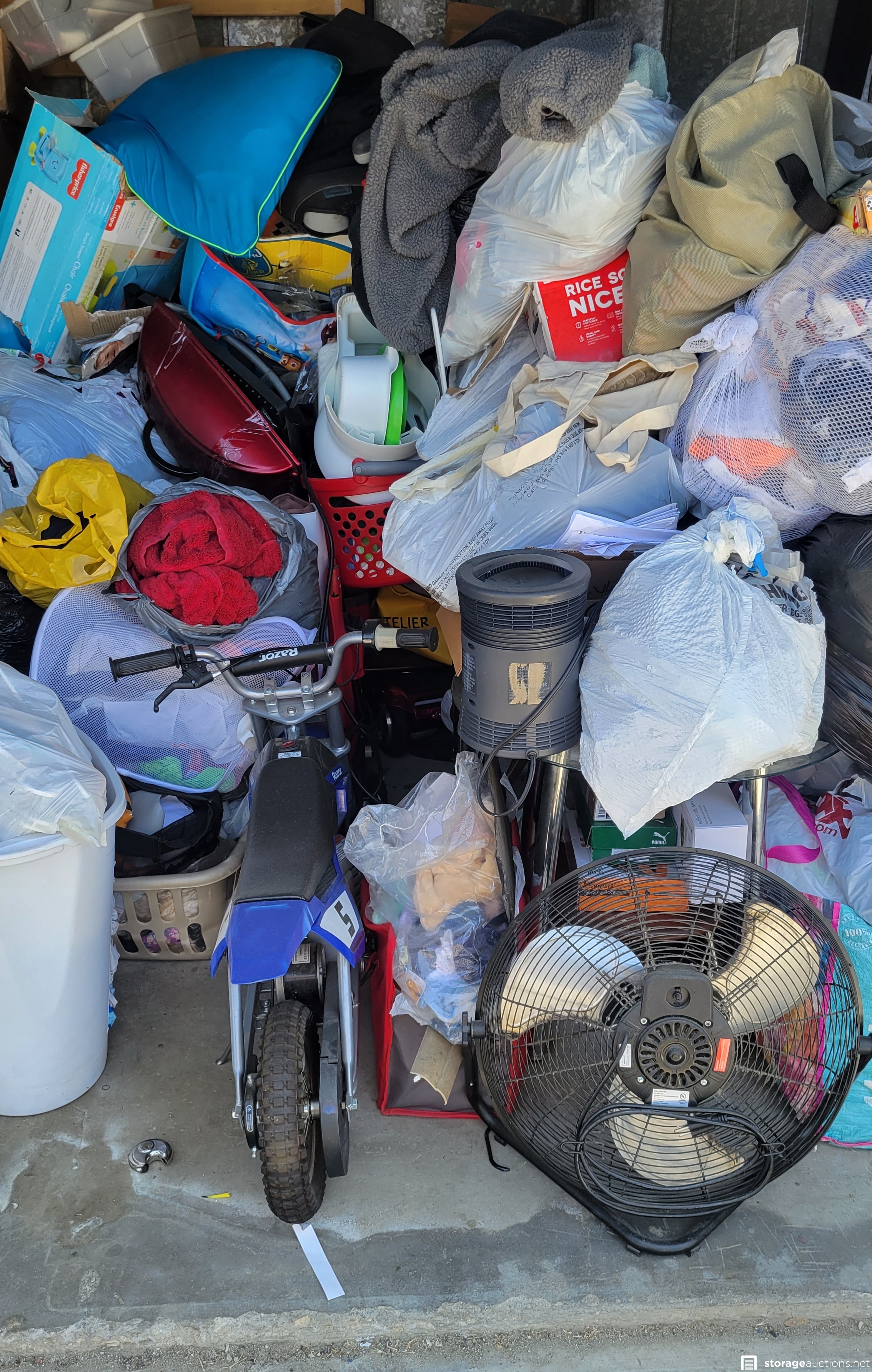 Fans, mini toy dirt bike, flat screen tv, bed and head board, shoes, portable ac unit, clothes, kids toys, misc items.