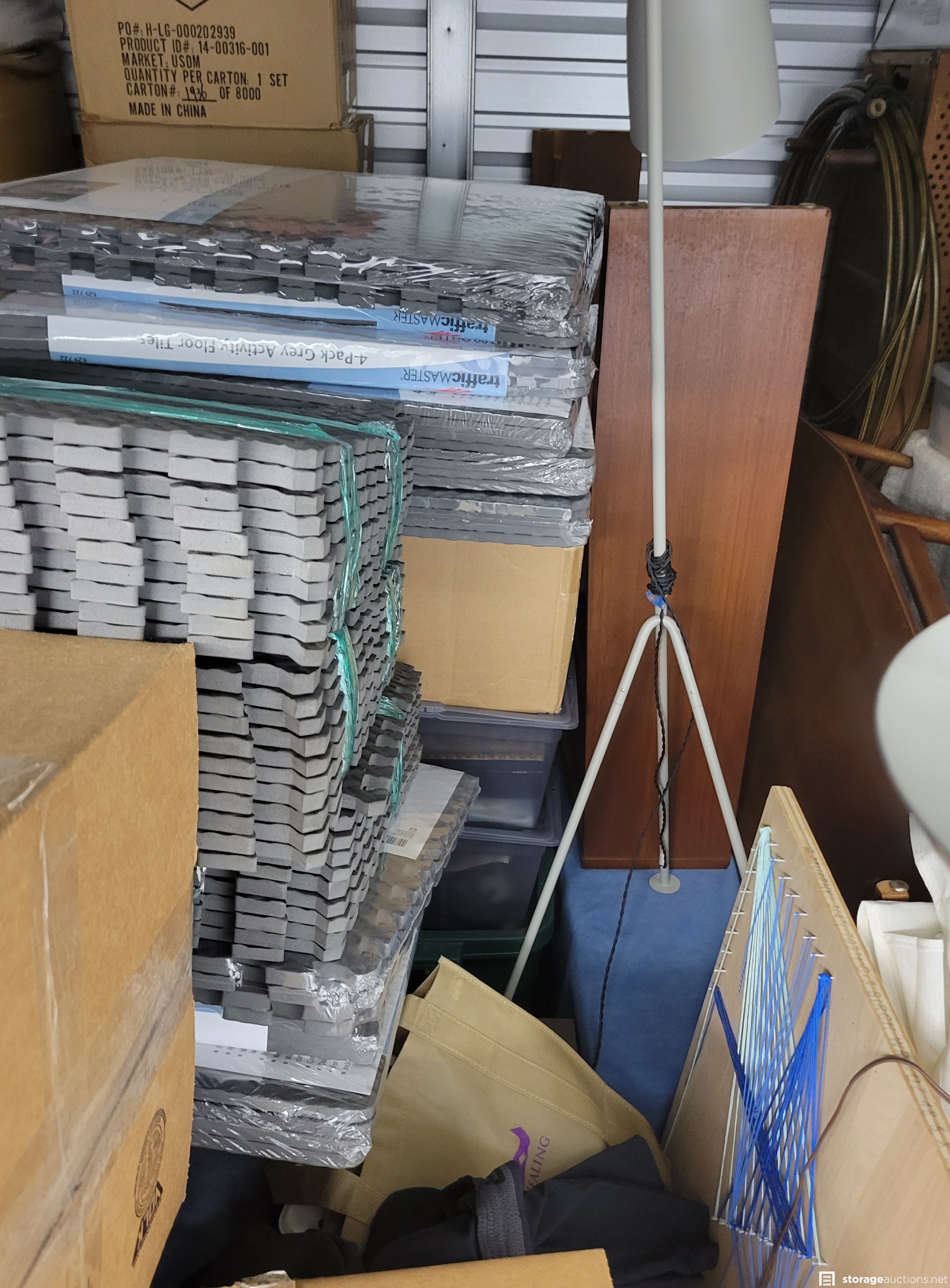 Power Washer, carpet cleaner, hoses, shredder, artwork, wall decorations, lamps, approx. 40 boxes, nightstands, extension cord reels, exercise room rubber floor tiles, miscellaneous