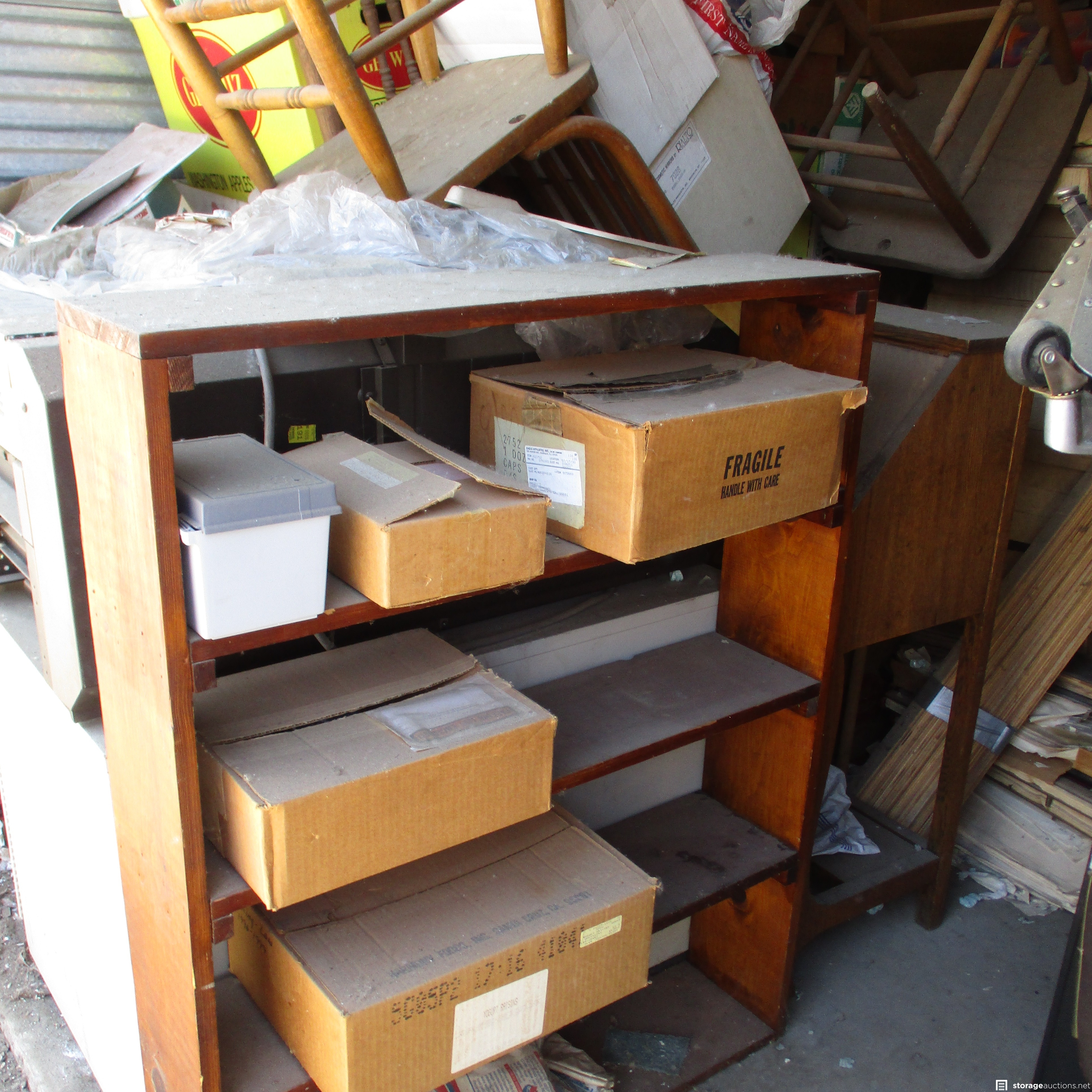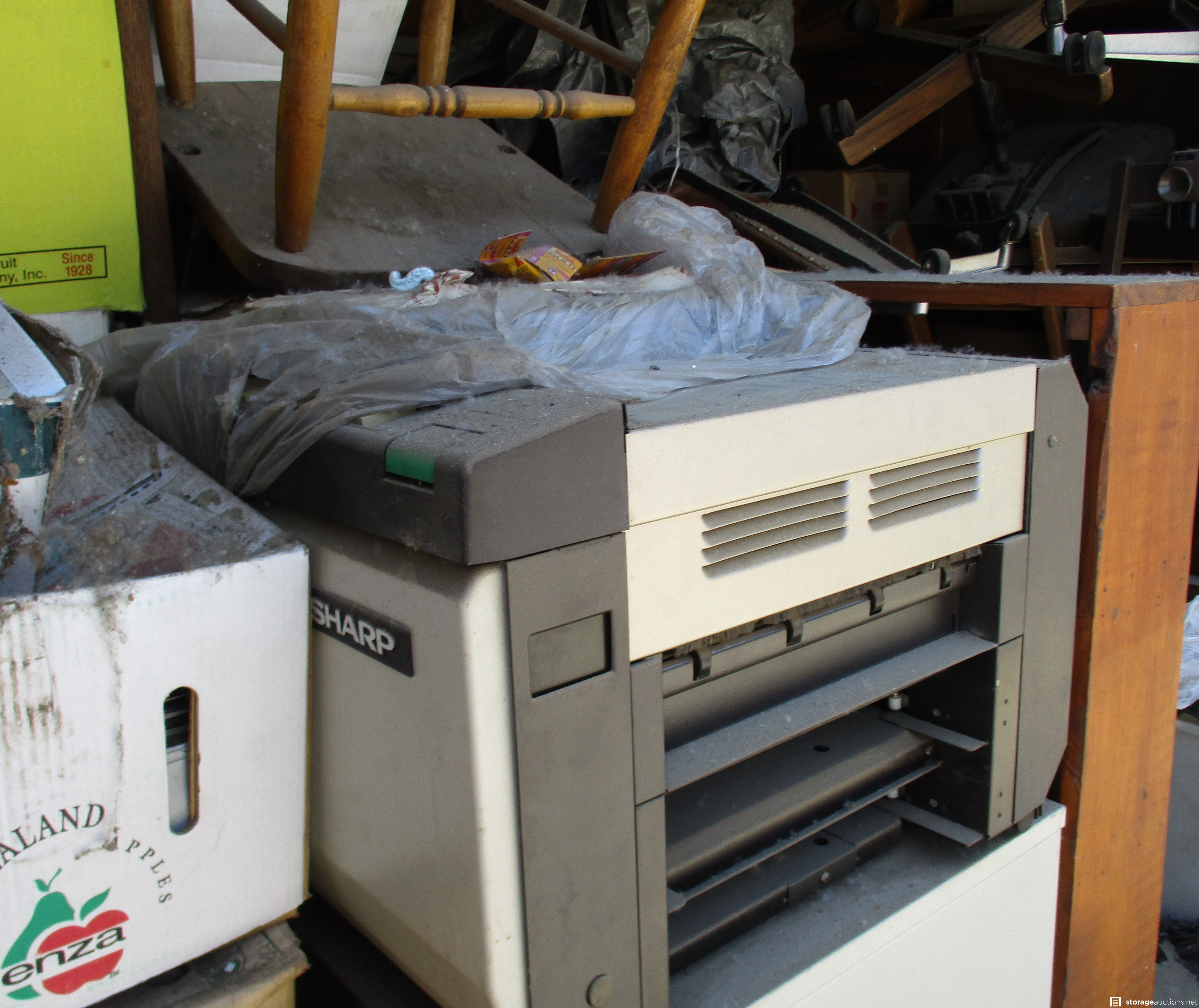 SHARP COPY MACHINE, SECRETARY DESK, SEVERAL OFFICE DESKS AND CHAIRS, RAILROAD LANTERN, ICE CHEST, PATIO CHAIRS, BOOKSHELF, NUMEROUS BOXES (CONTENTS UNKNOWN), SHOE BOXES (CONTENTS UNKNOWN), OTHER MISC. ITEMS.