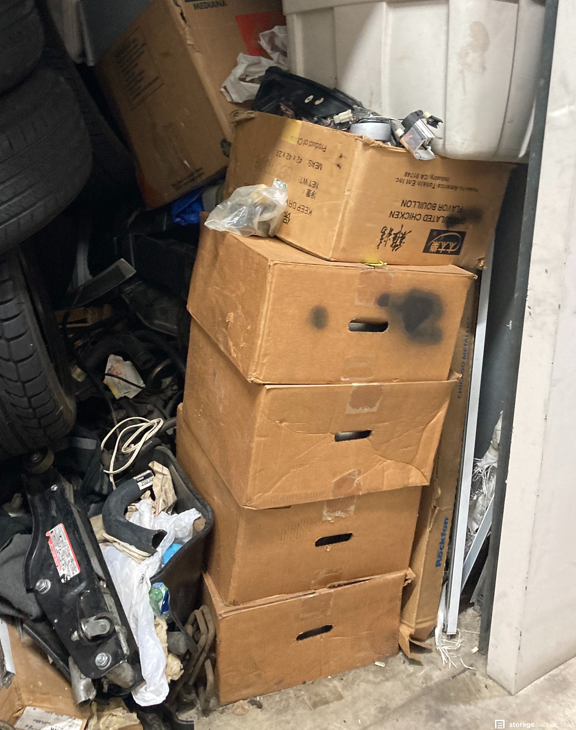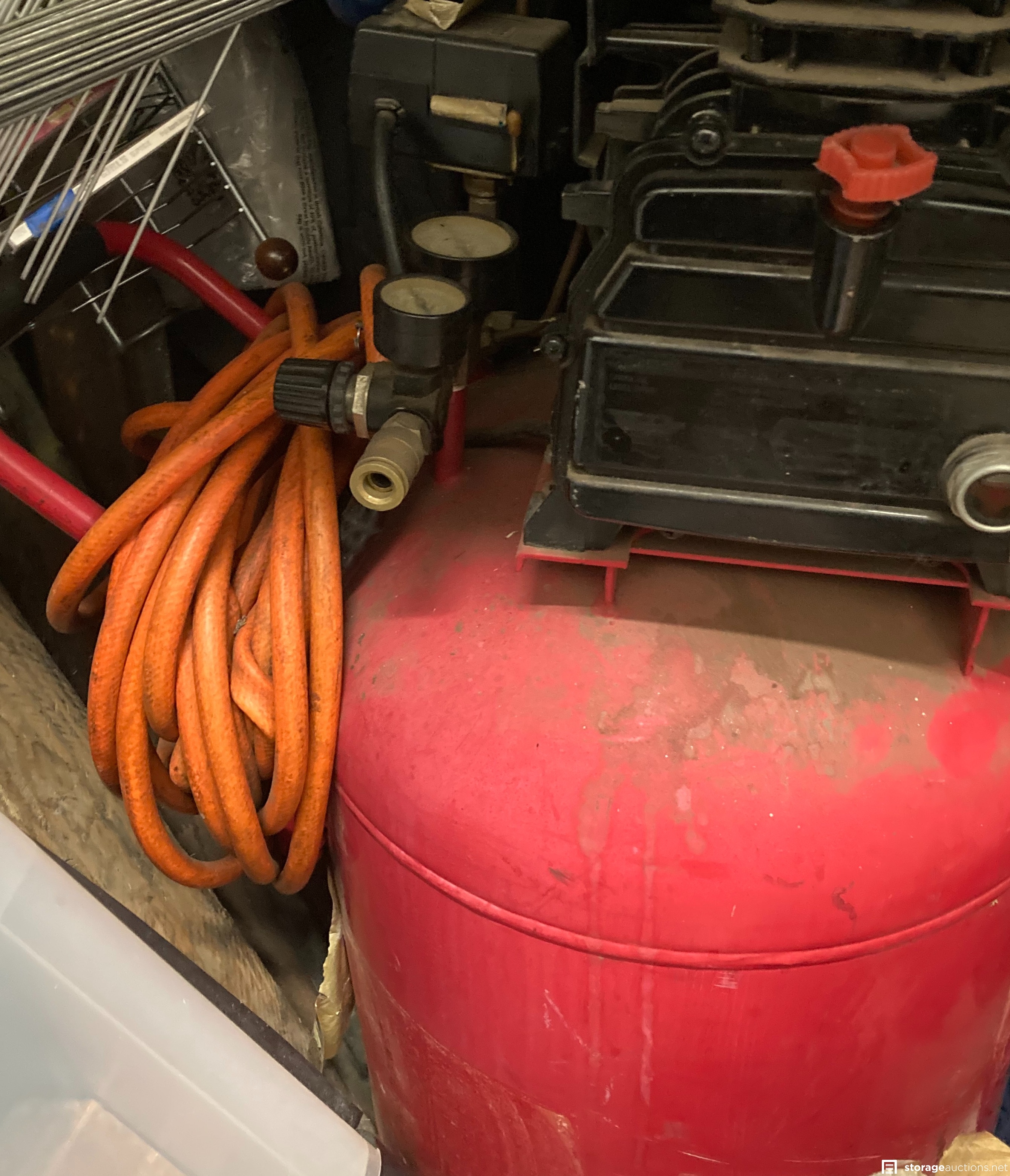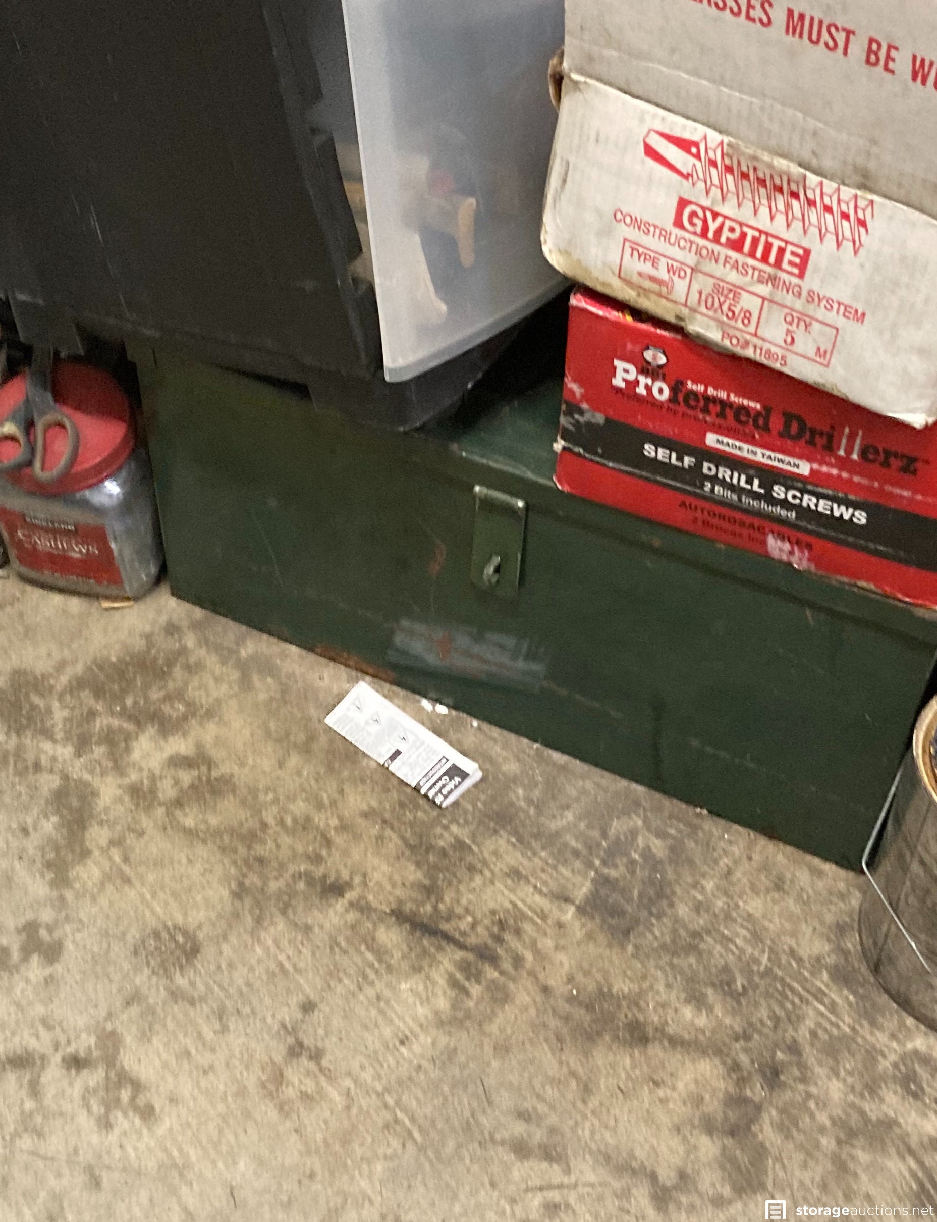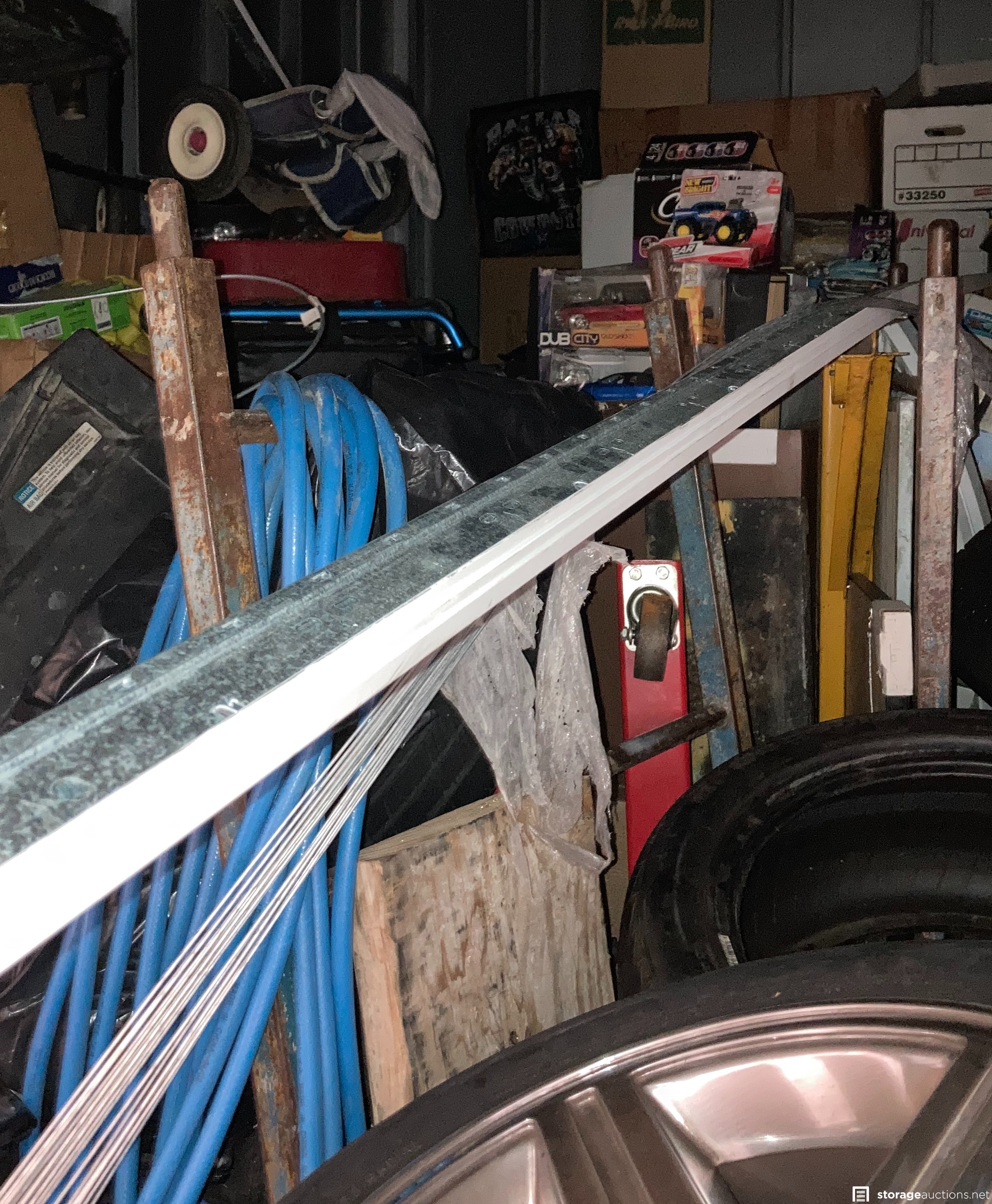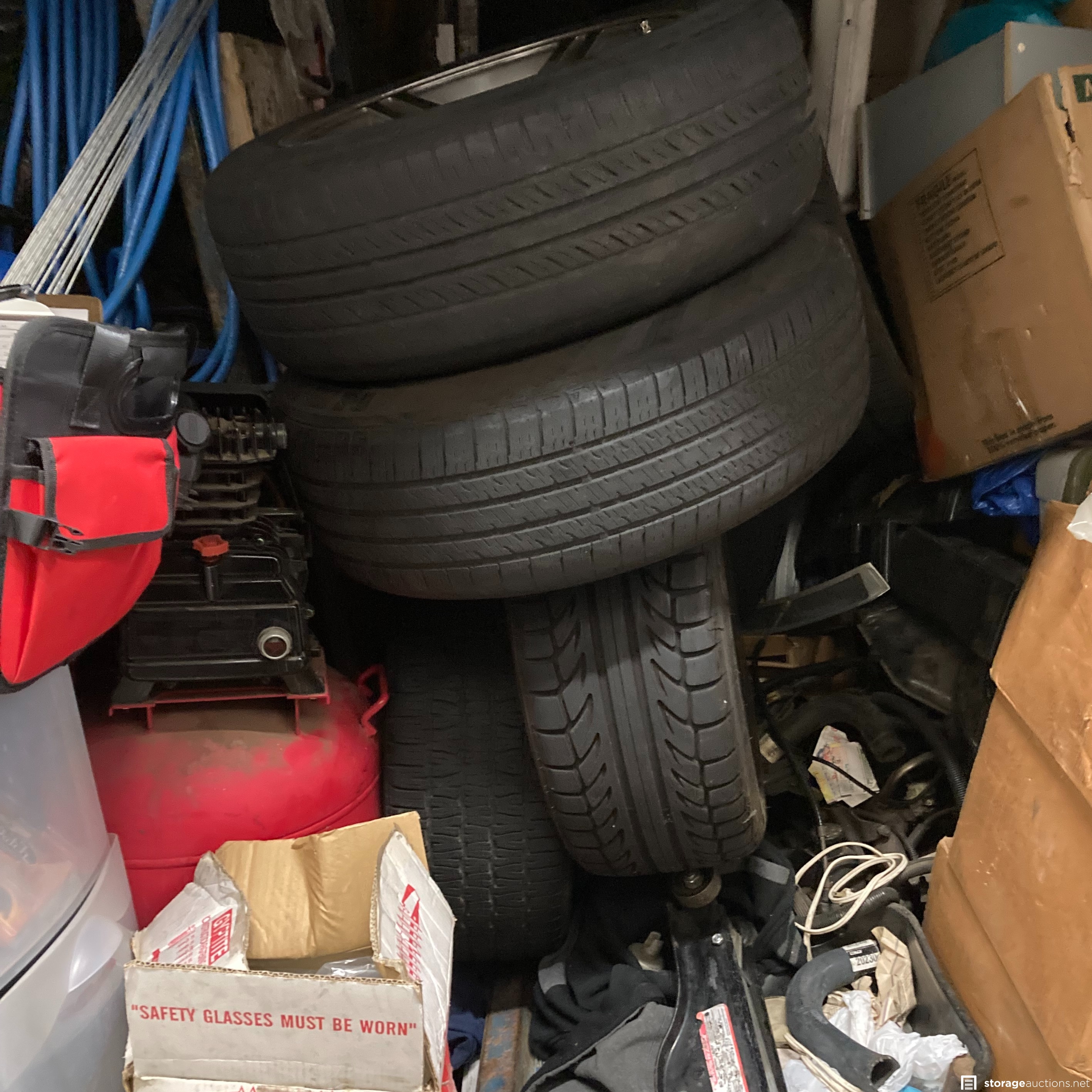 Boxes, tires with chrome wheels, floor car jack, generator with hoses, auto paint hoses, tools, ice chest, memorabilia