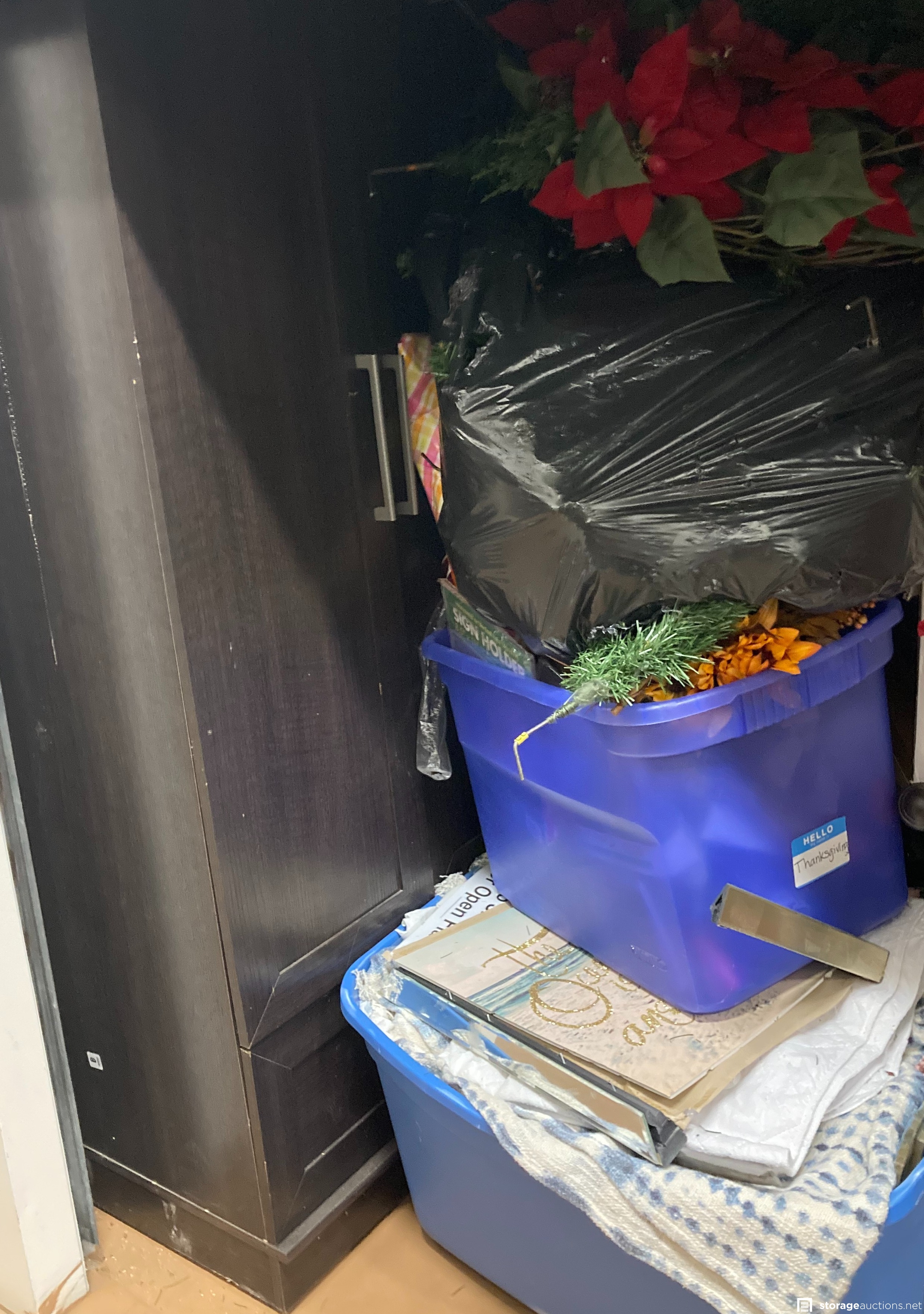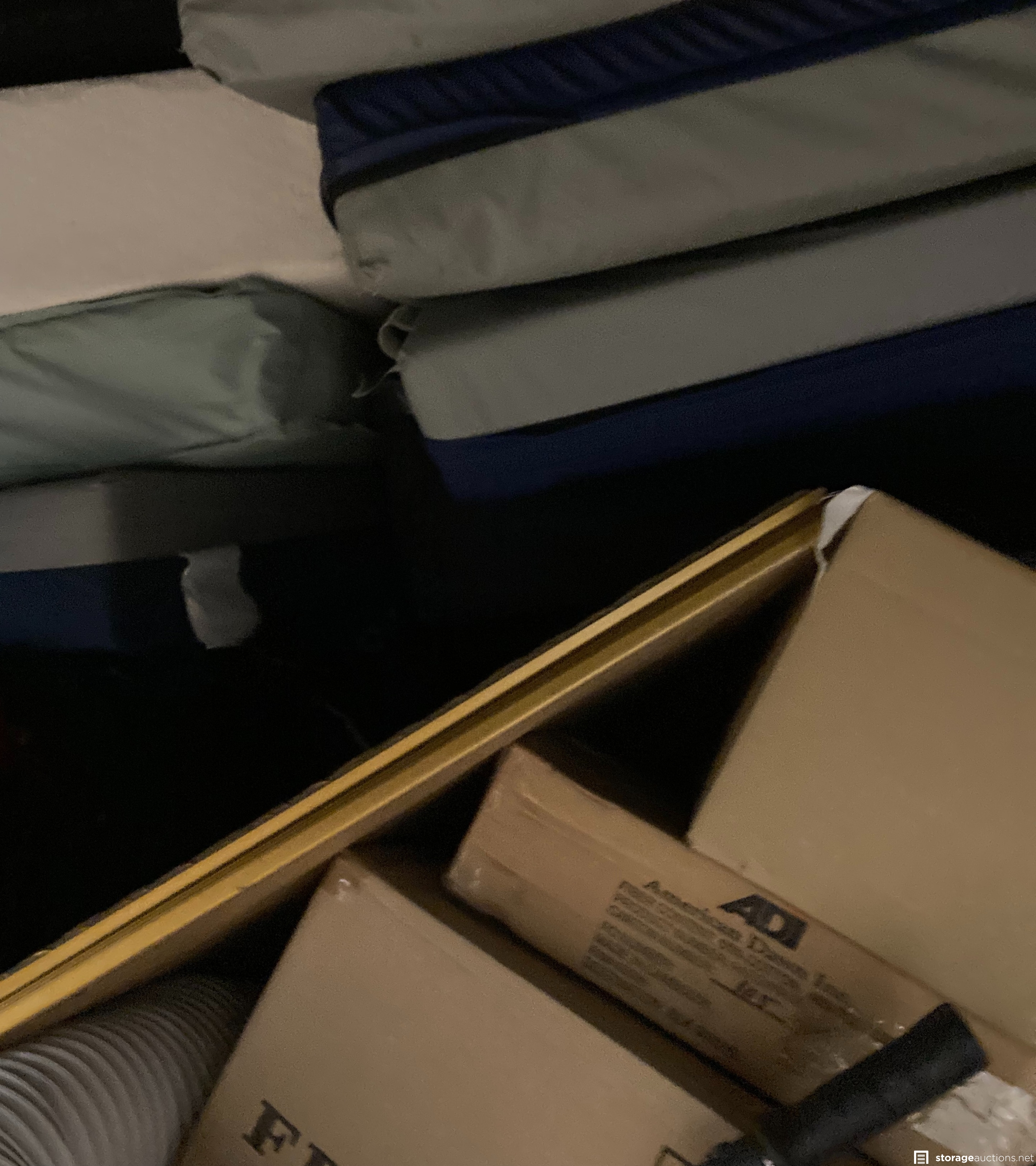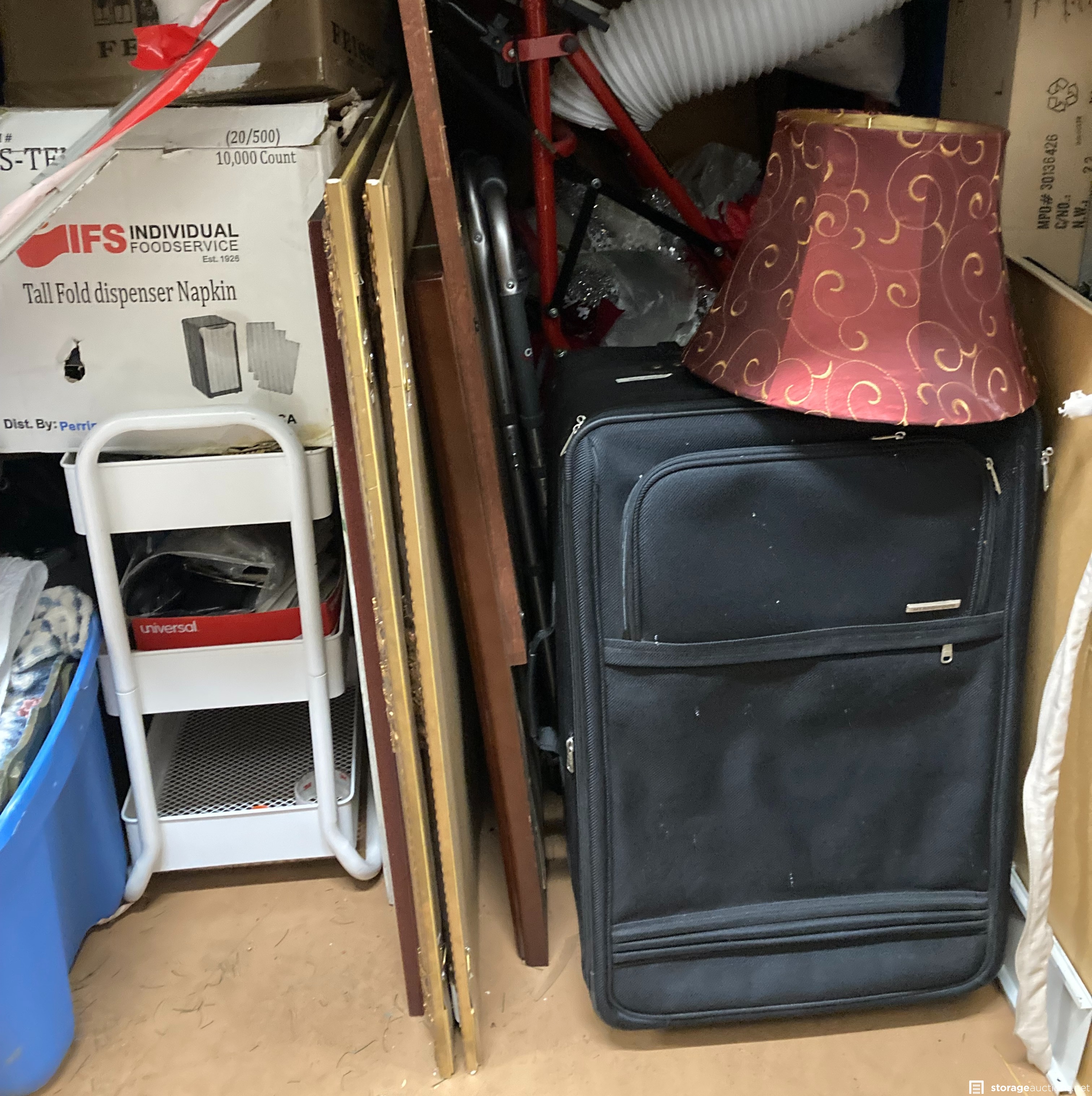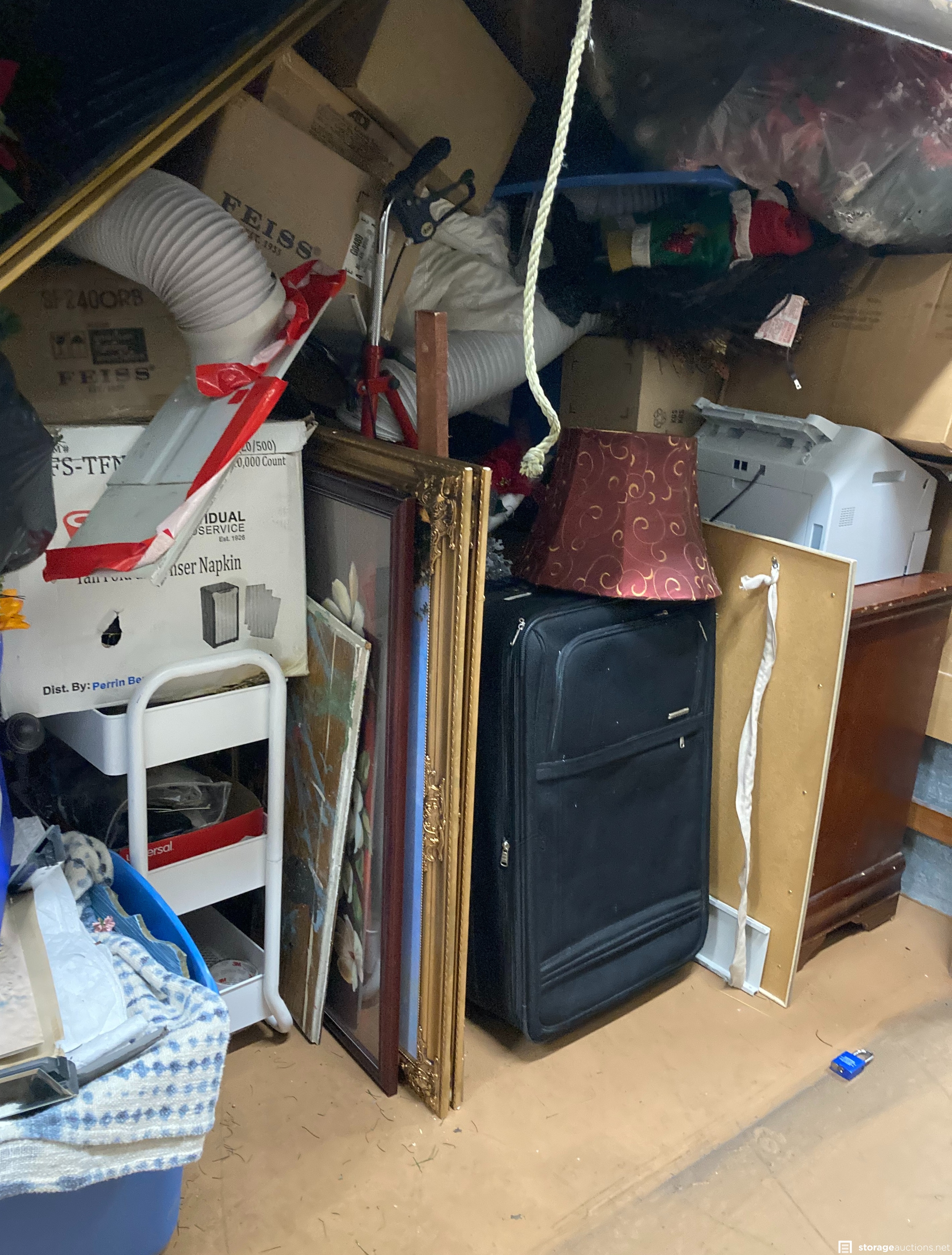 Cabinet file, printer, boxes, bags, pictures, suitecase, walker, mattresses, boxes, bags, christmas decorations, small white cart, night stand