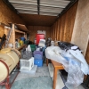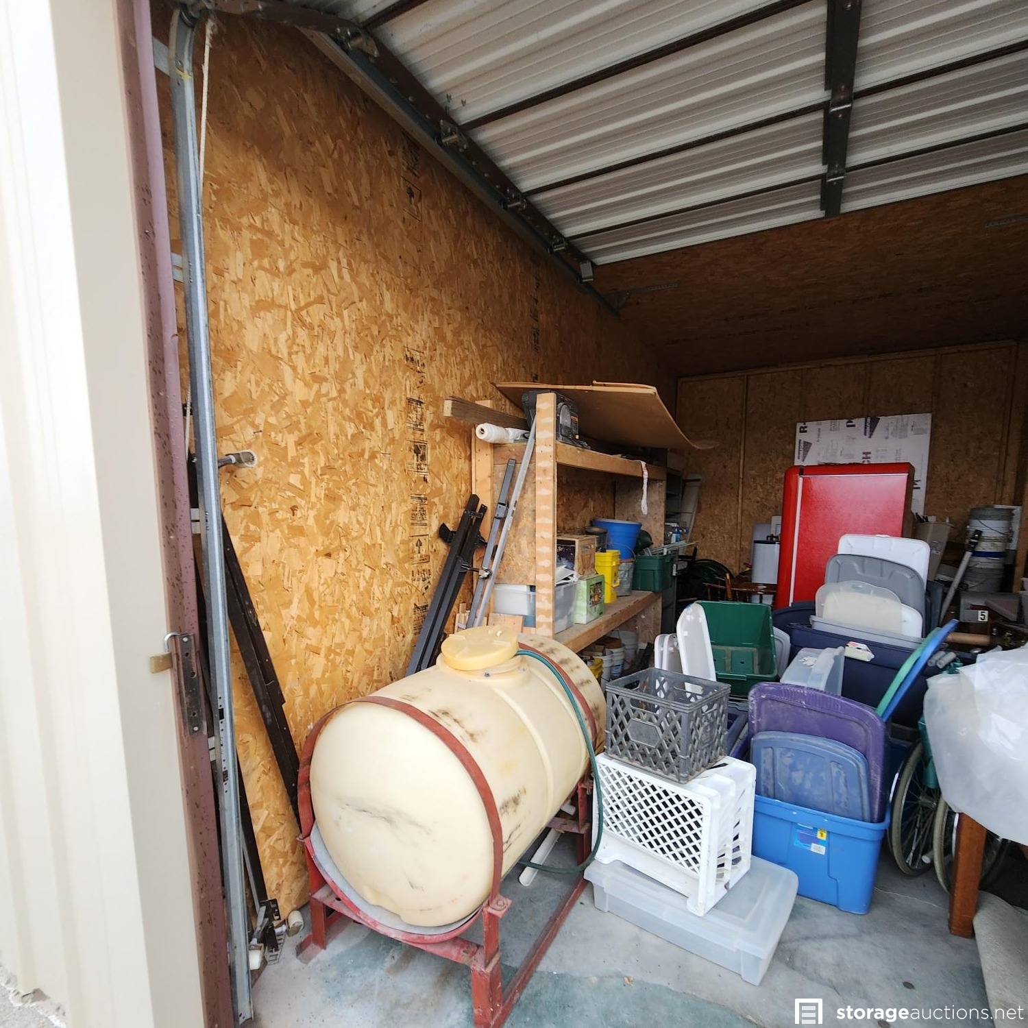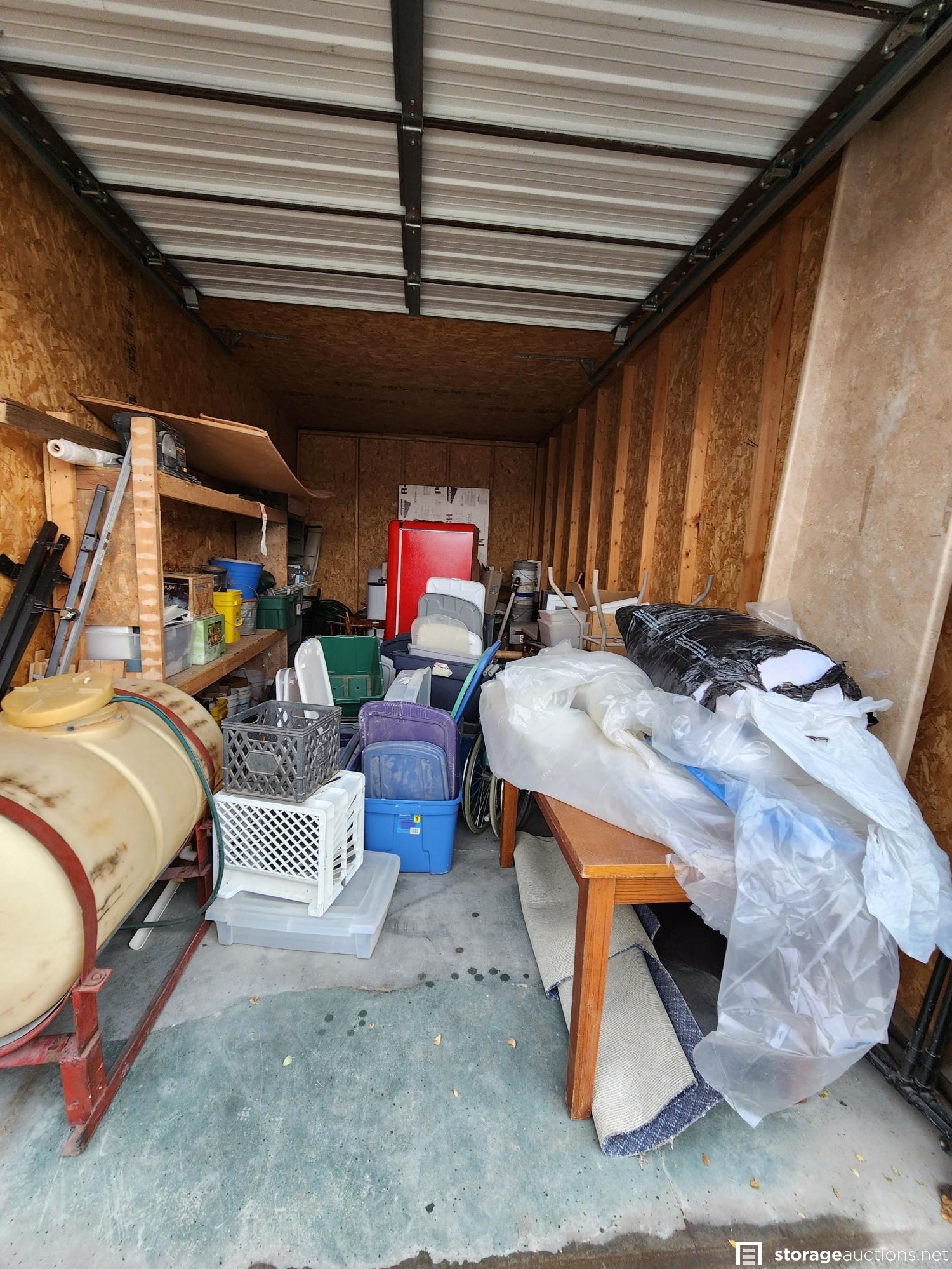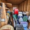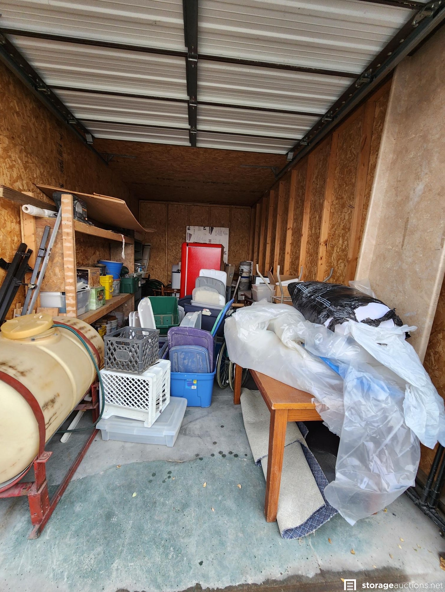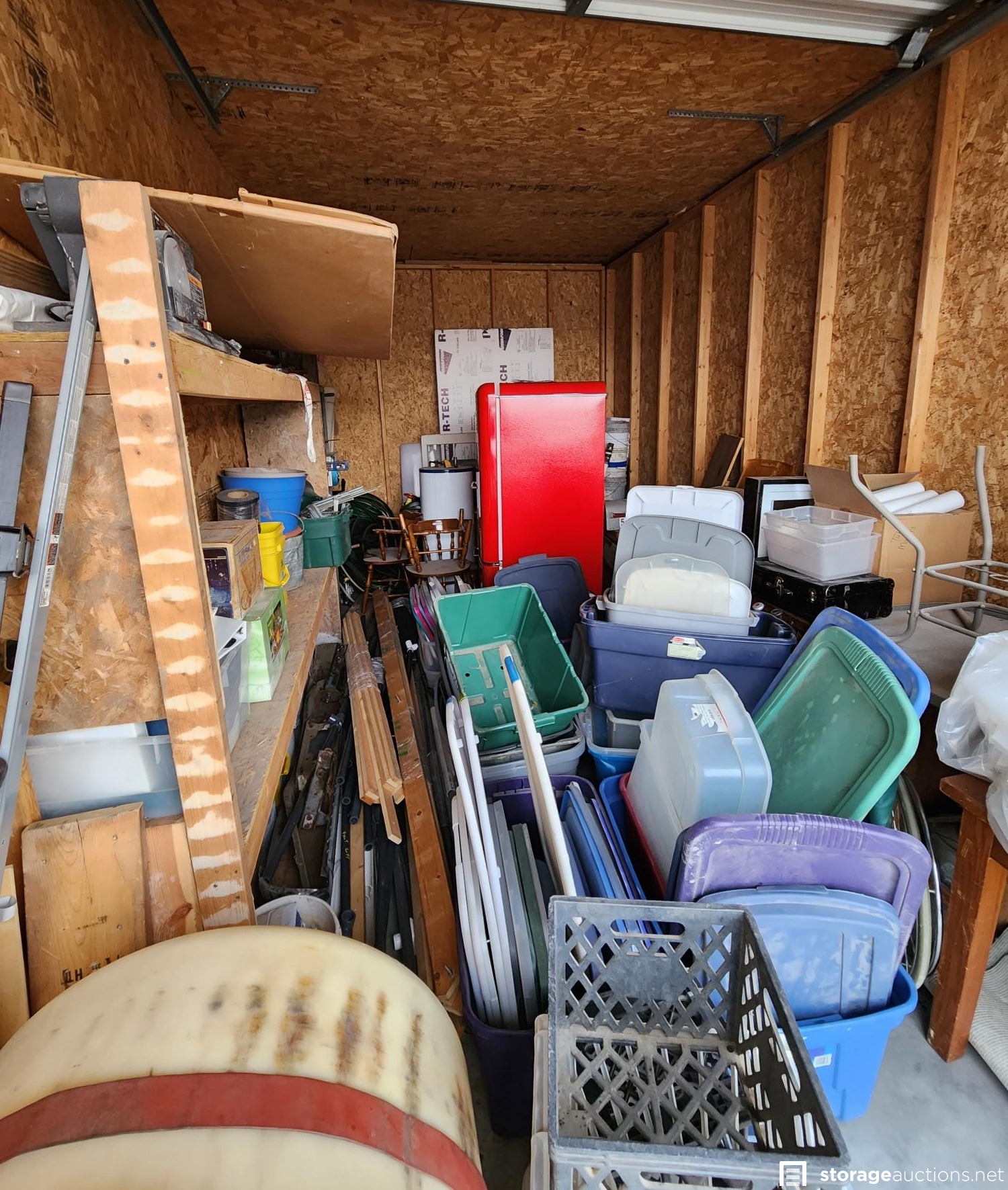 Shelf, totes, refrigerator, water tank, bed frames, boards, wood, furniture, chairs, water heater, table, counter, buckets, misc construction supplies, misc boxes,