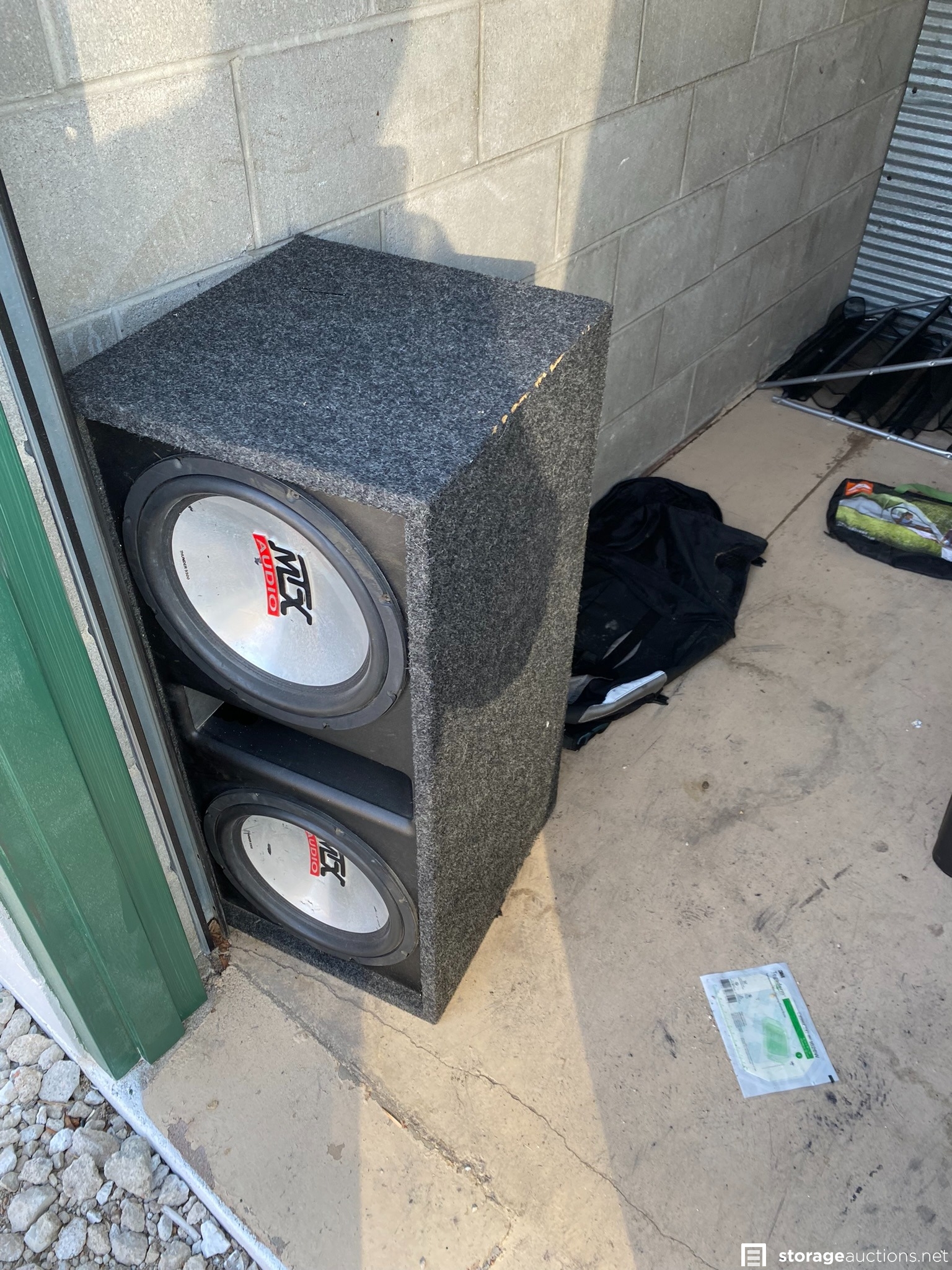 Large speakers and various household goods in plastic totes.