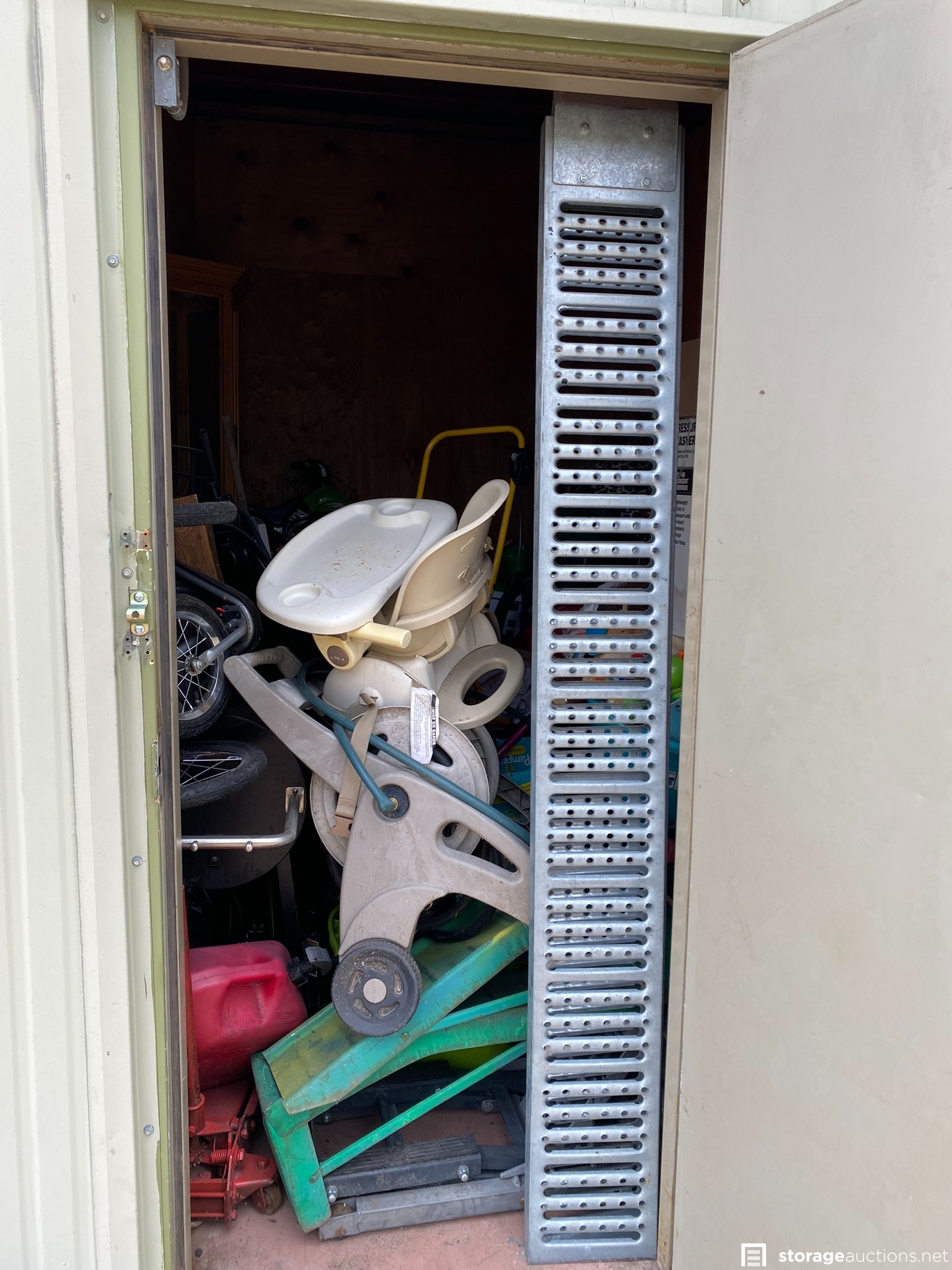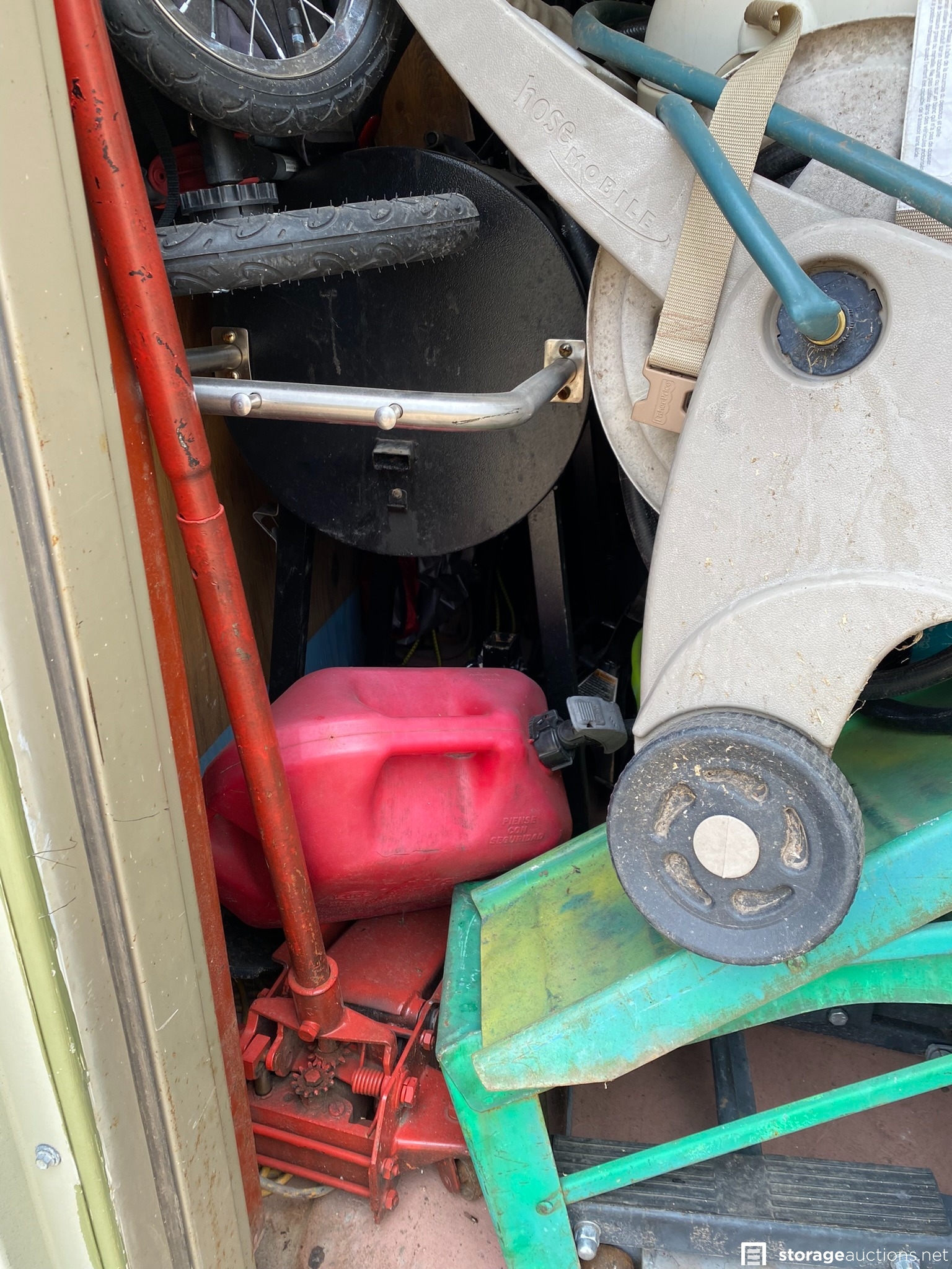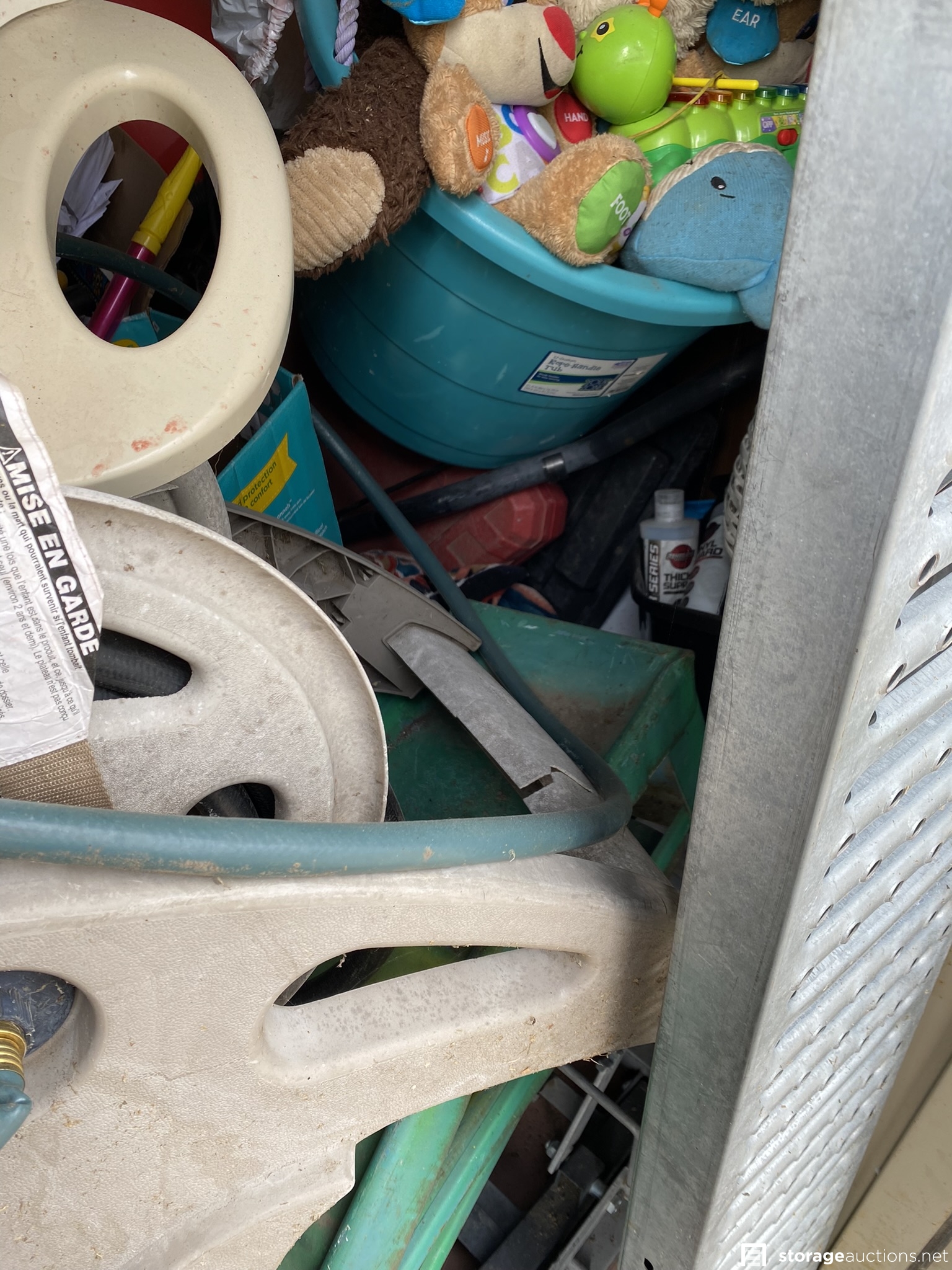 Long metal ramps, hose reel, gas can, tire ramps, car floor jack, lot of kids toys, baby running stroller, shop vac, tools, various household goods.
