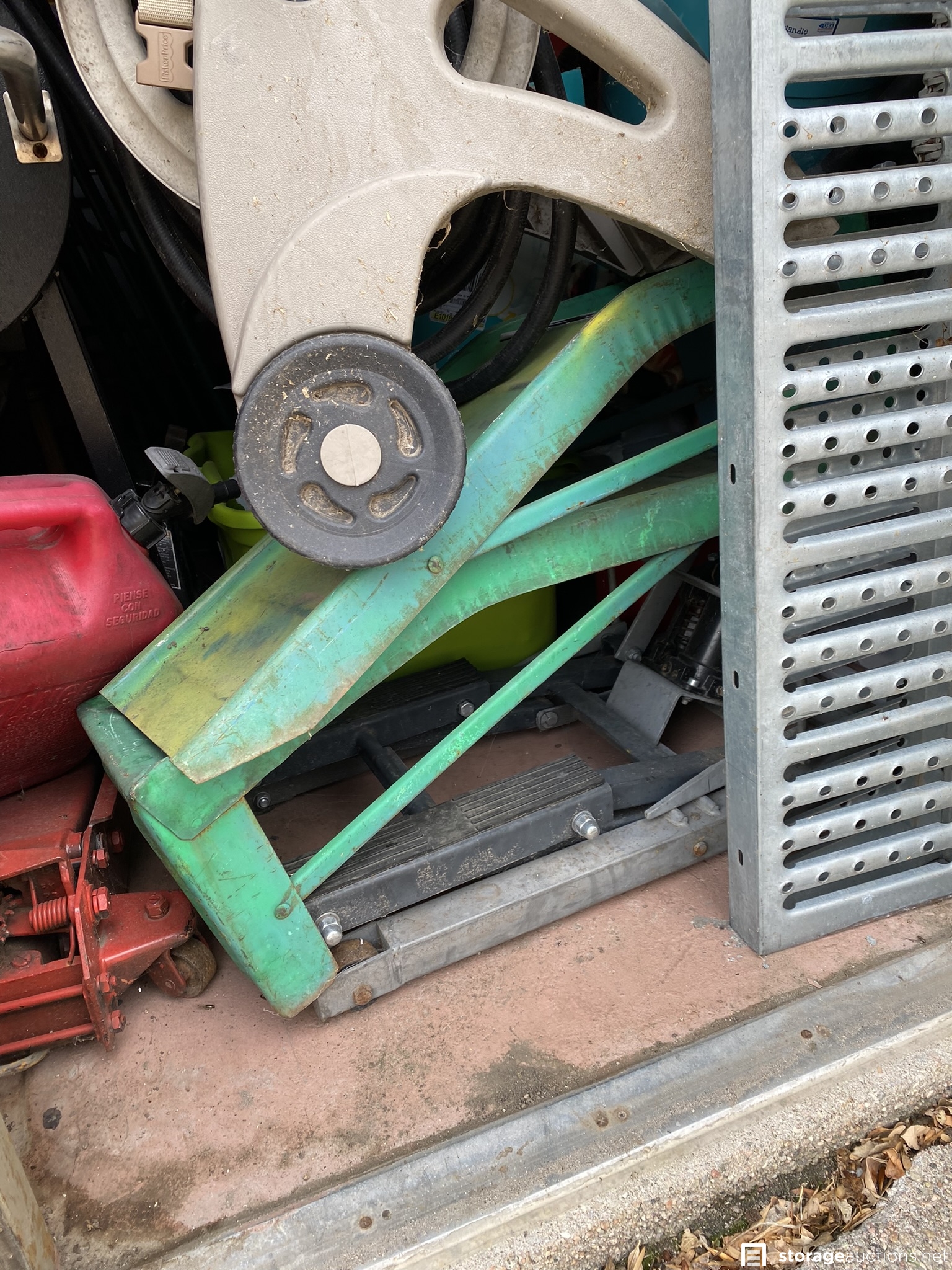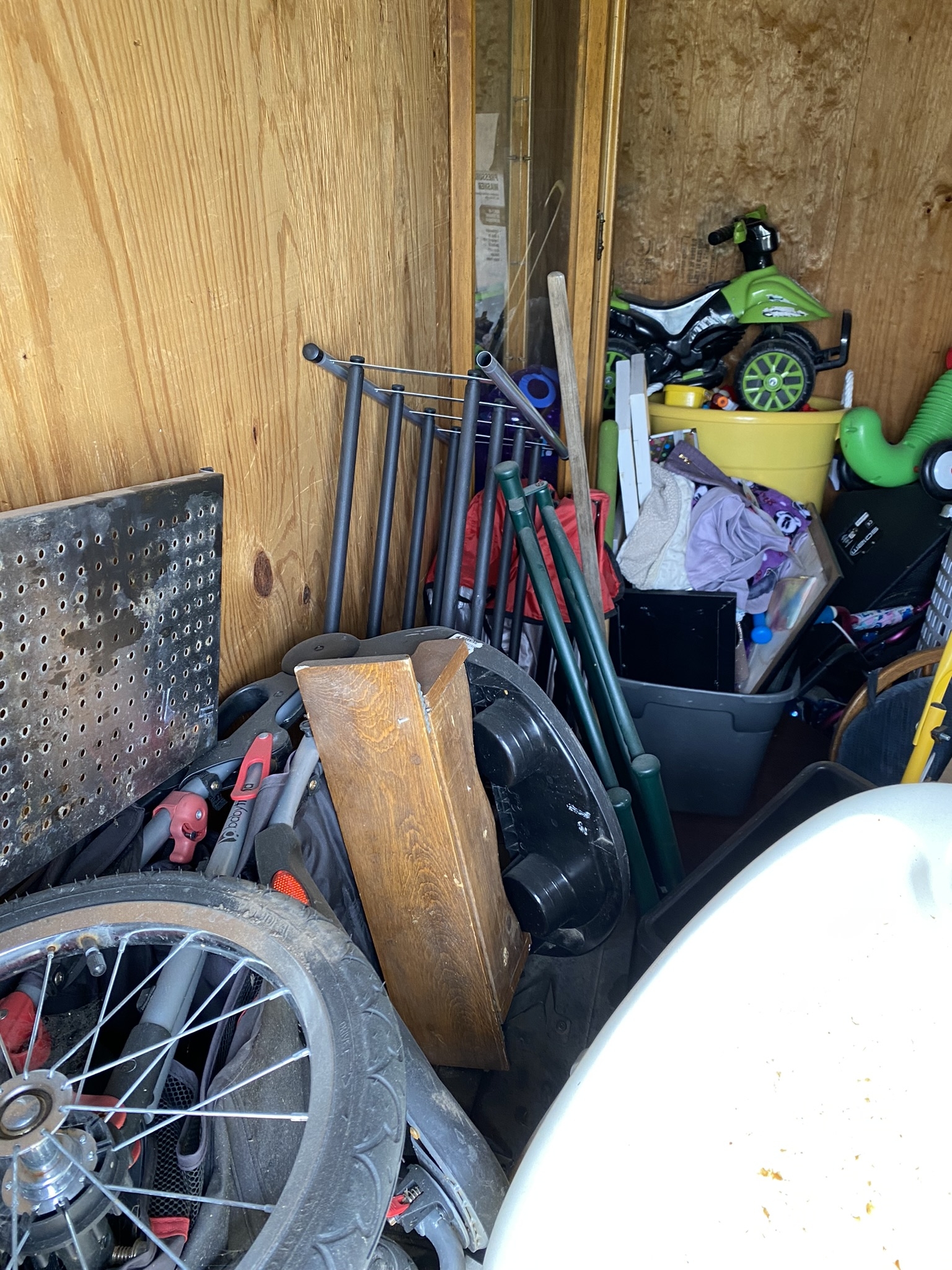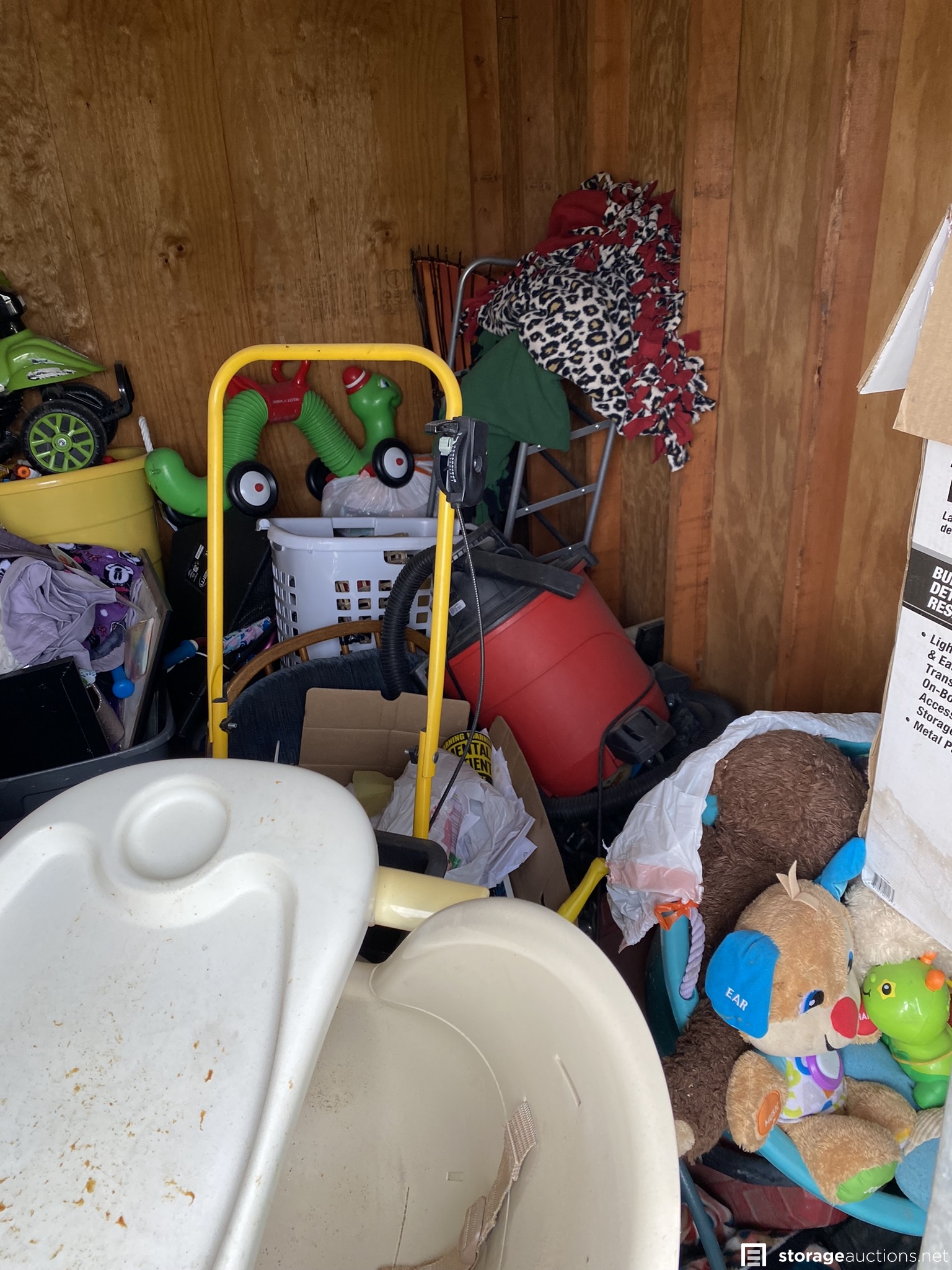 Long metal ramps, hose reel, gas can, tire ramps, car floor jack, lot of kids toys, baby running stroller, shop vac, tools, various household goods.