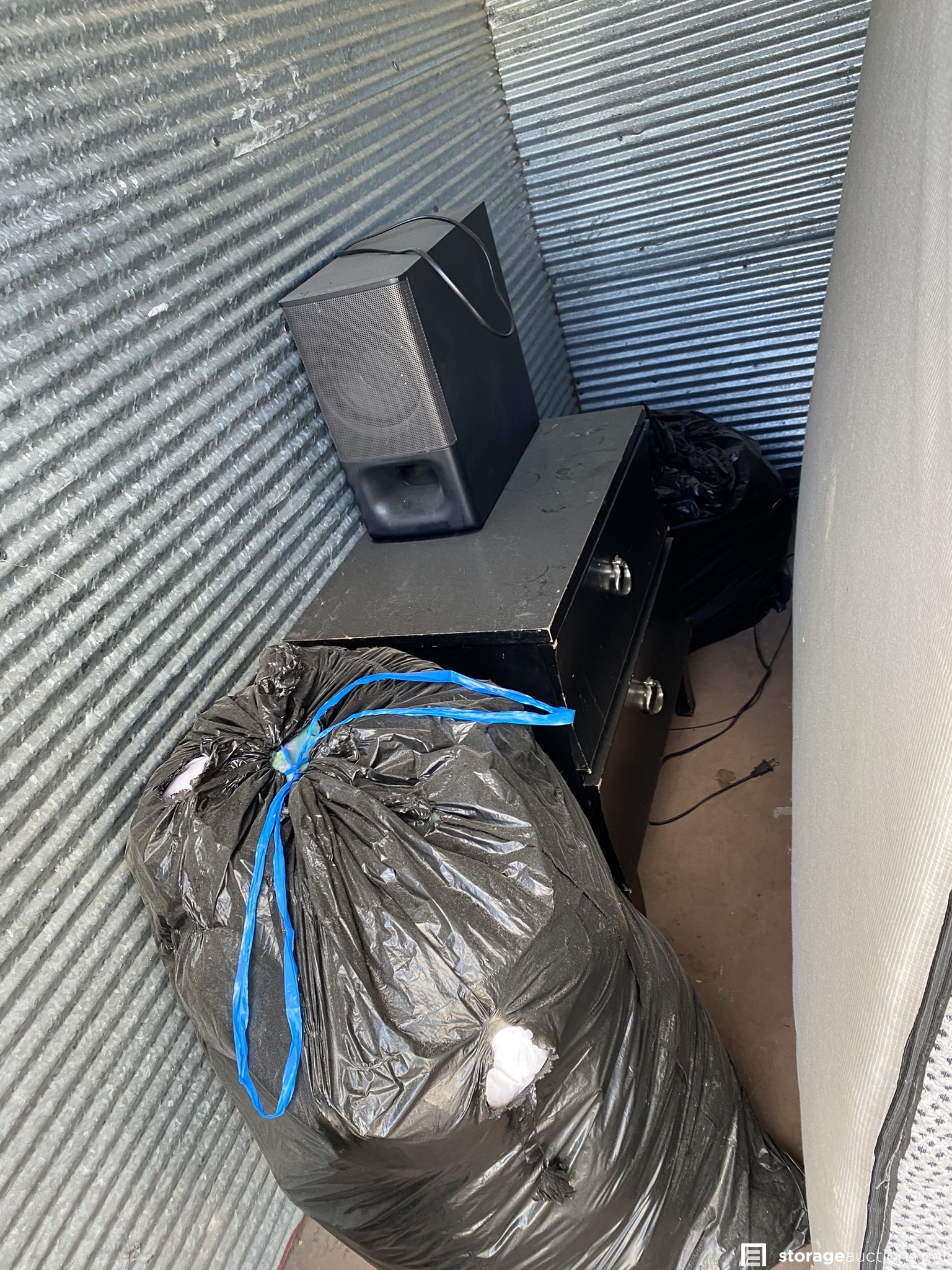 Large mattress and box spring, speaker, small dresser and bags with unknown contents.