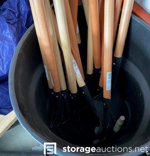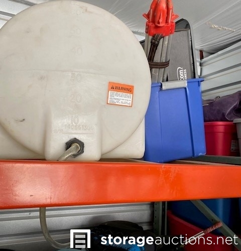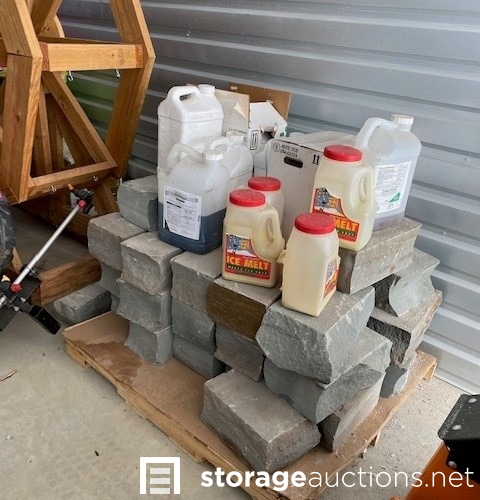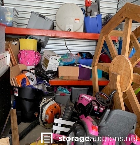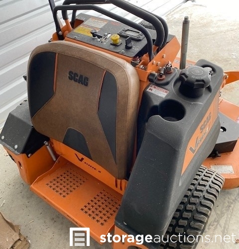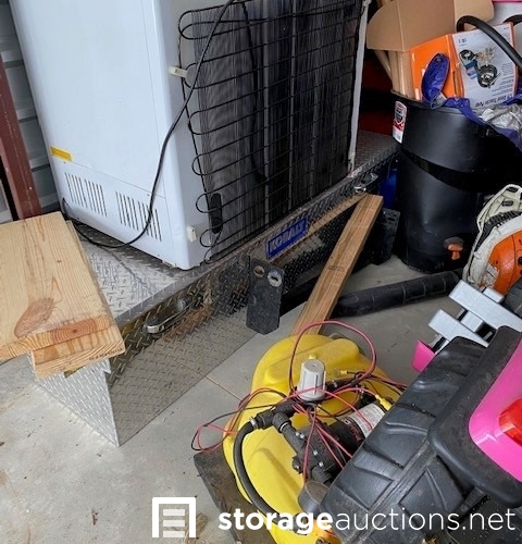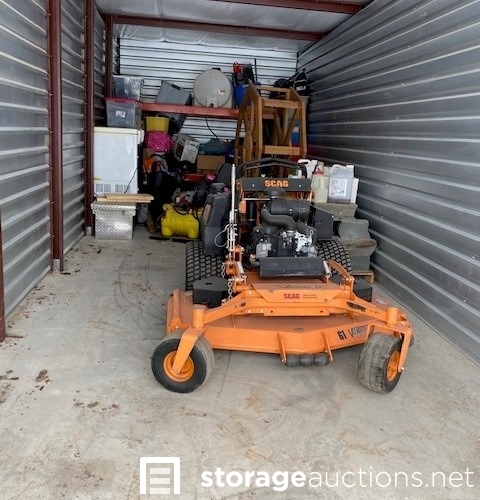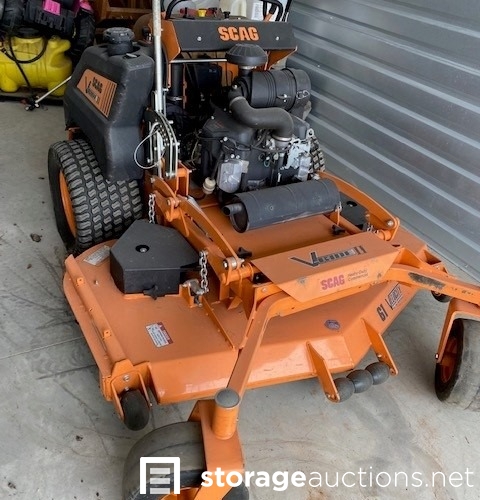 SCHG V-Ride II heavy duty commercial mower, sprayer tank, kids car, gas blower, lots of totes, heavy duty shelving rack, truck box, freezer, shovels, landscaping blocks and supplies, lots of miscellaneous items. Very clean unit.