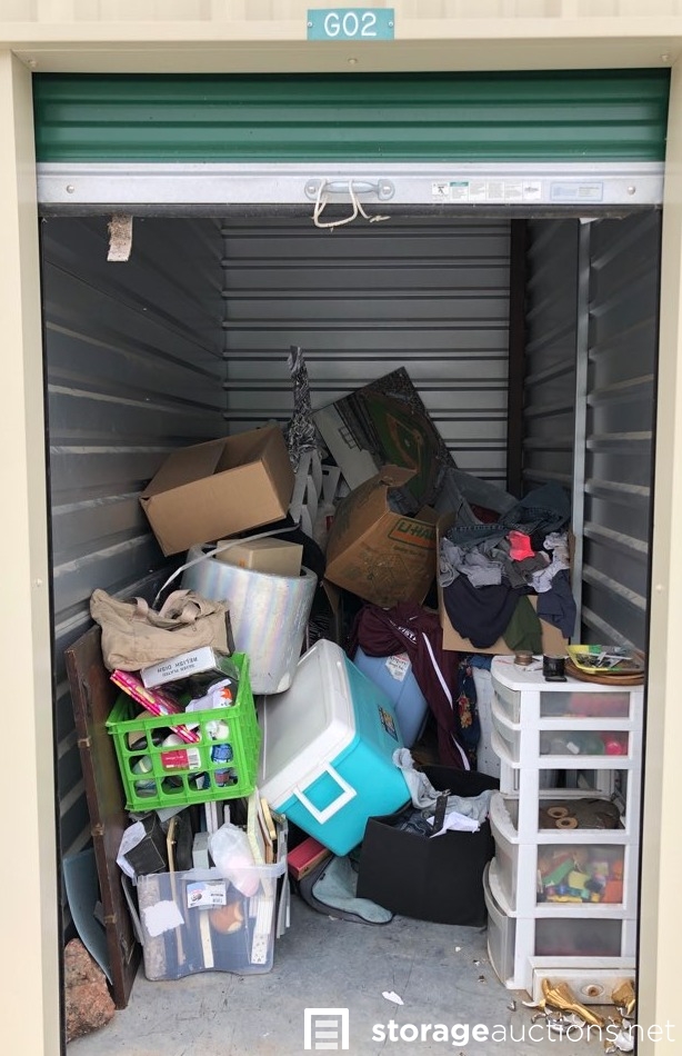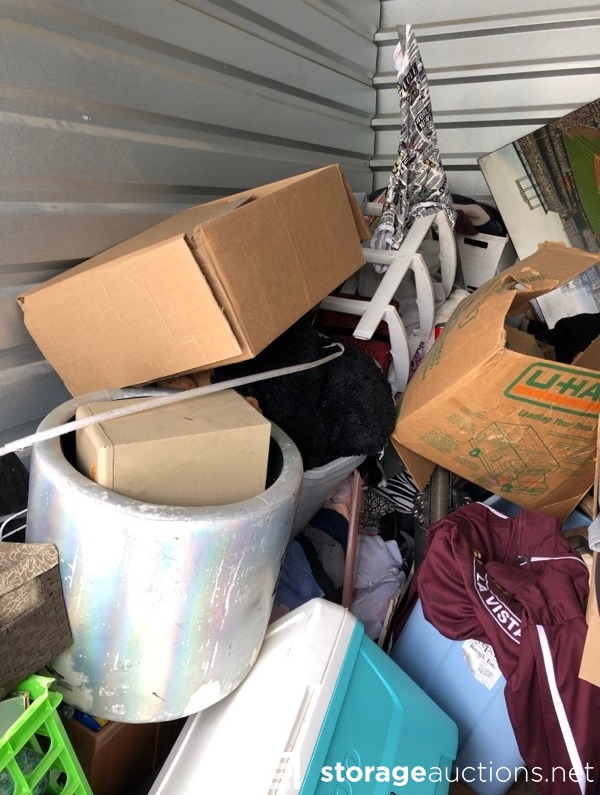 Unit appears to contain: bags, boxes, totes, clothes, cooler, framed art