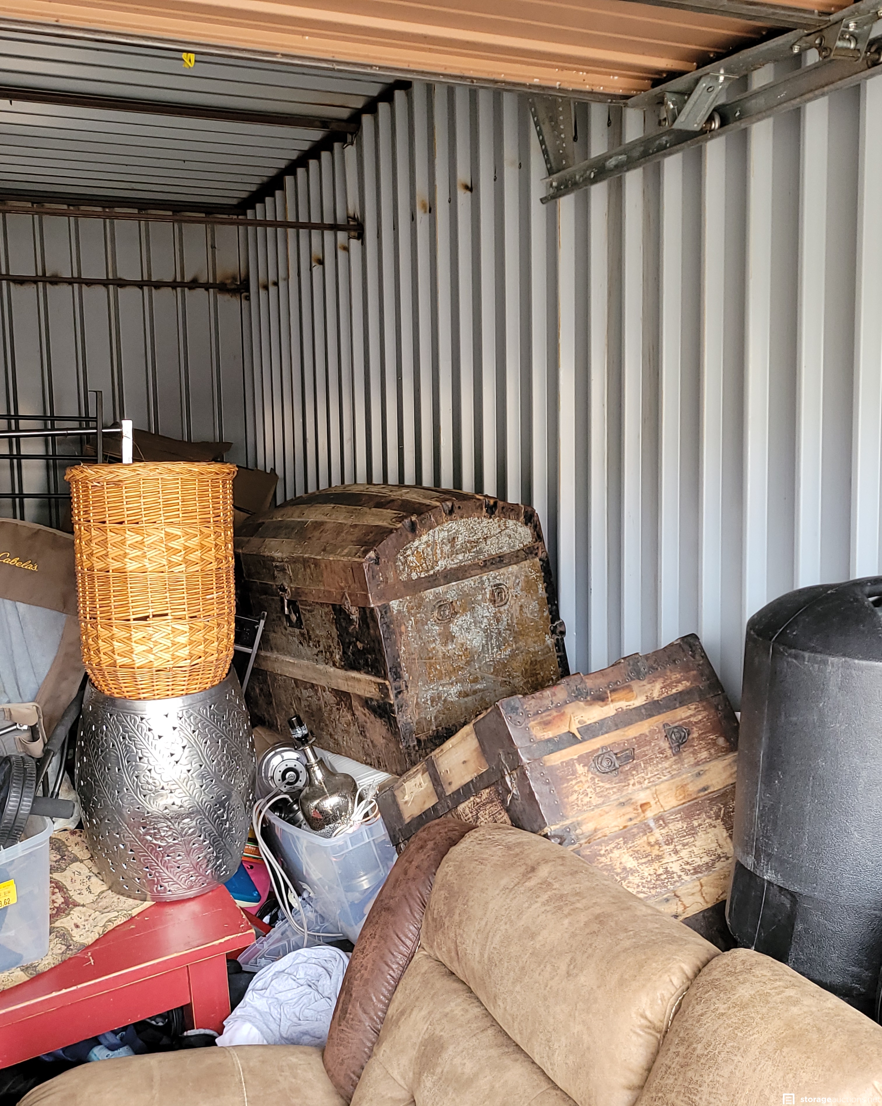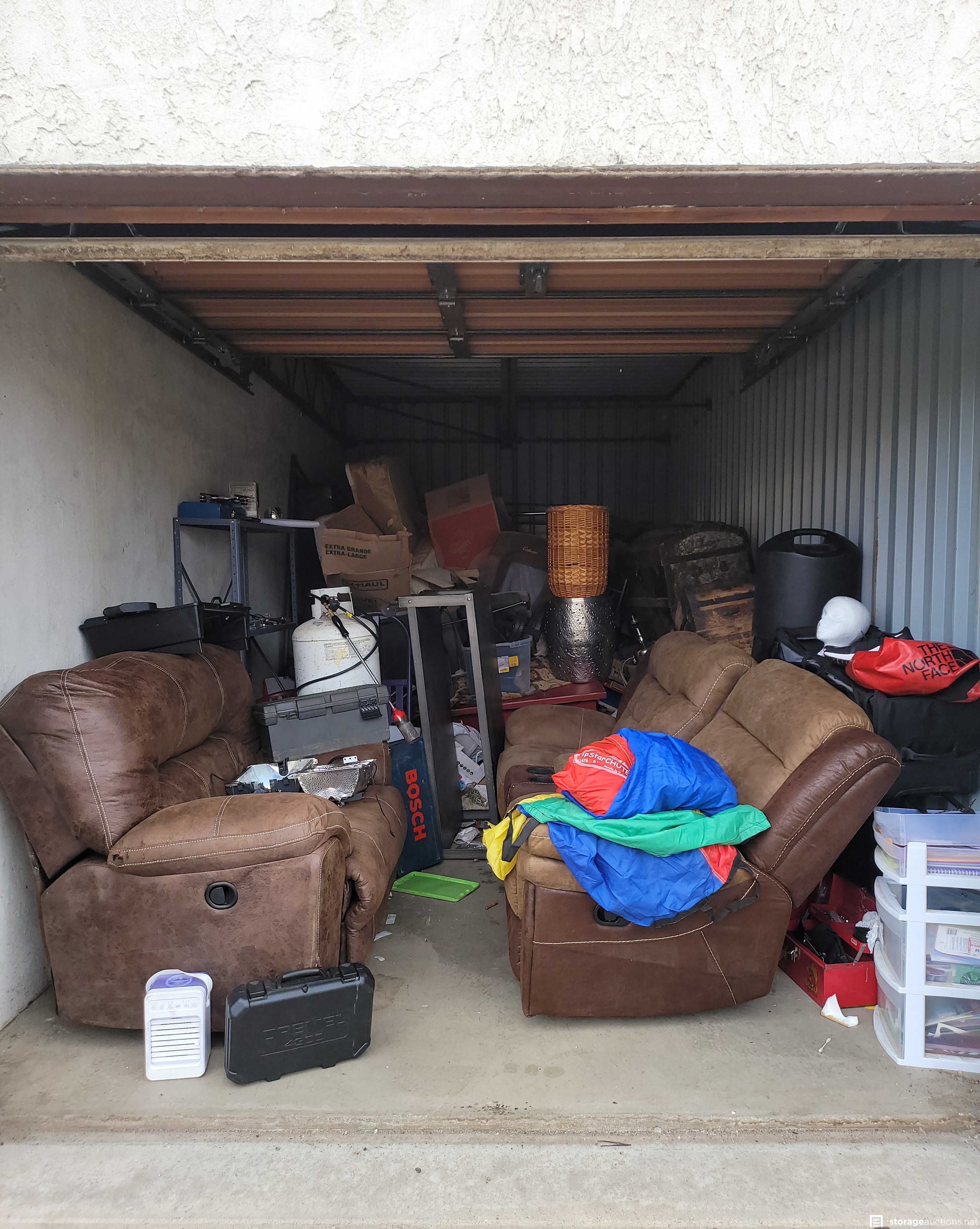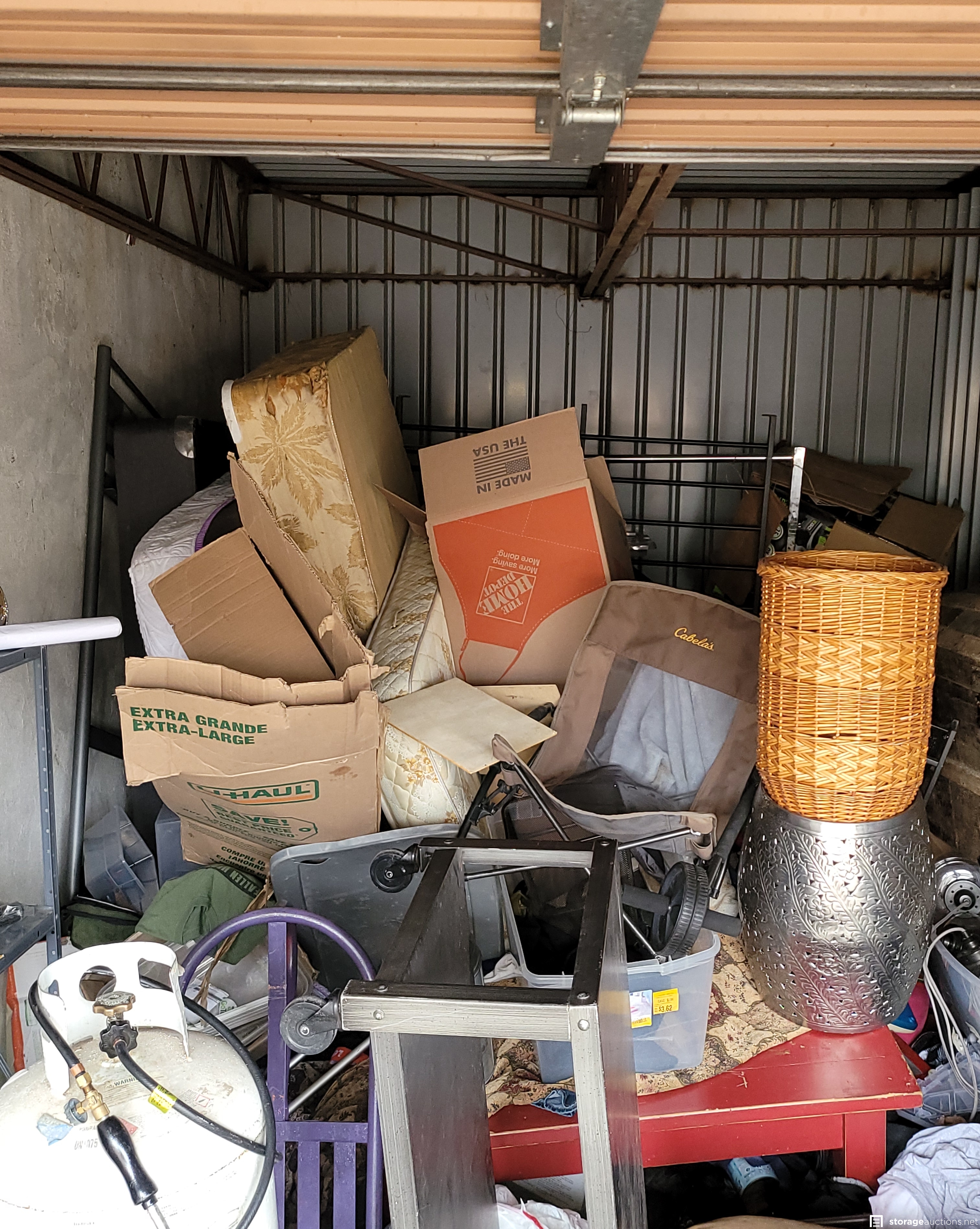 Unit is very full! Household items, furniture, toys, lots of tools, clothes, propane tank with torch.