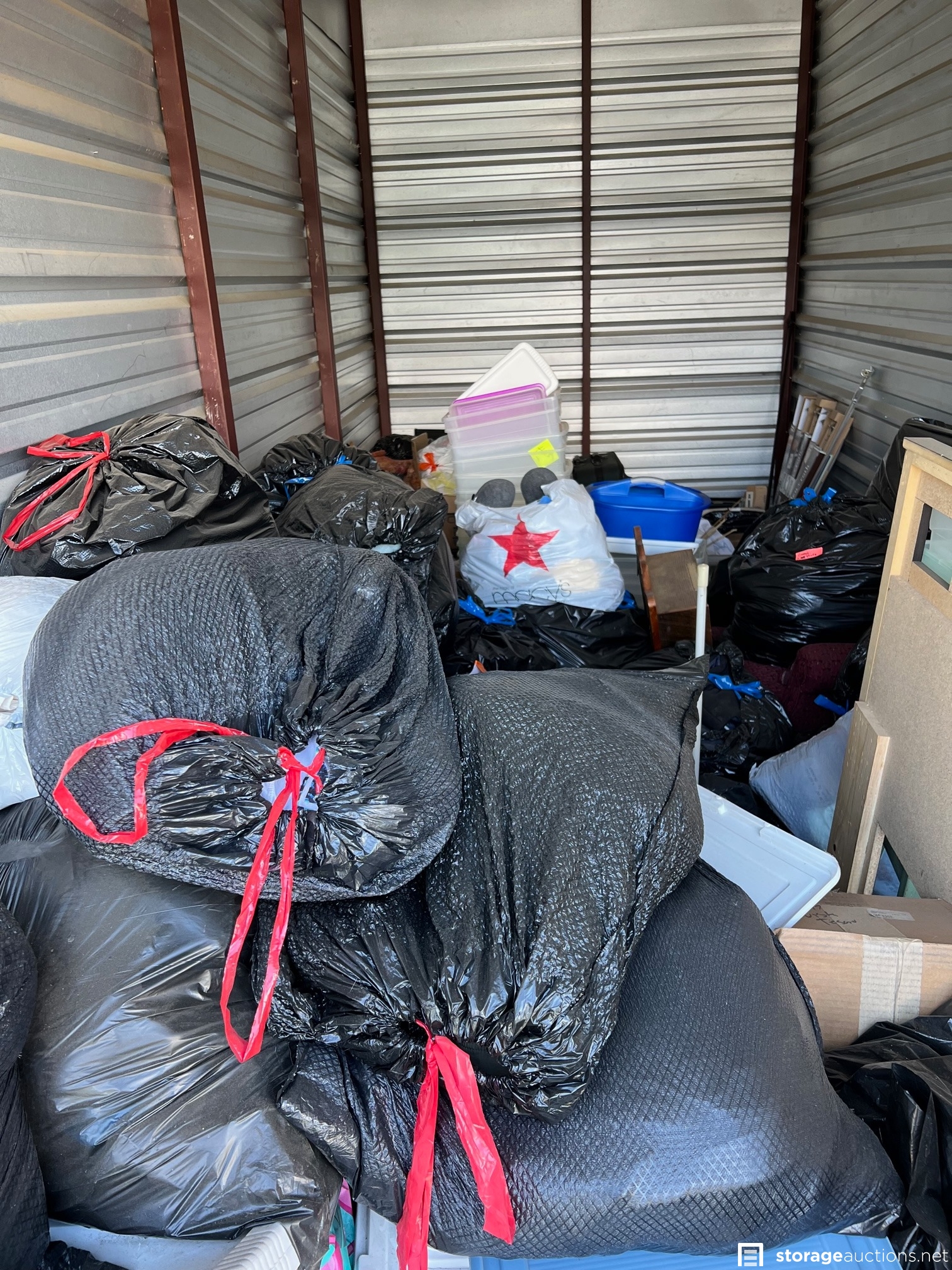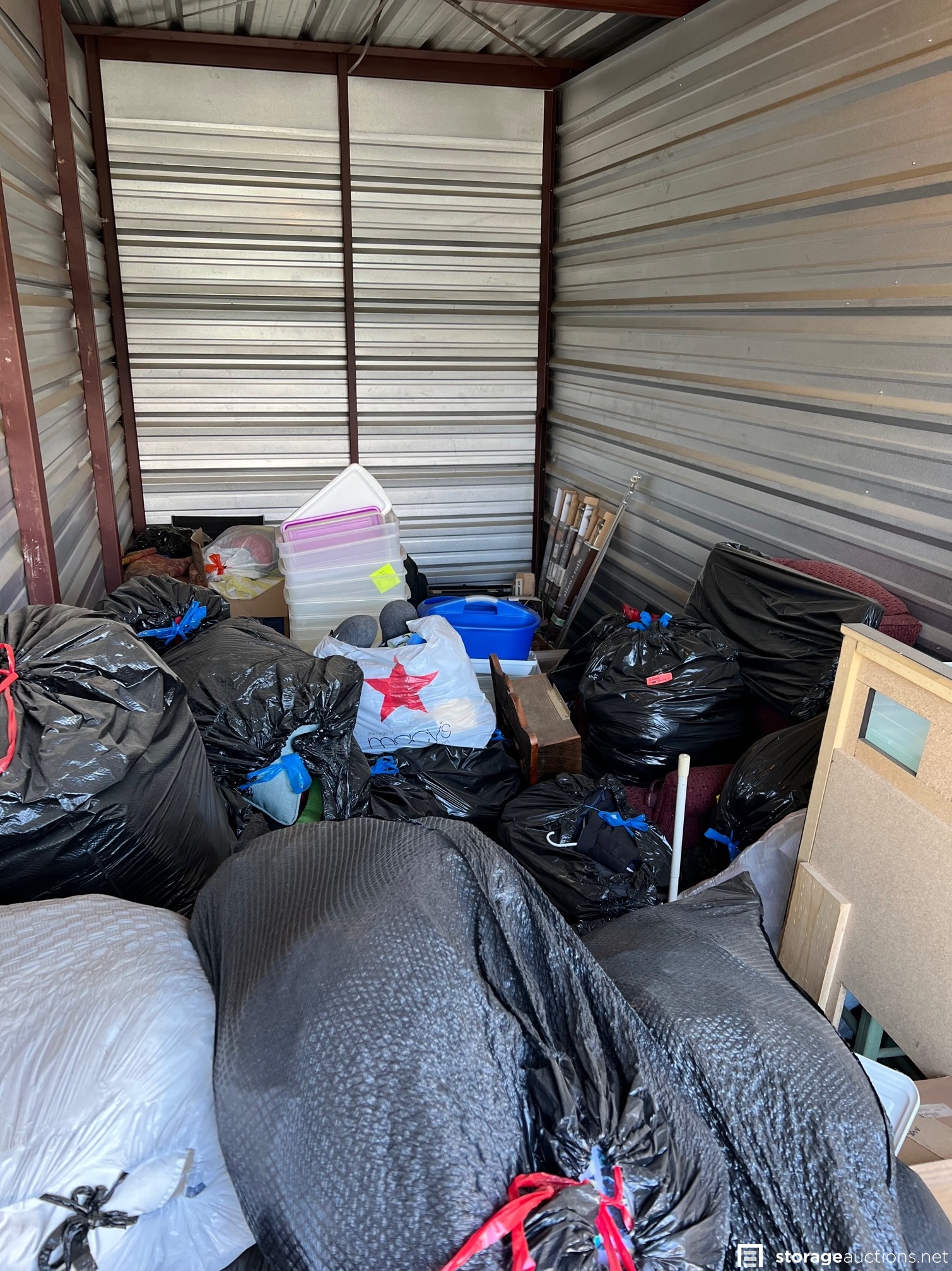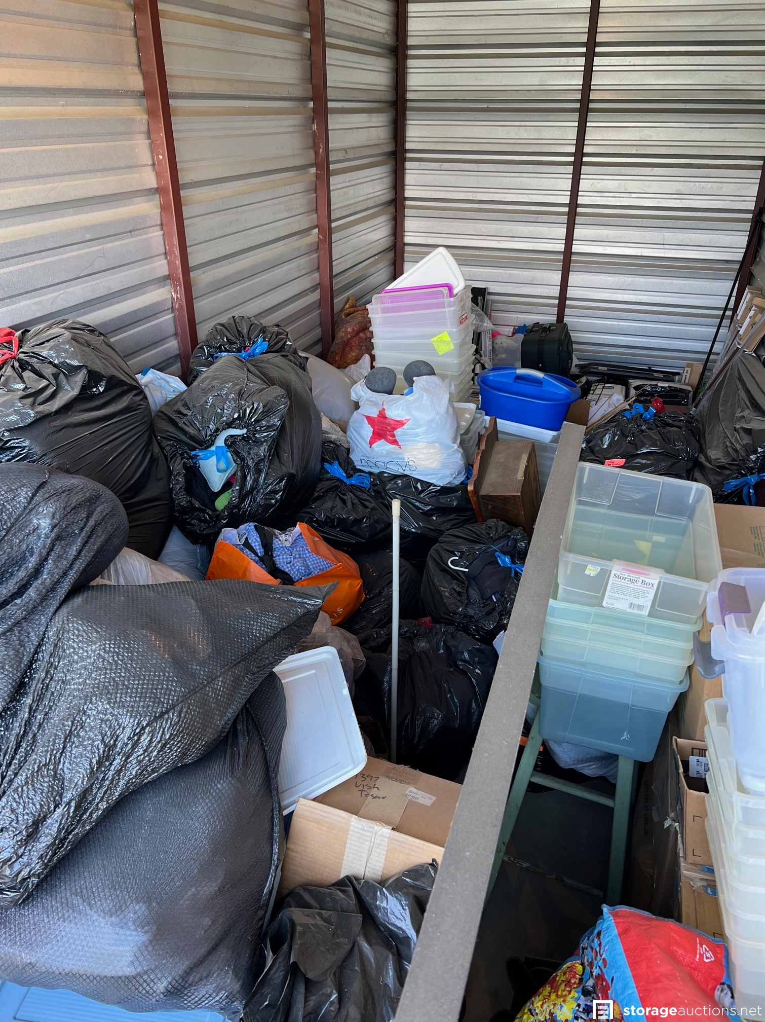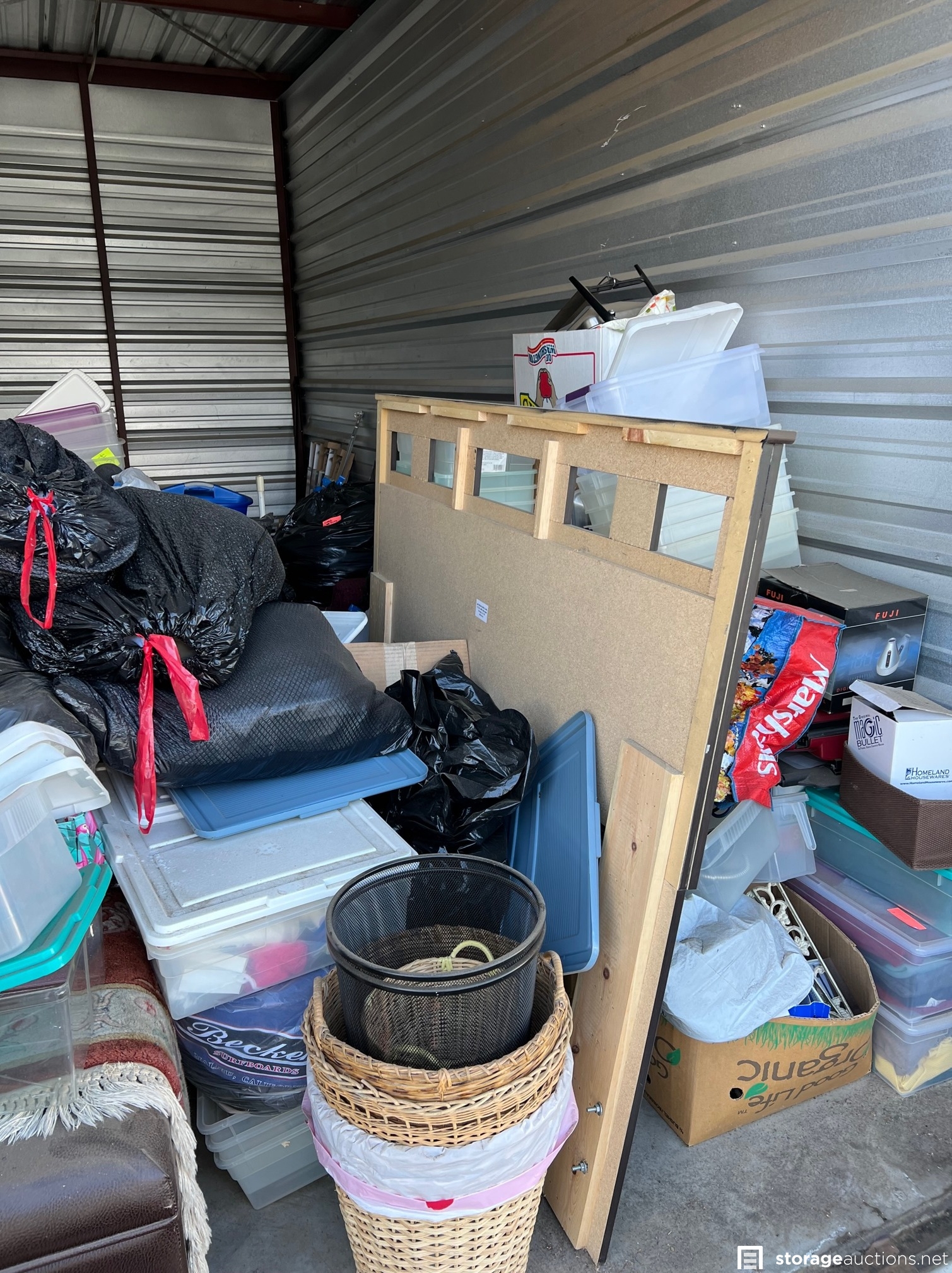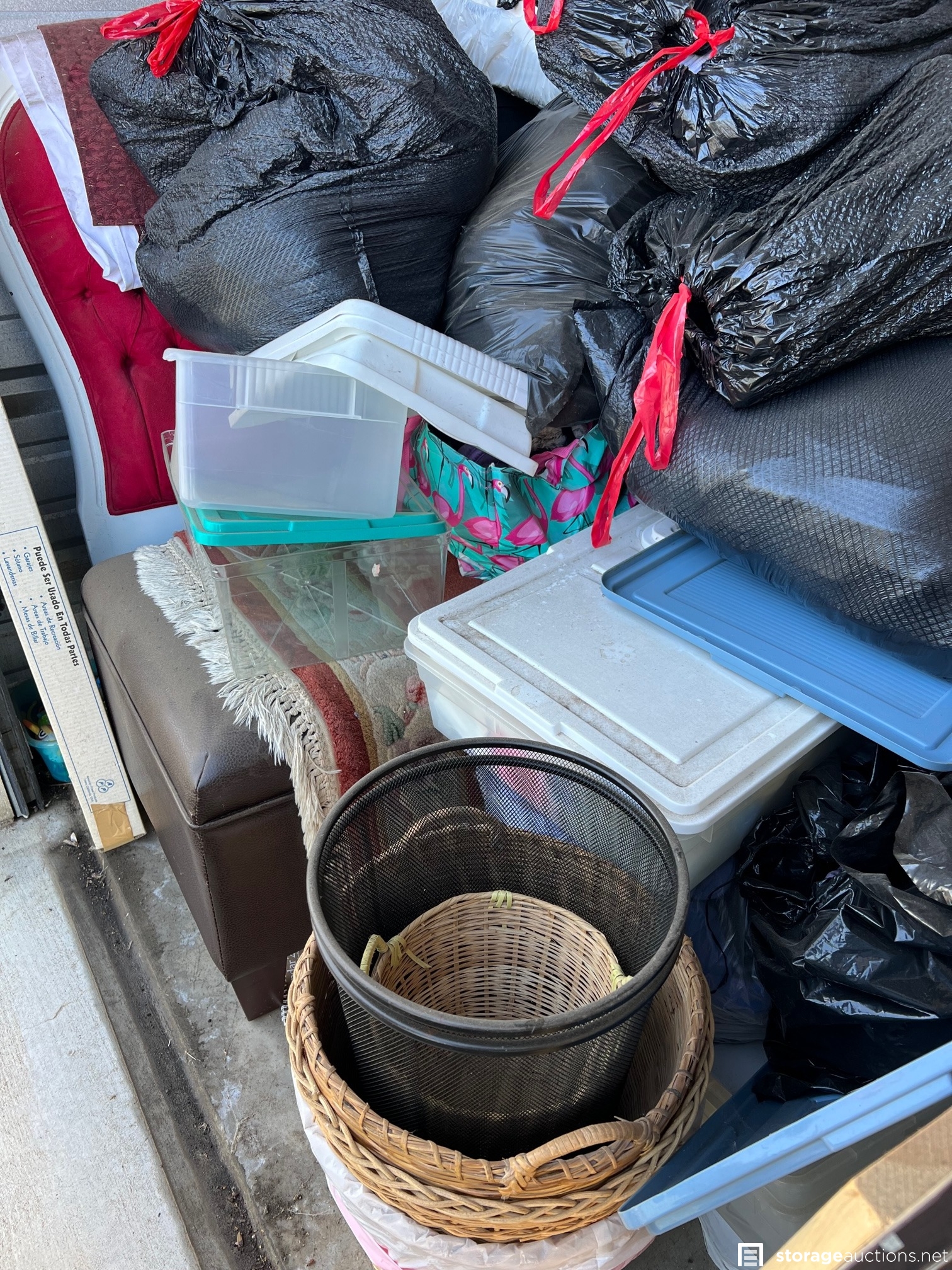 ITEMS APPEAR TO CONSIST OF BUT ARE NOT LIMITED TO: bed frame, headboard, ottoman, luggage, beach chair, baskets, plastic storage boxes, multiple totes with unknown contents, multiple trash bags of unknown contents.
