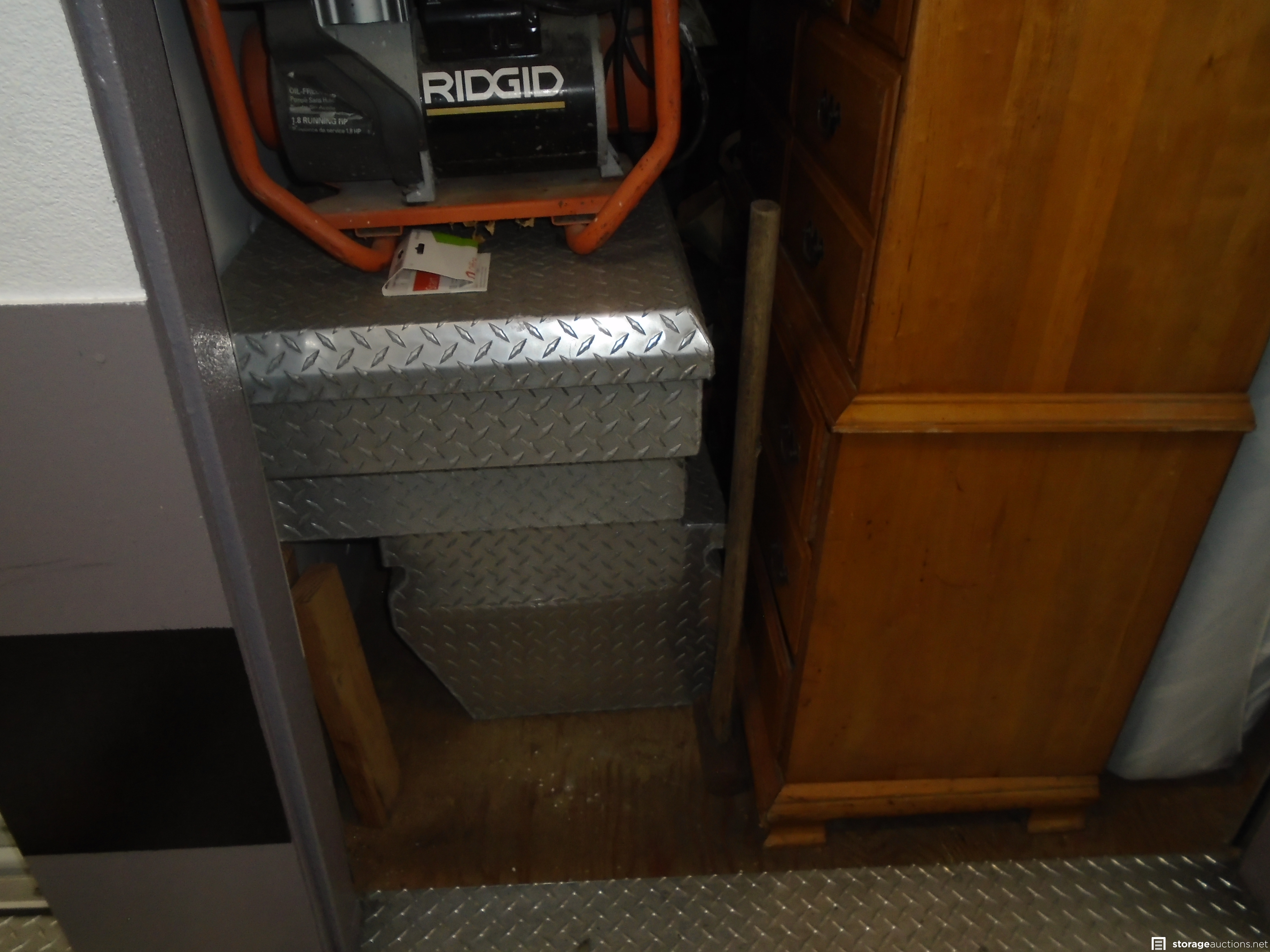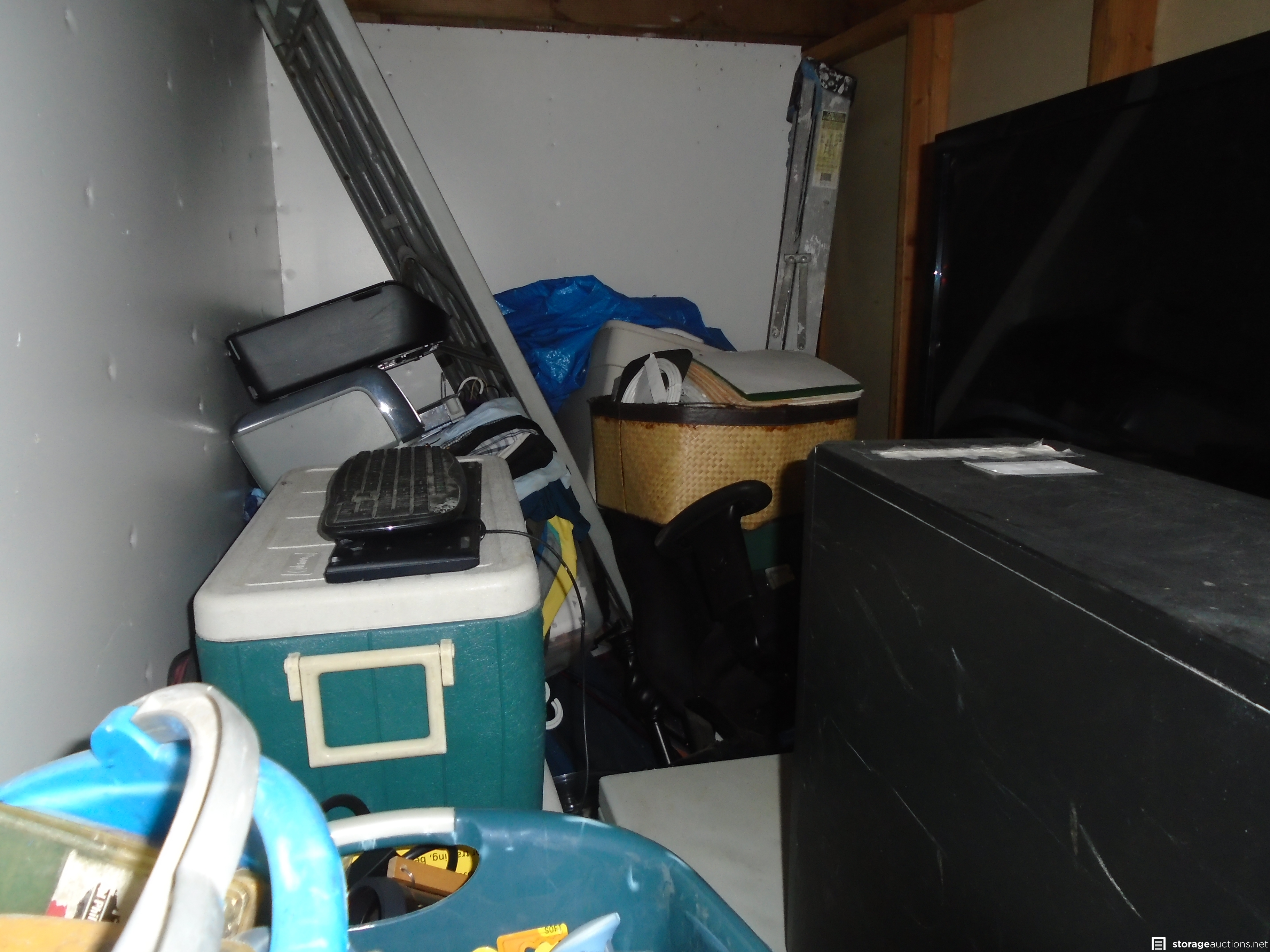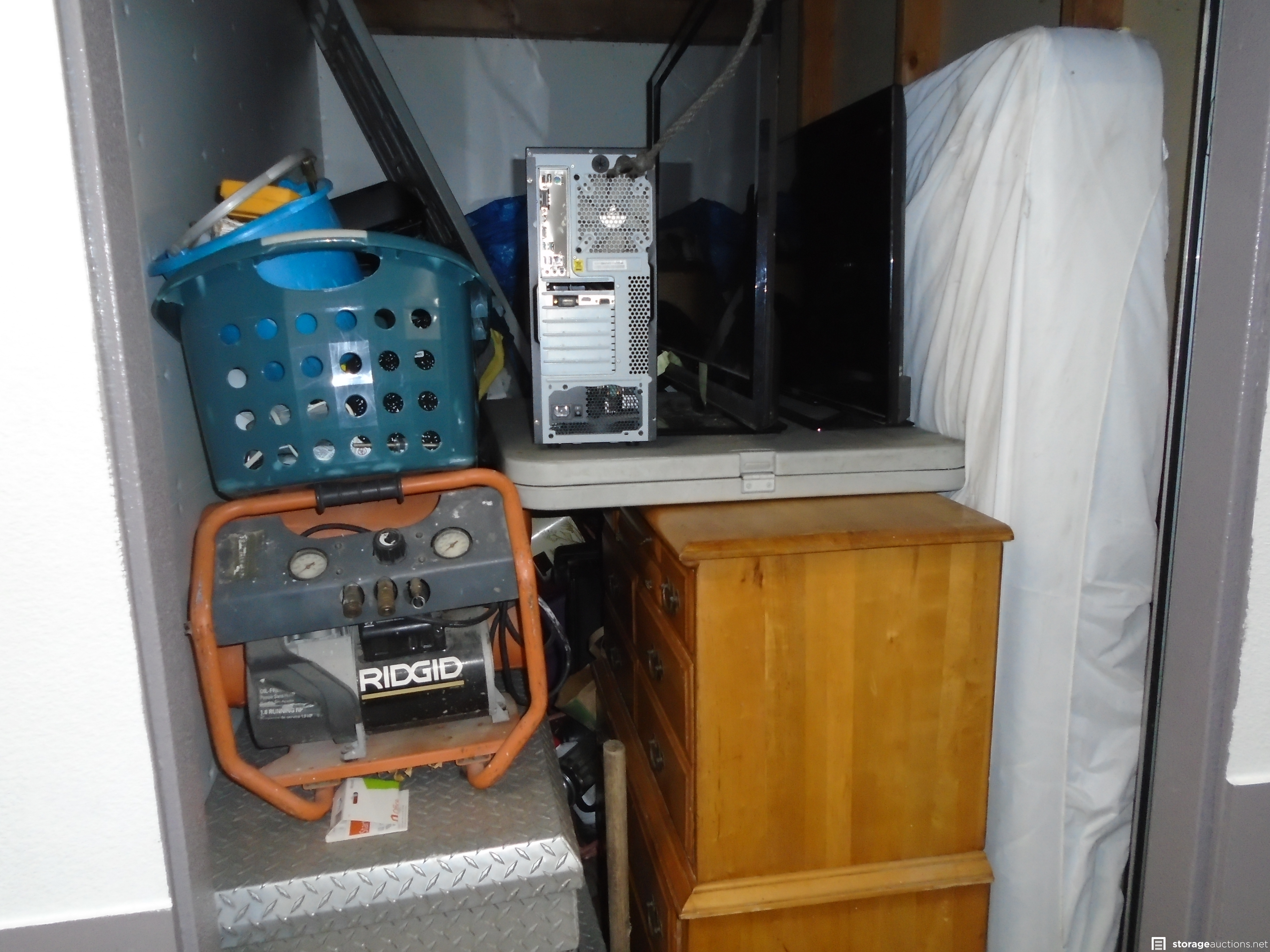Unit appears to have a TV and computer electronics, as well as a truck tool box/cabinet and air compressor, and boxes and totes.