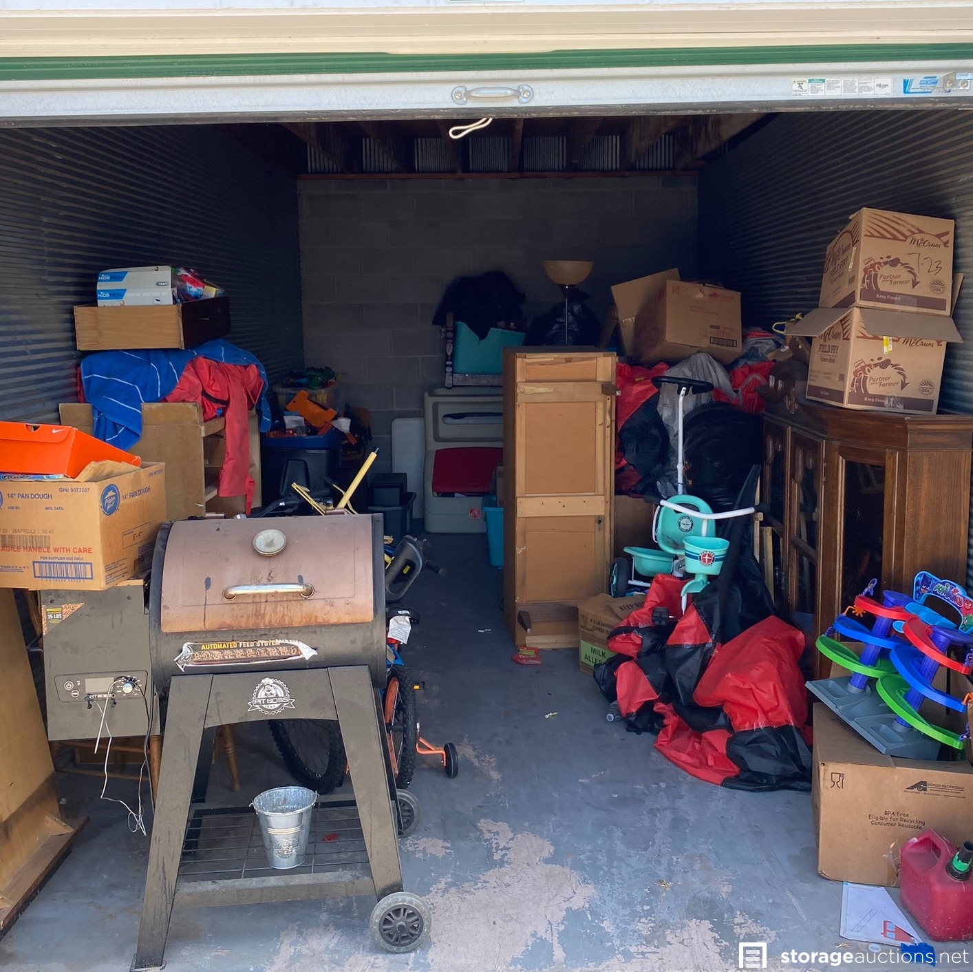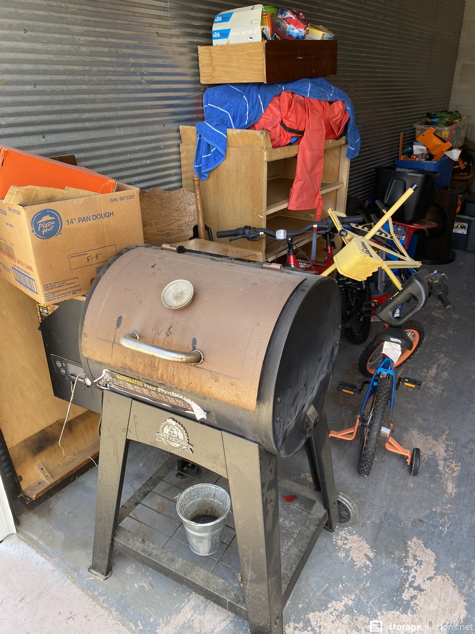 Pit Boss grill, various furniture items, gas can, kids bikes, toys, plastic totes and various household items.
