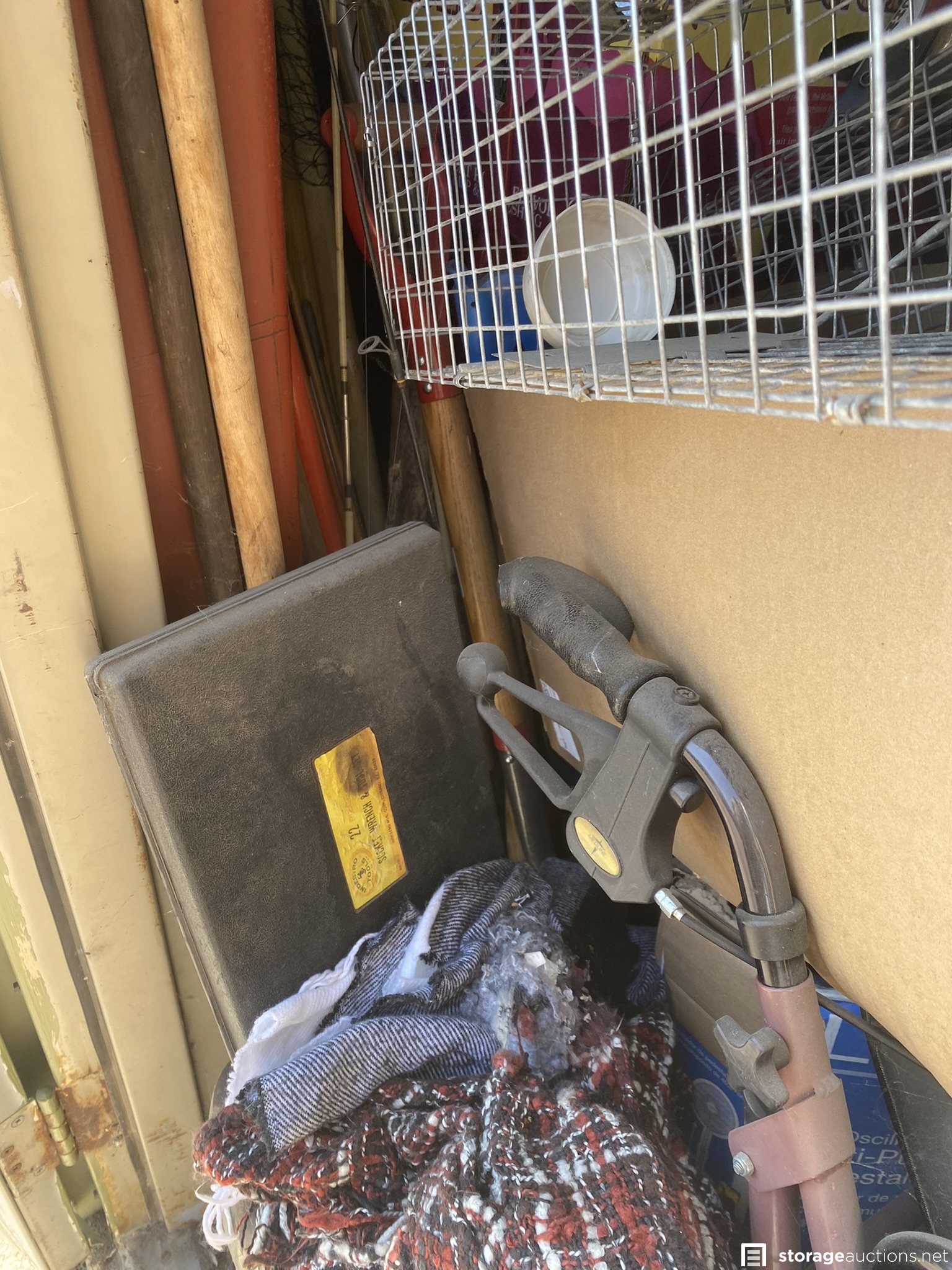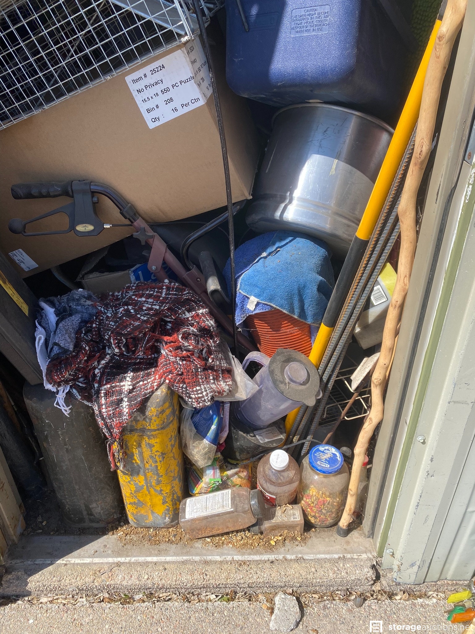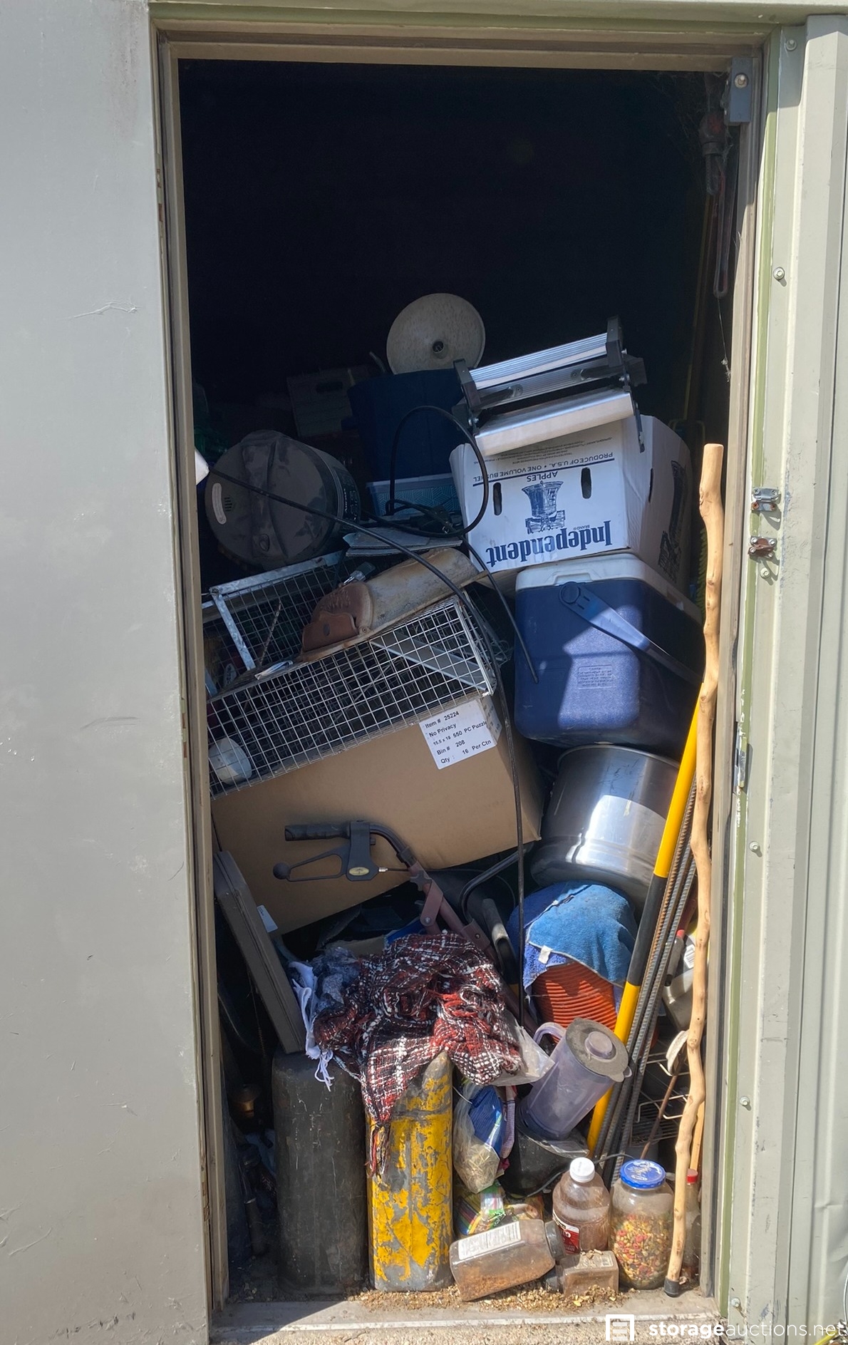 Coolers, ladder, yard tools, bolt cutters and other tools, small animal traps, plastic totes, and various household goods.