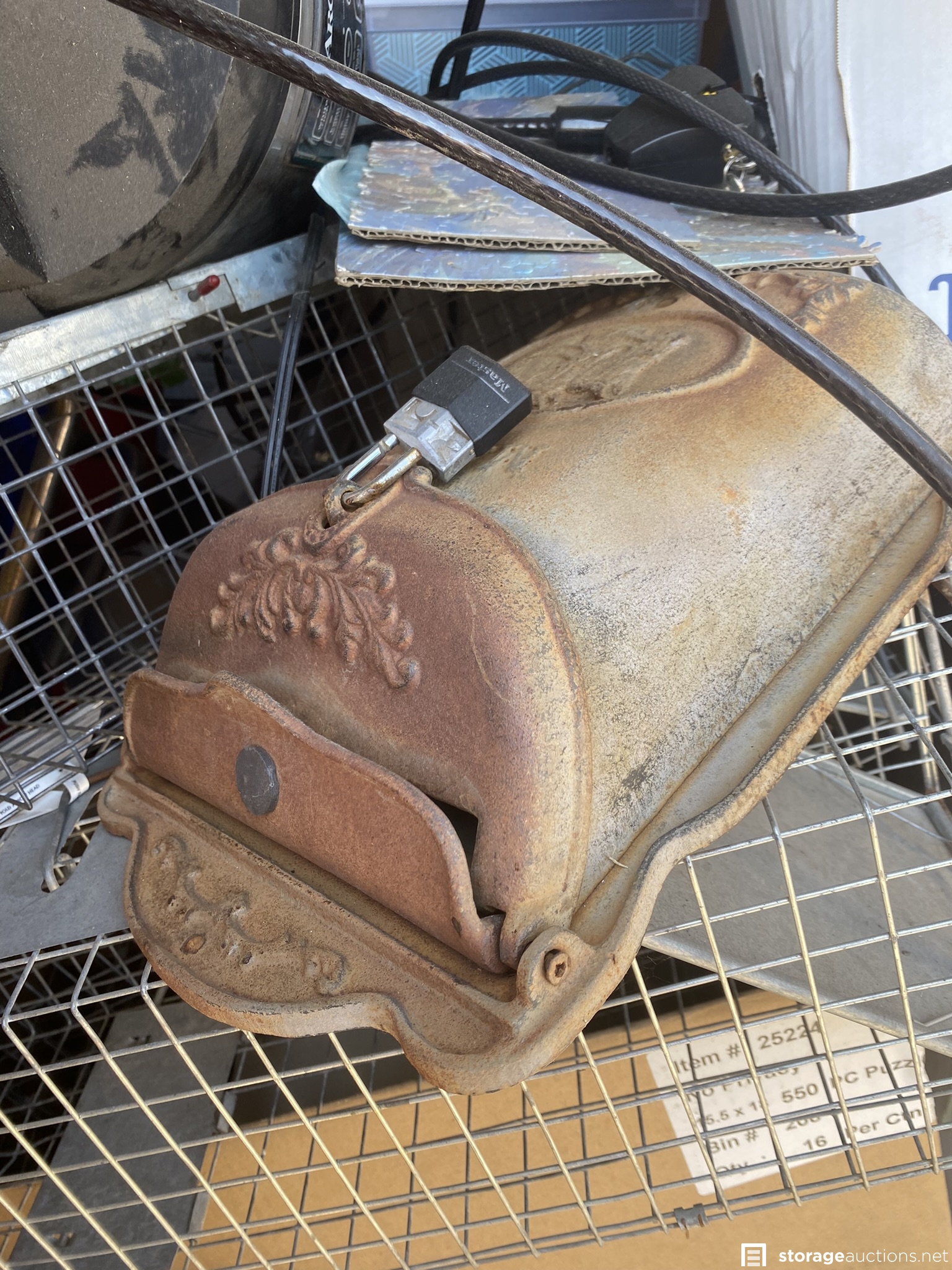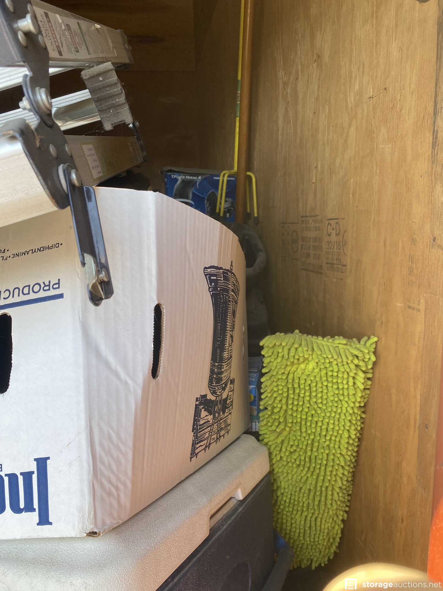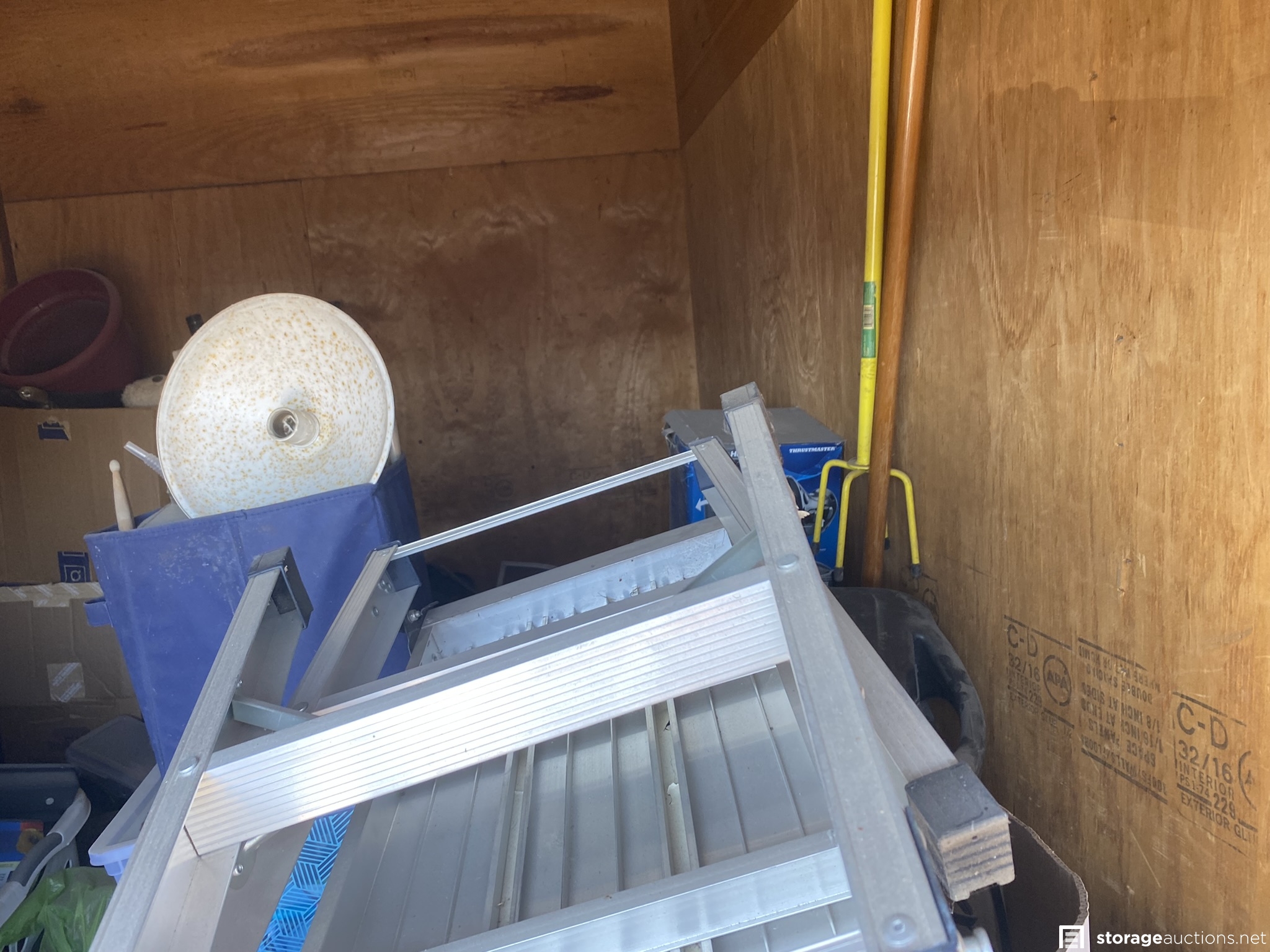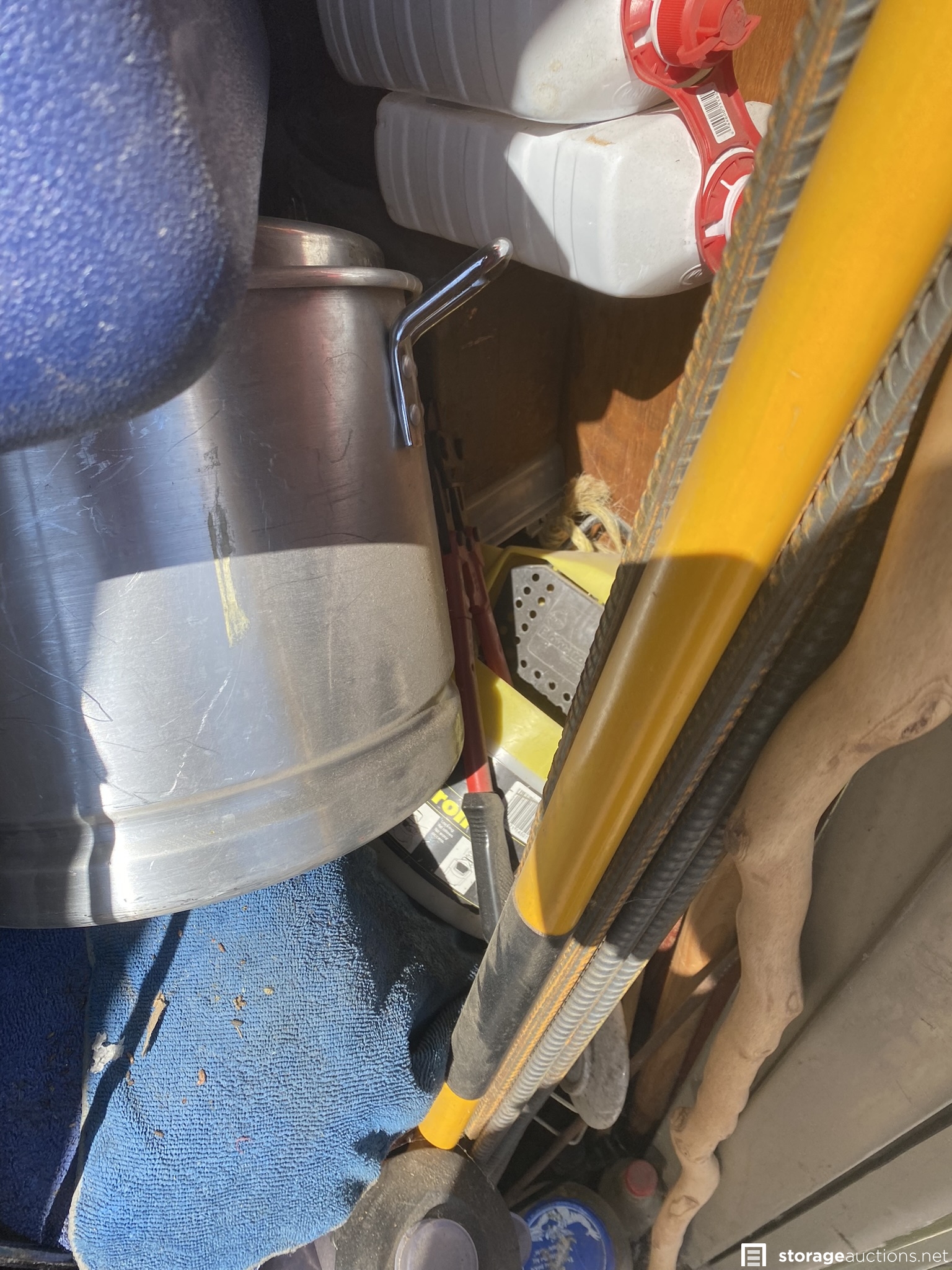 Coolers, ladder, yard tools, bolt cutters and other tools, small animal traps, plastic totes, and various household goods.