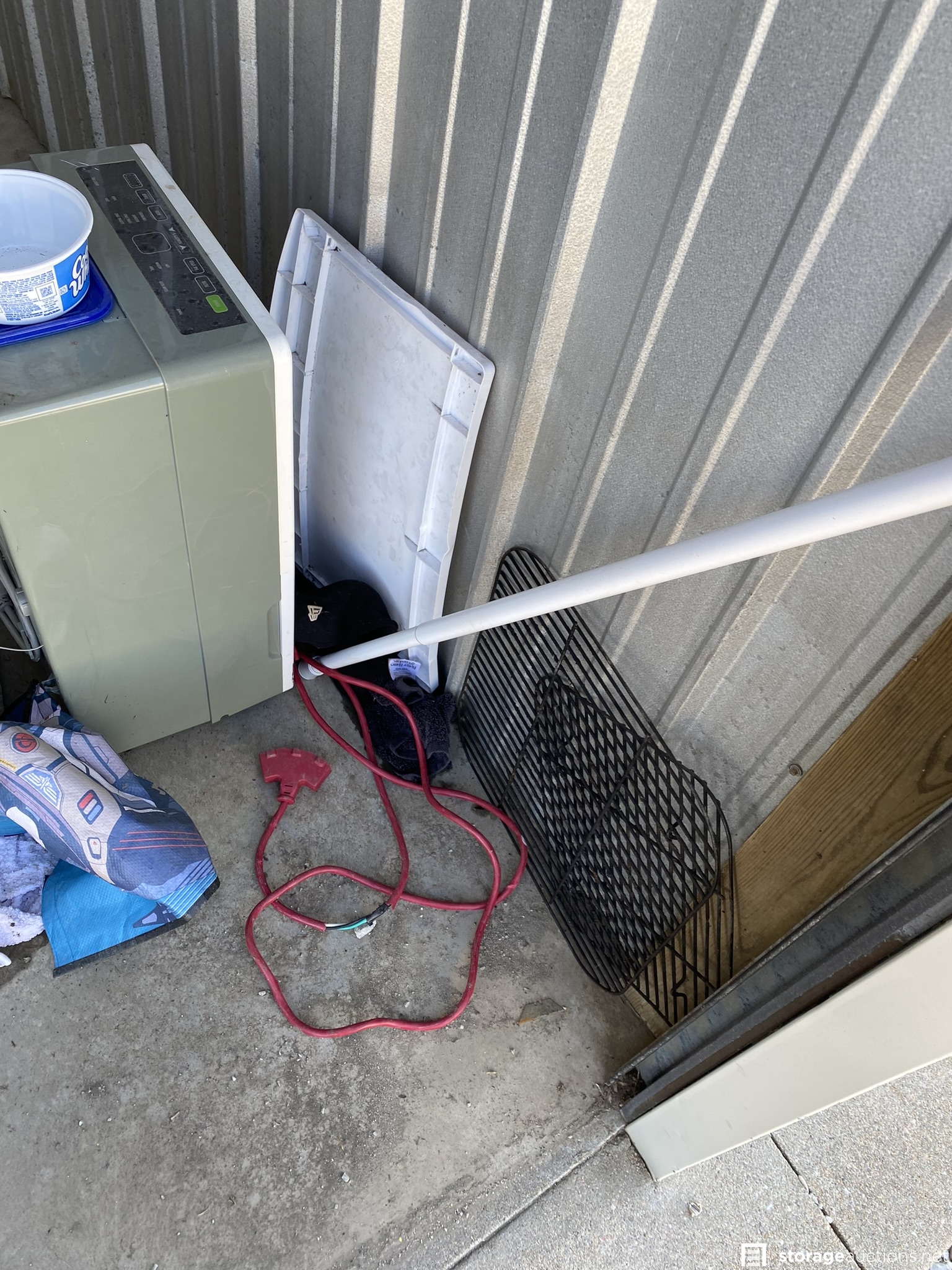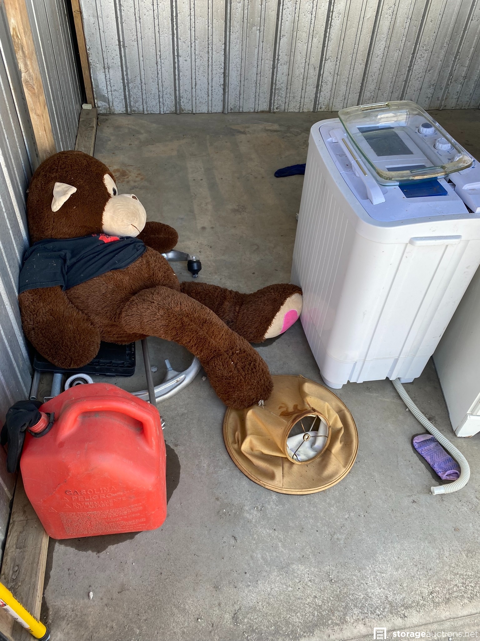 Apartment size washing machine, dresser, gas can, big monkey, extension cord, what looks like a portable AC unit or dehumidifier.