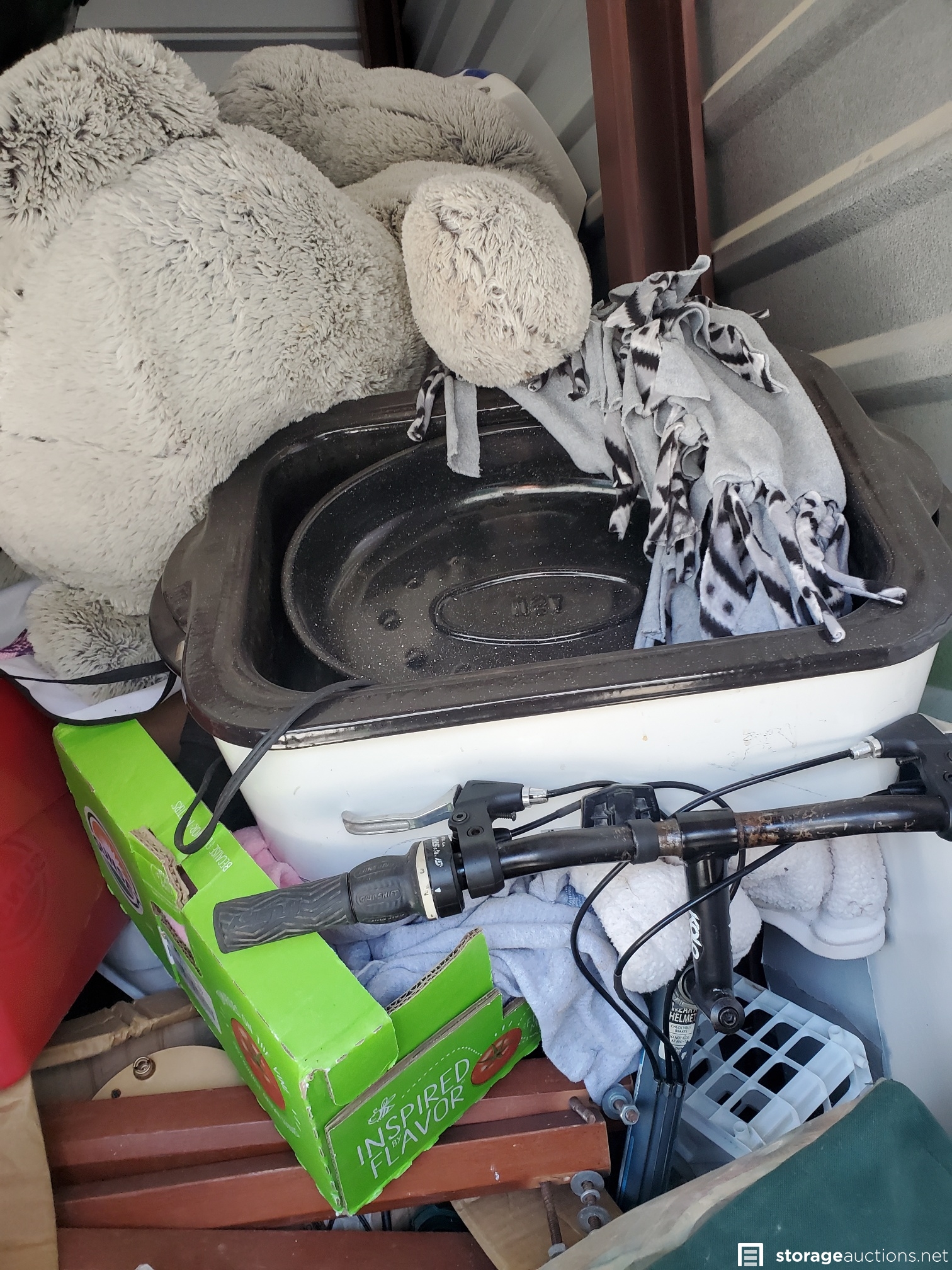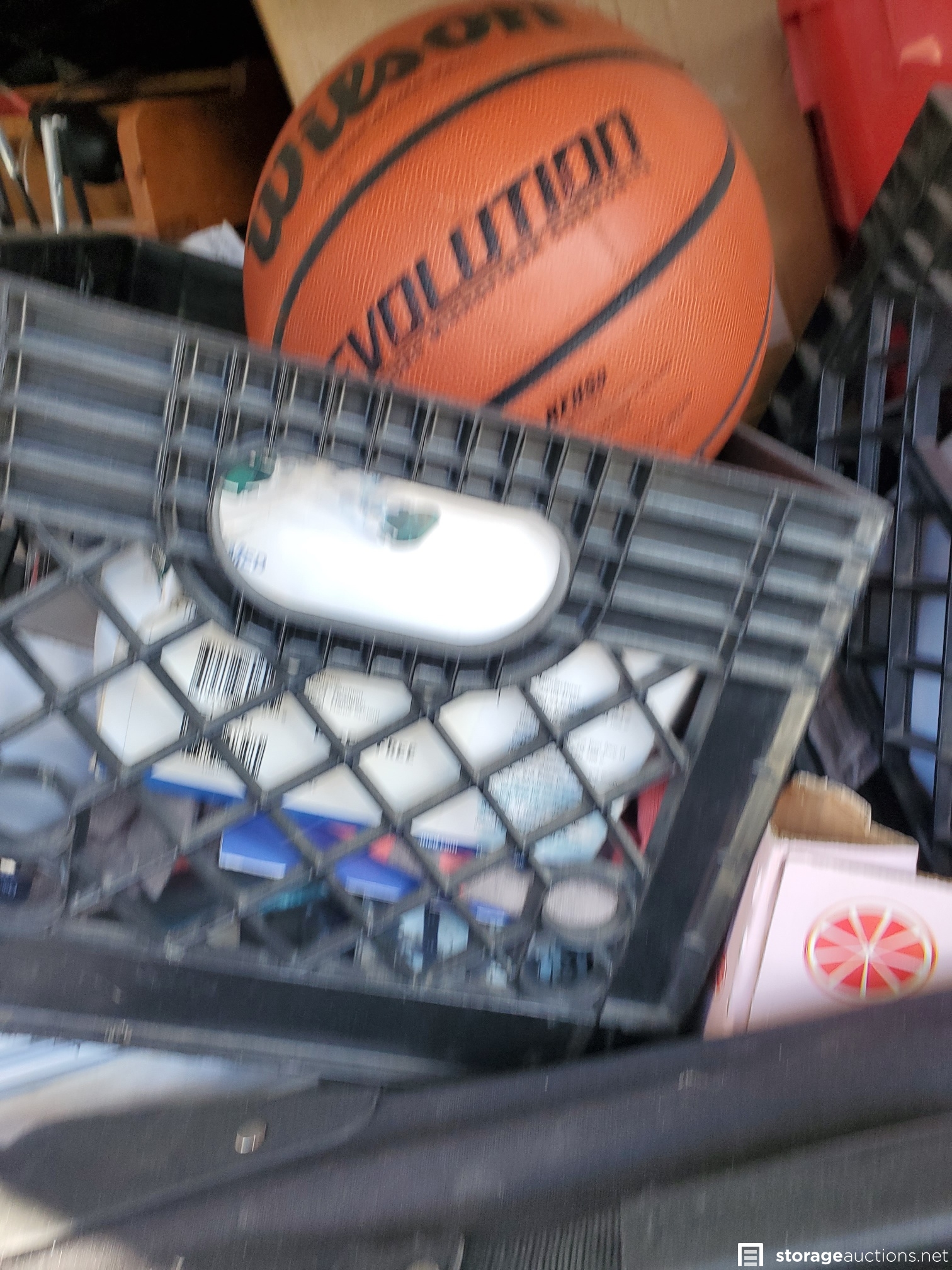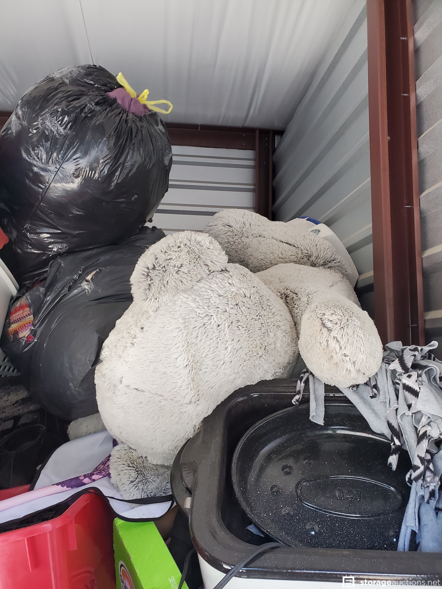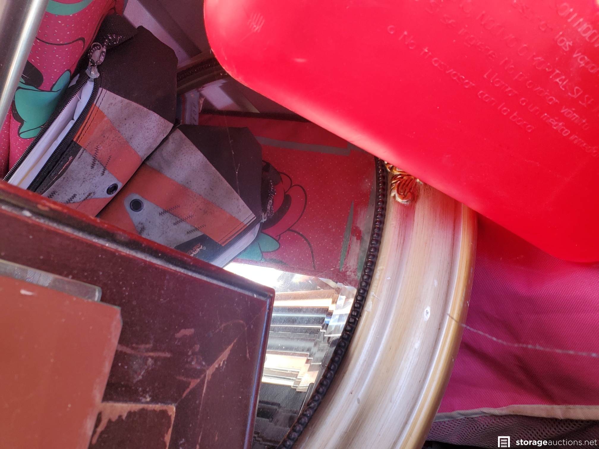 Vacuum, basketball, luggage, Kolo bike, 2 roasting pans, huge teddy bear, cot, crutches, mirror, many VHS tapes, eagle picture, boxes and bags, table,